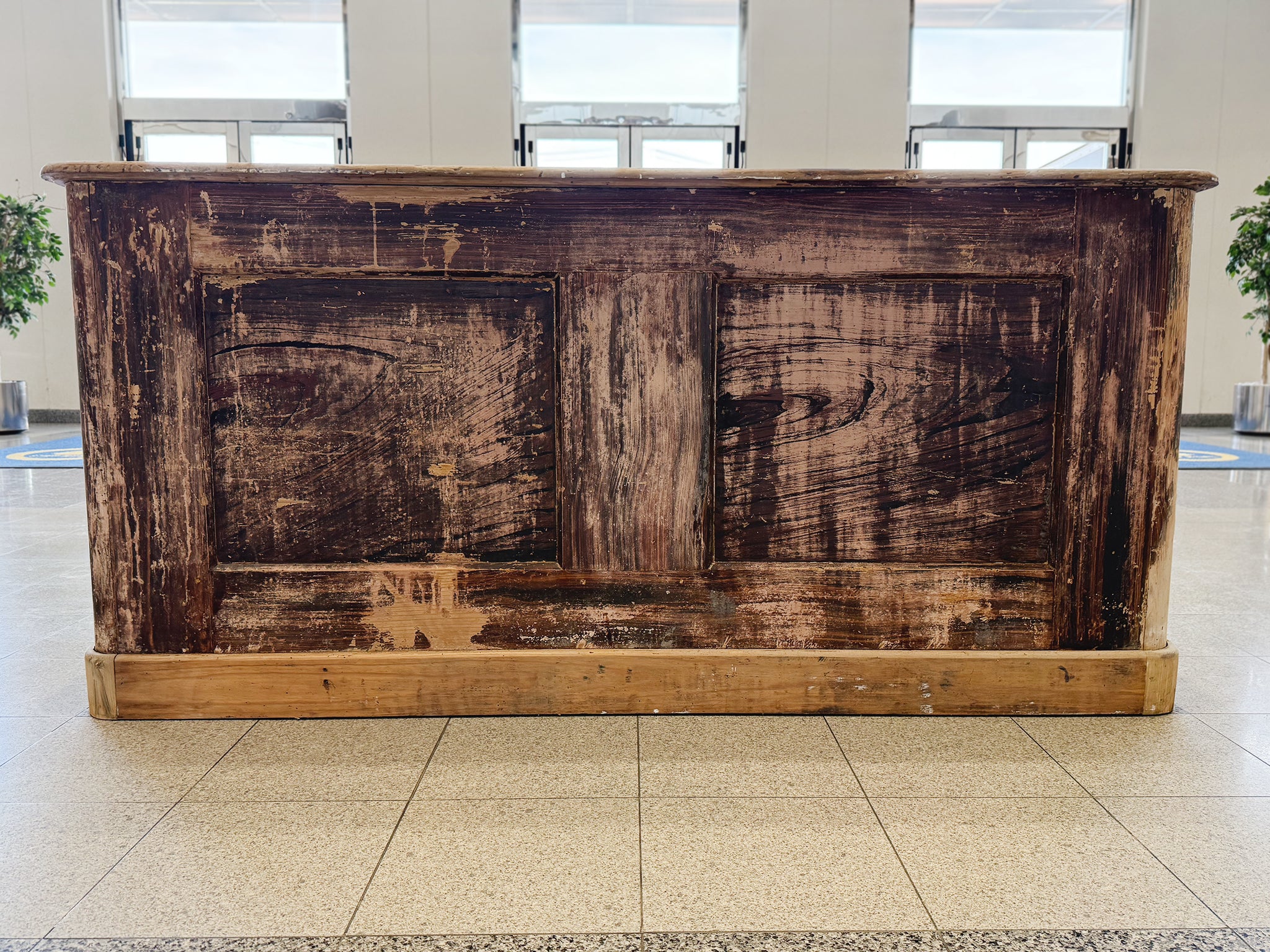 In overall good condition and structurally sound. General surface wear, like scratches and dents to the wood, all consistent with the credenza's age and use. The distressed look adds to the value, style, and character of the credenza.