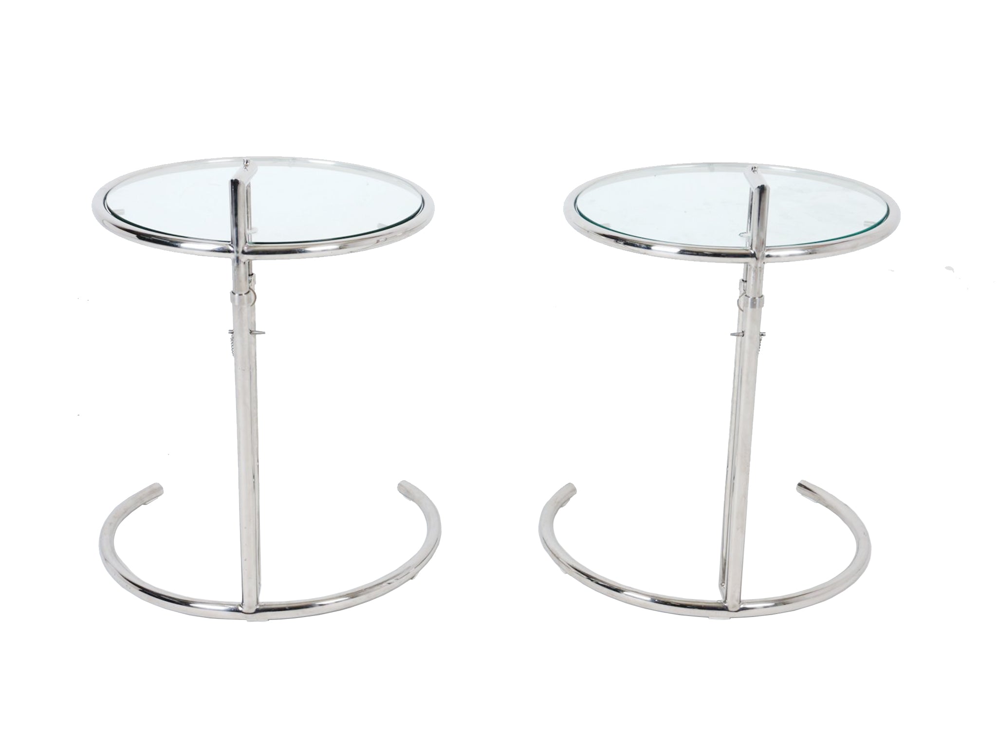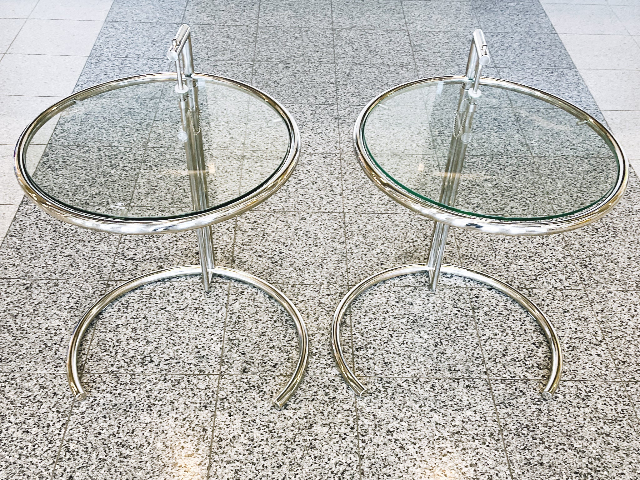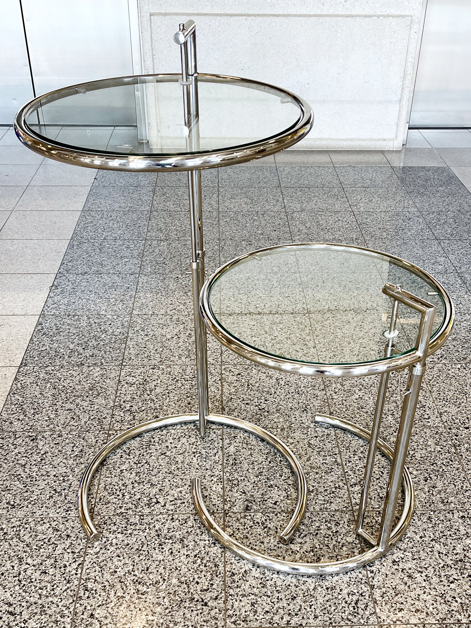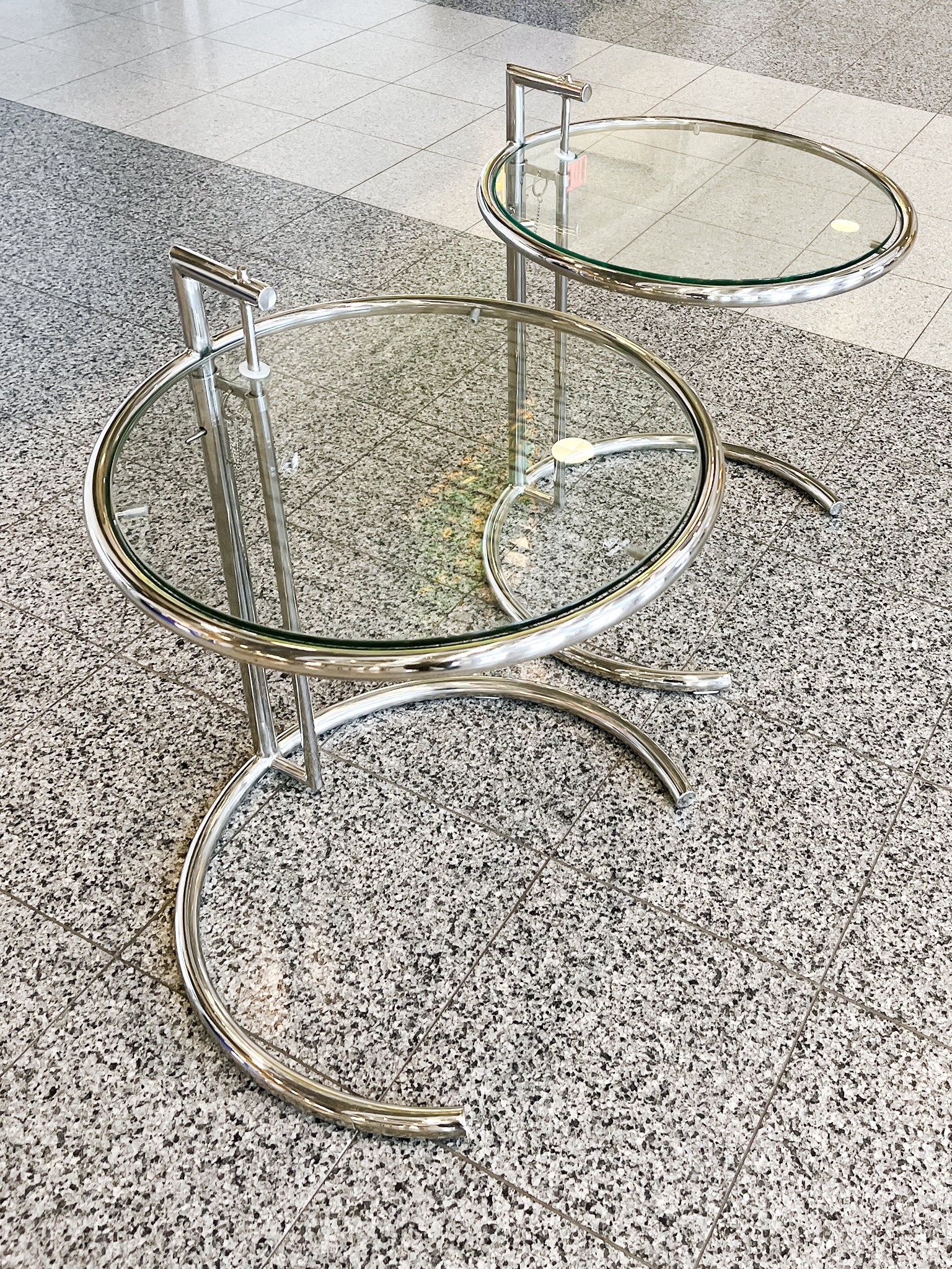 Designed in the style of Eileen Gray's iconic tables of the 1920s, these side tables are adjustable in height. They consist of tubular chrome steel frames and round glass tops. The overall design gives the tables a sense of lightness and openness, and a versatility in form that's truly innovative and modern.