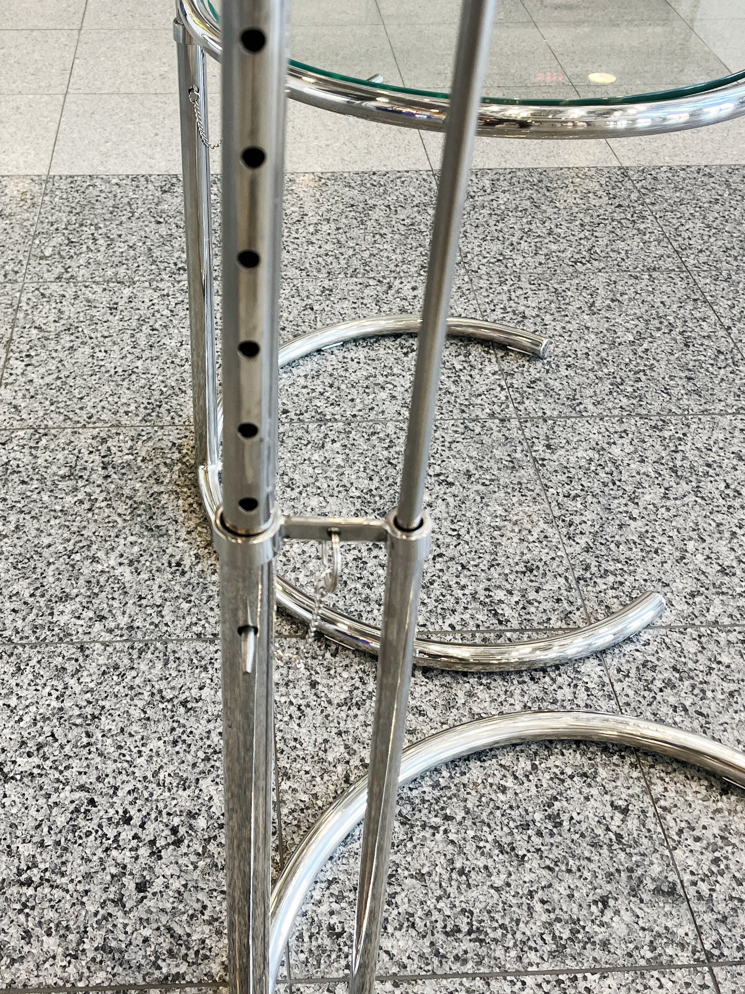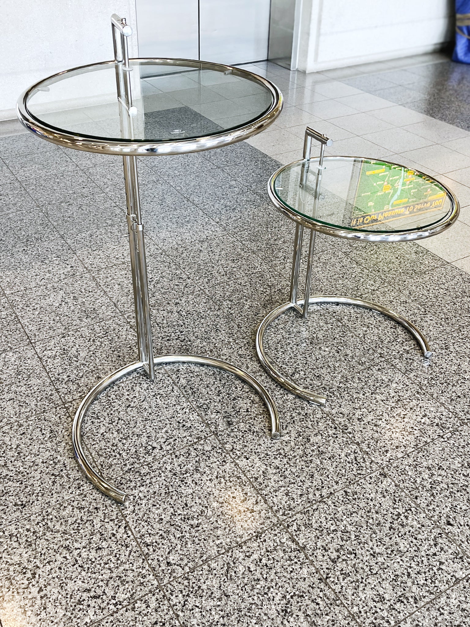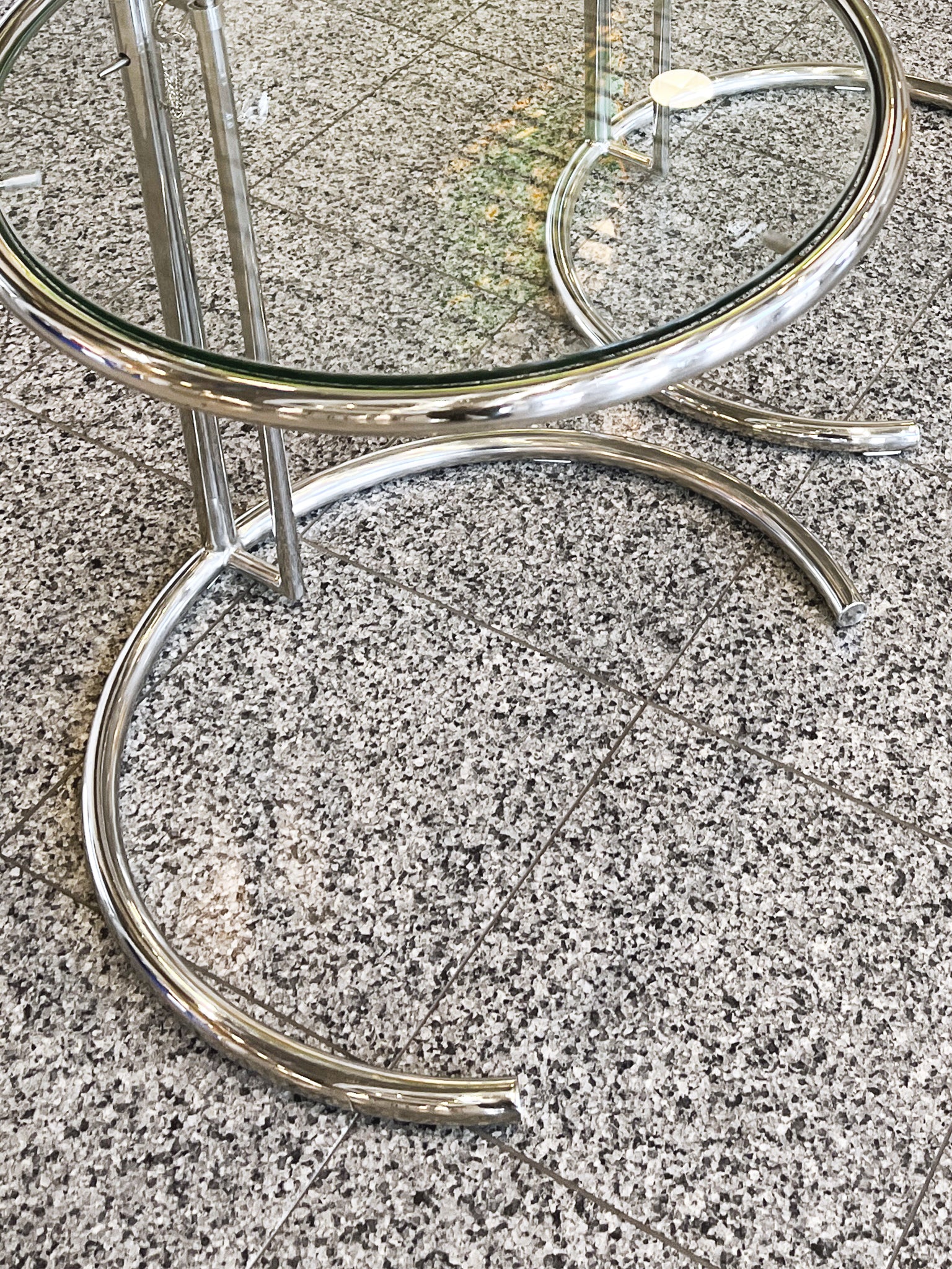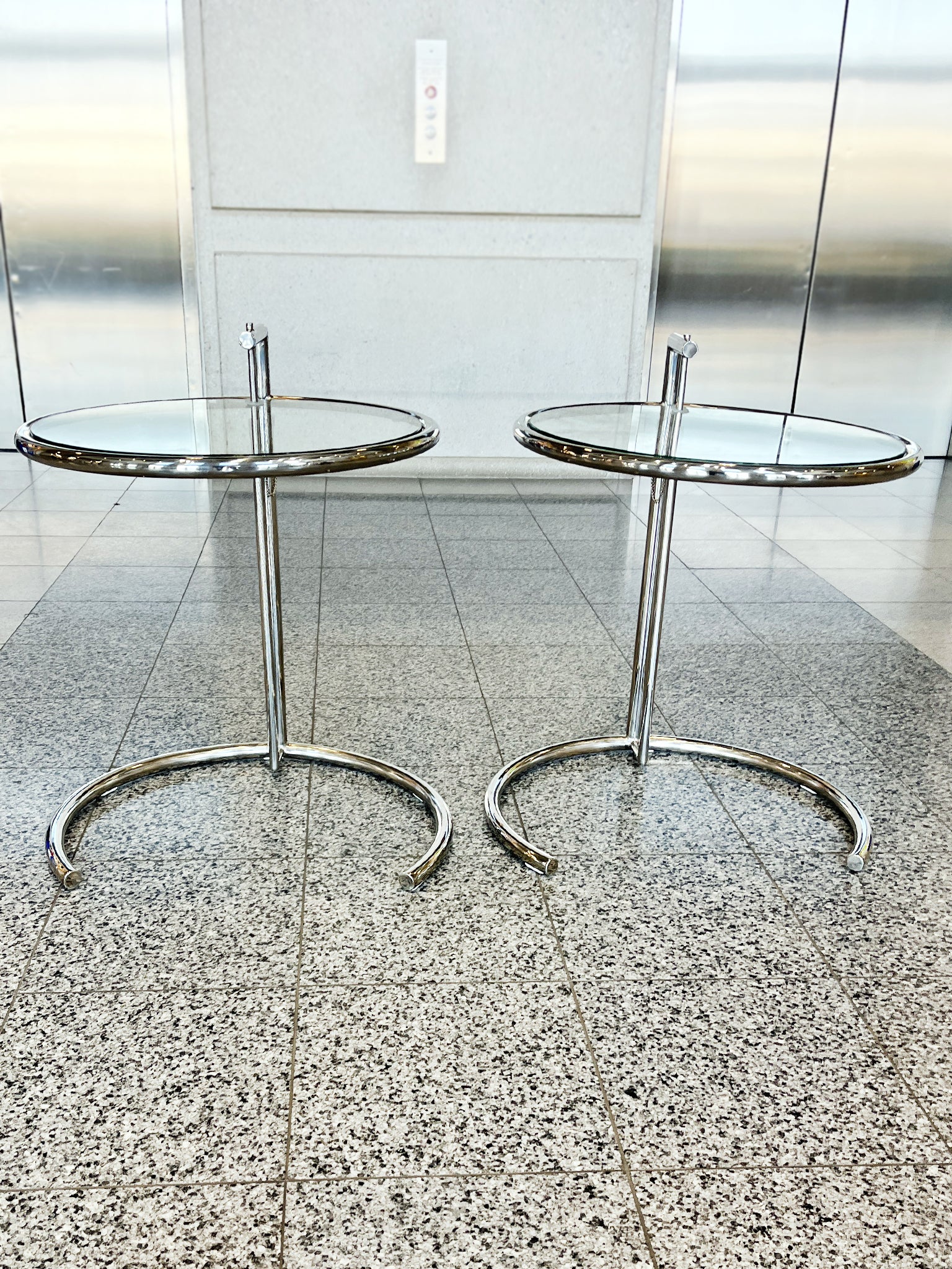 Designed in the style of Eileen Gray's iconic tables of the 1920s, these side tables are adjustable in height. They consist of tubular chrome steel frames and round glass tops. The overall design gives the tables a sense of lightness and openness, and a versatility in form that's truly innovative and modern.