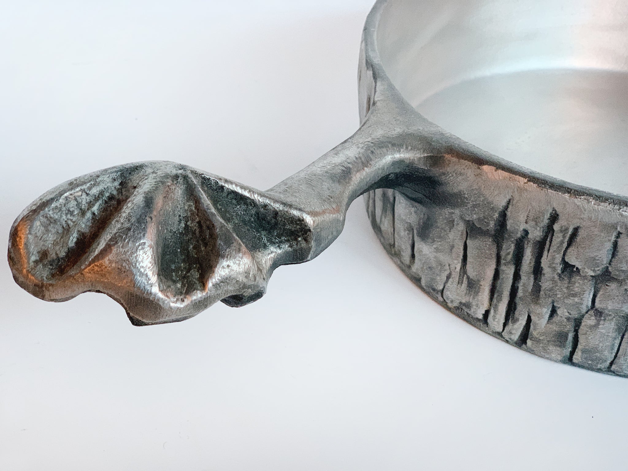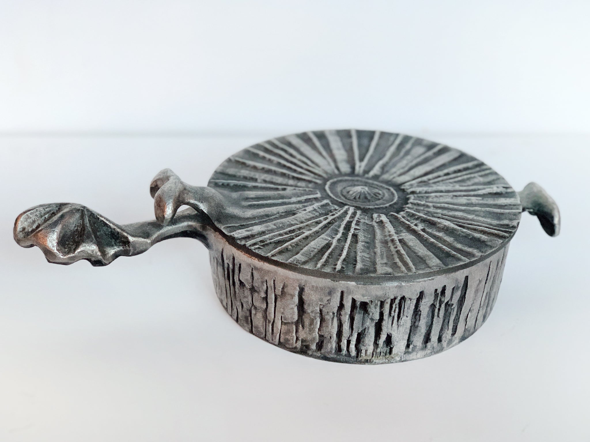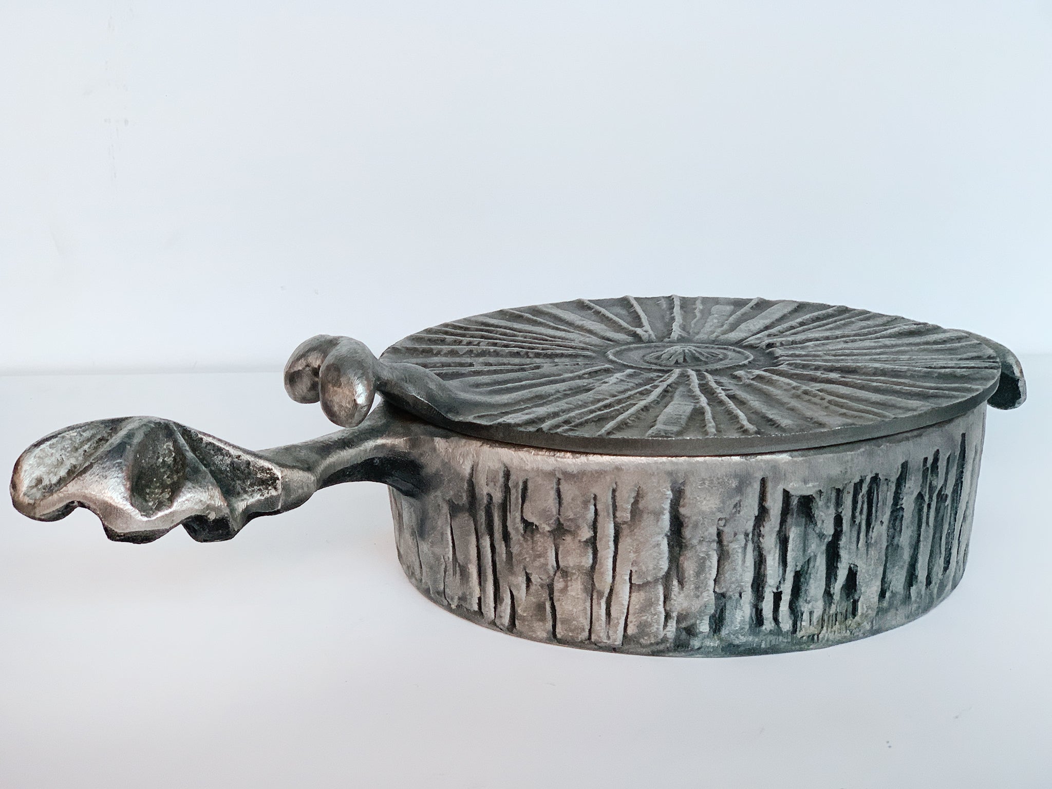This round casserole pan was crafted by the artist and designer Don Drumm. Recalling the raw, crude forms of Brutalism, this pan is a sculpted aluminum. Drumm is known for using cast aluminum in his crafts, including sculpture and cookware.
