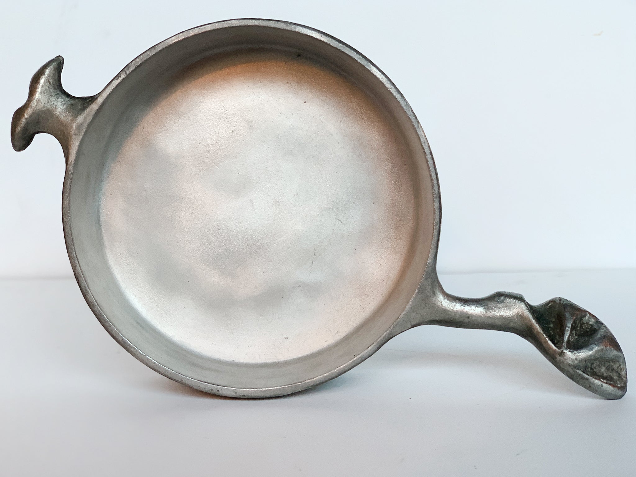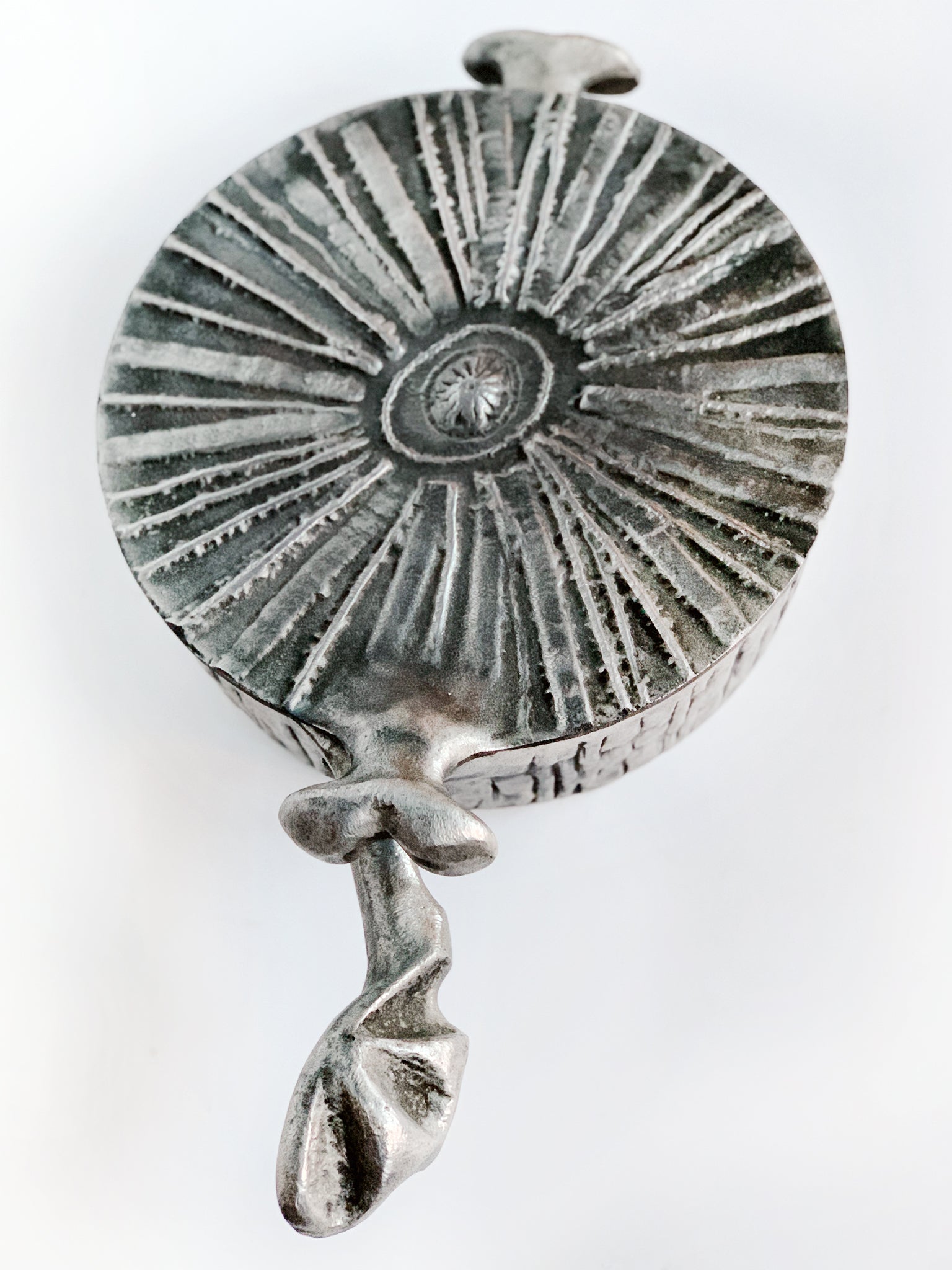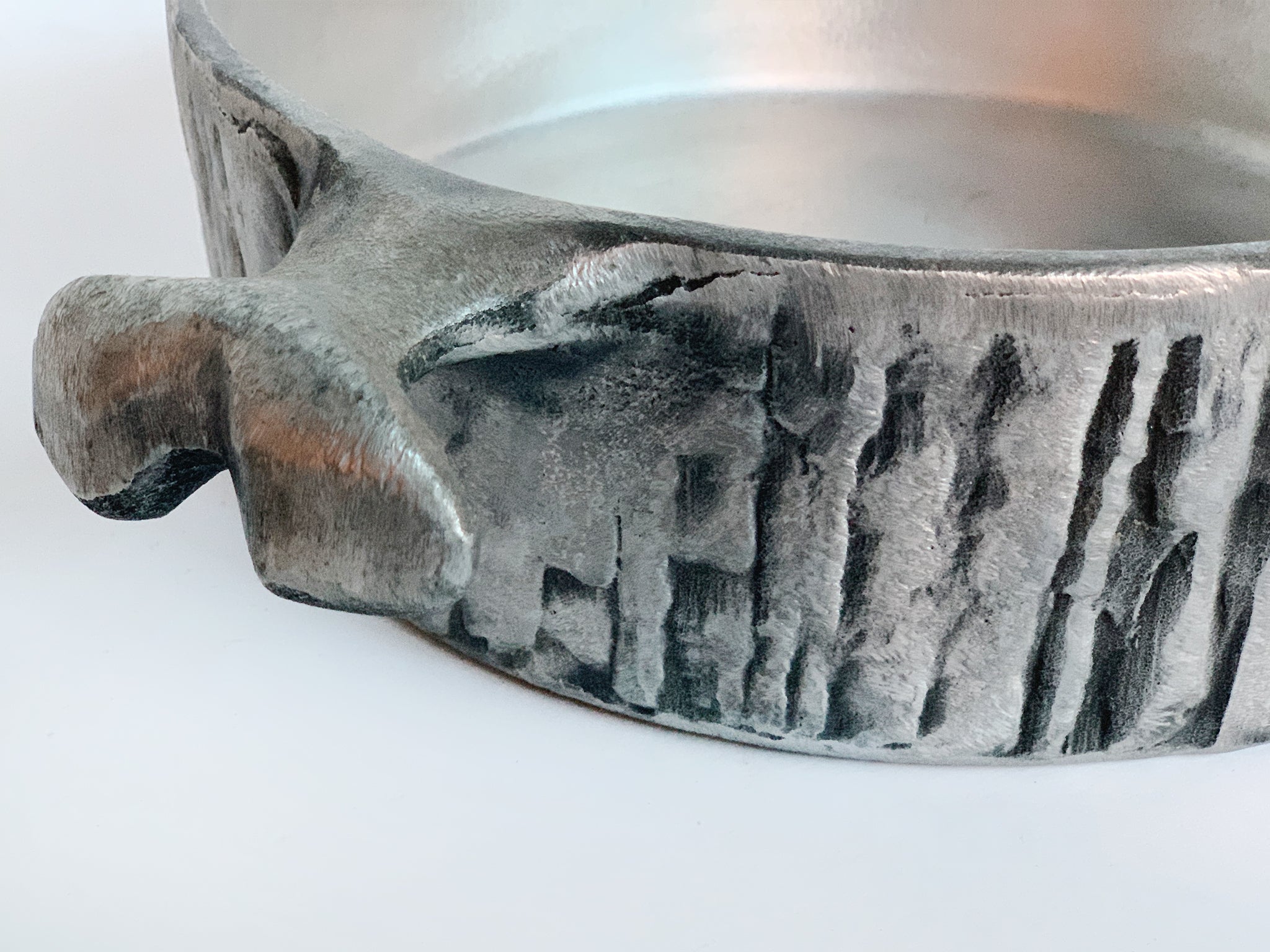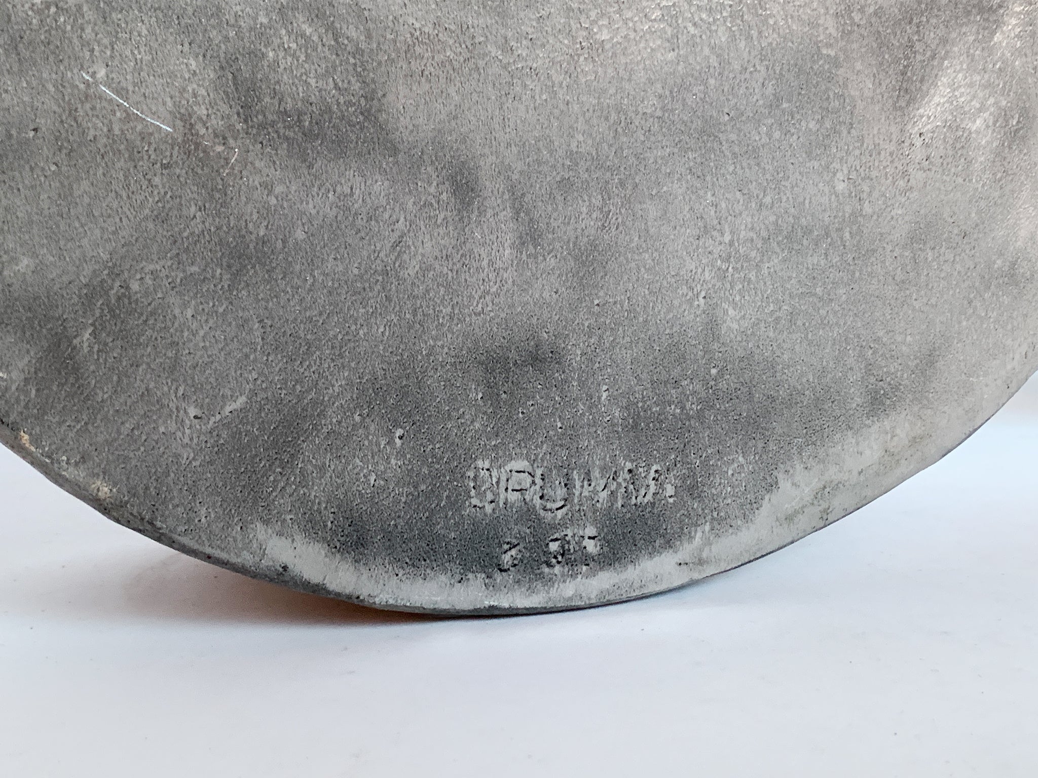 This round casserole pan was crafted by the artist and designer Don Drumm. Recalling the raw, crude forms of Brutalism, this pan is a sculpted aluminum. Drumm is known for using cast aluminum in his crafts, including sculpture and cookware.
