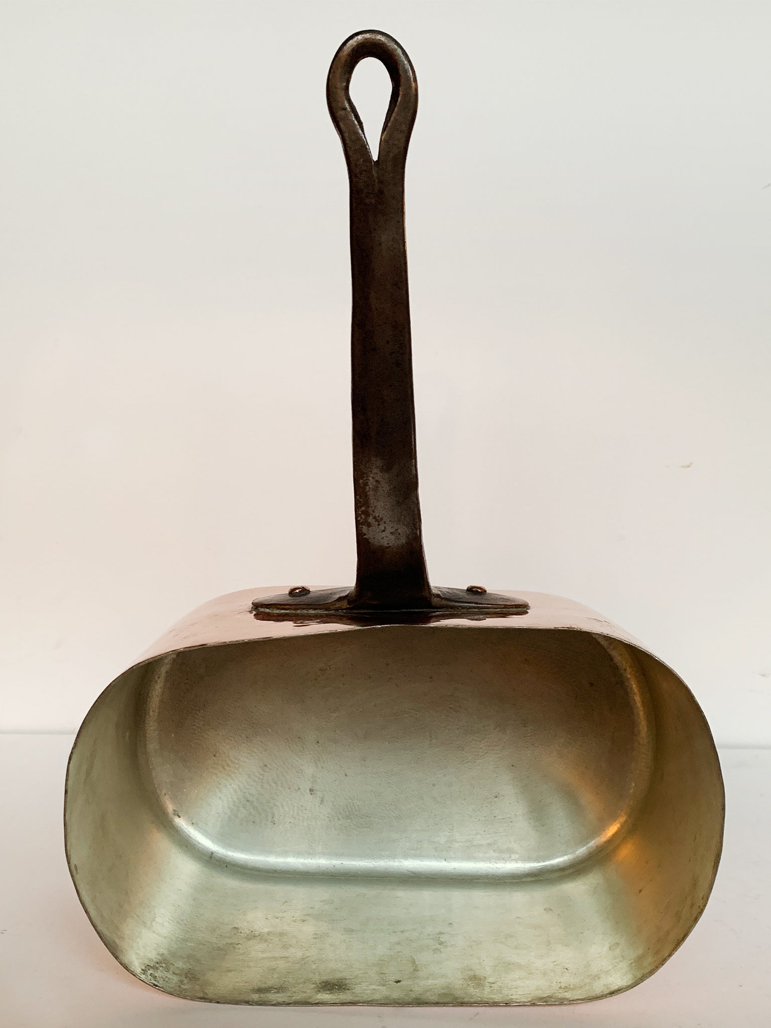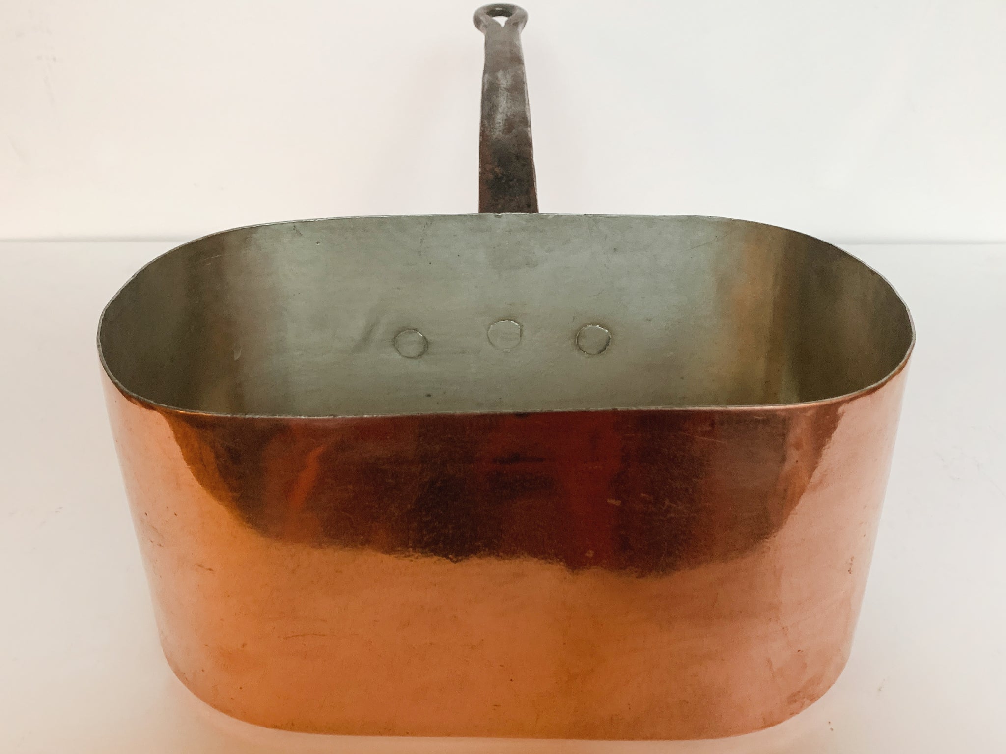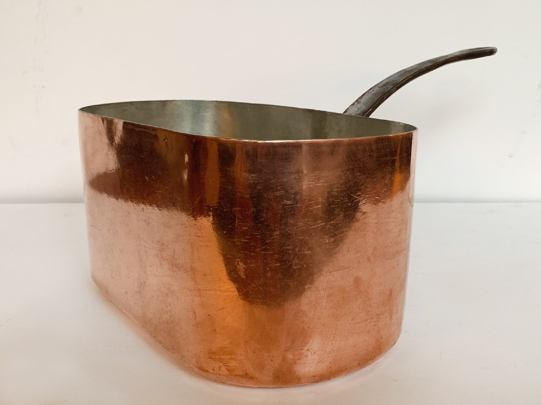 This vintage rectangular copper pot was crafted in France and is built to last. It has a lustrous exterior, an enameled interior, and a curved brass handle. A "C S B" mark is engraved on the front side. Dimensions:11.25 in....