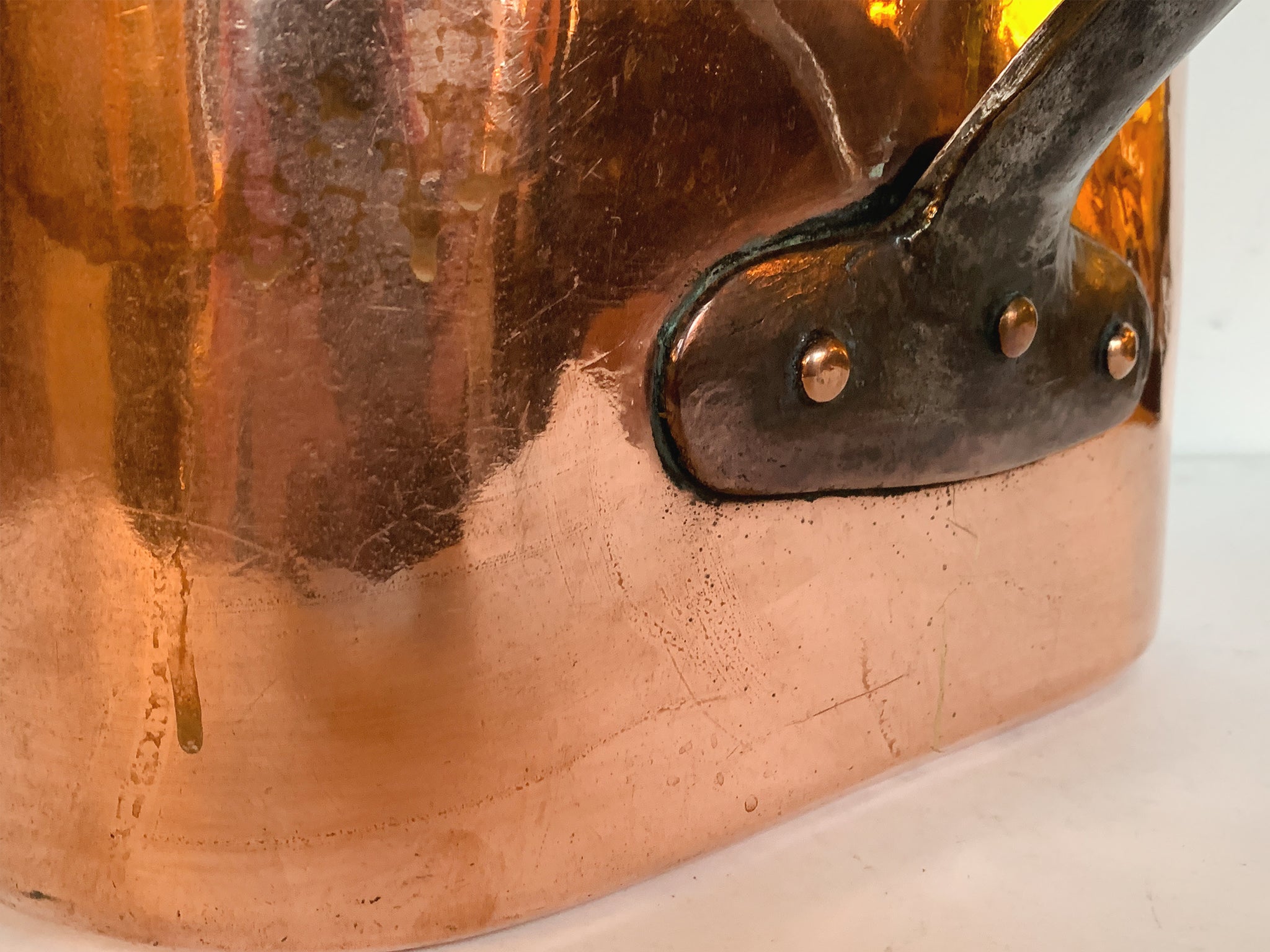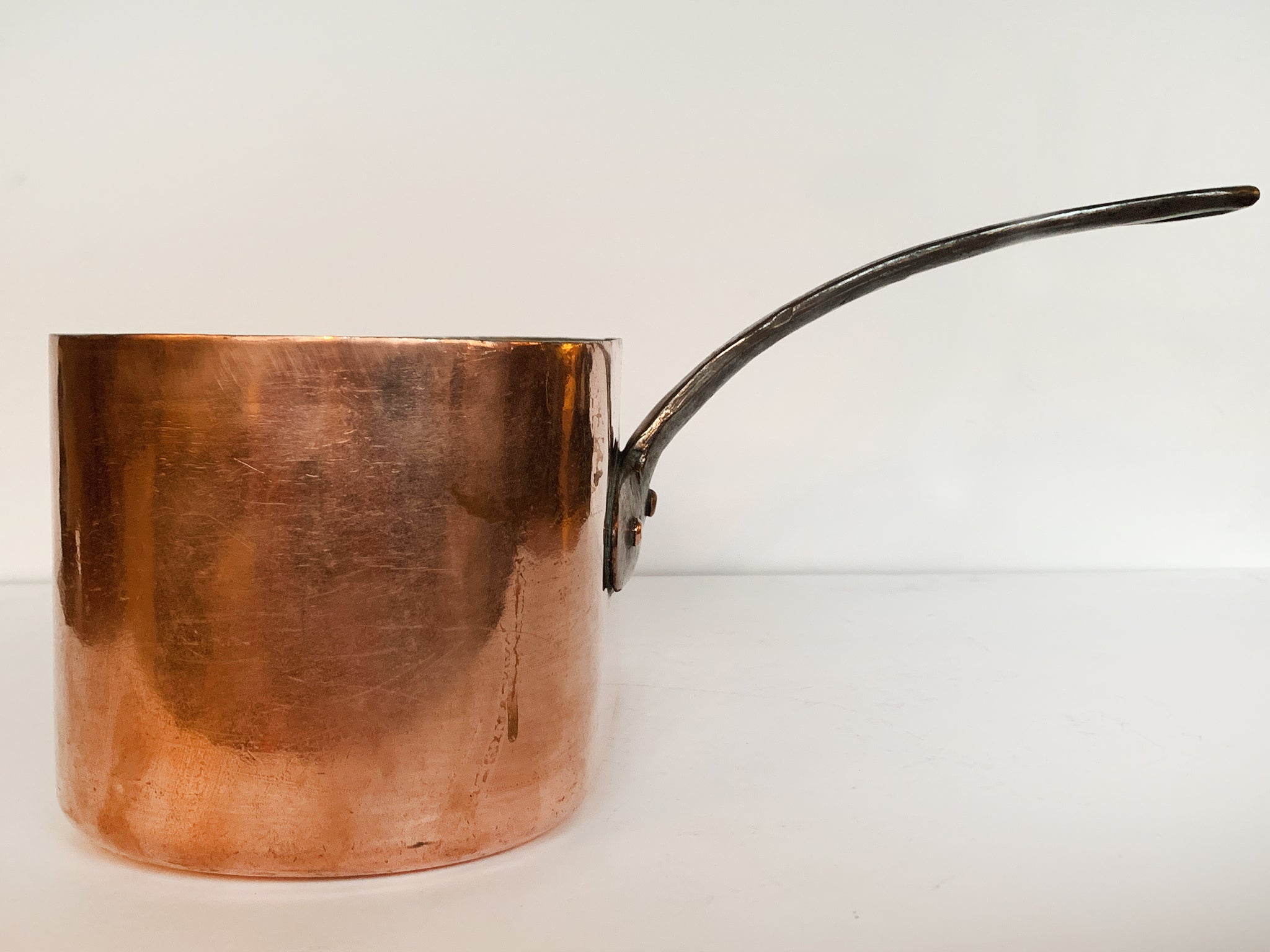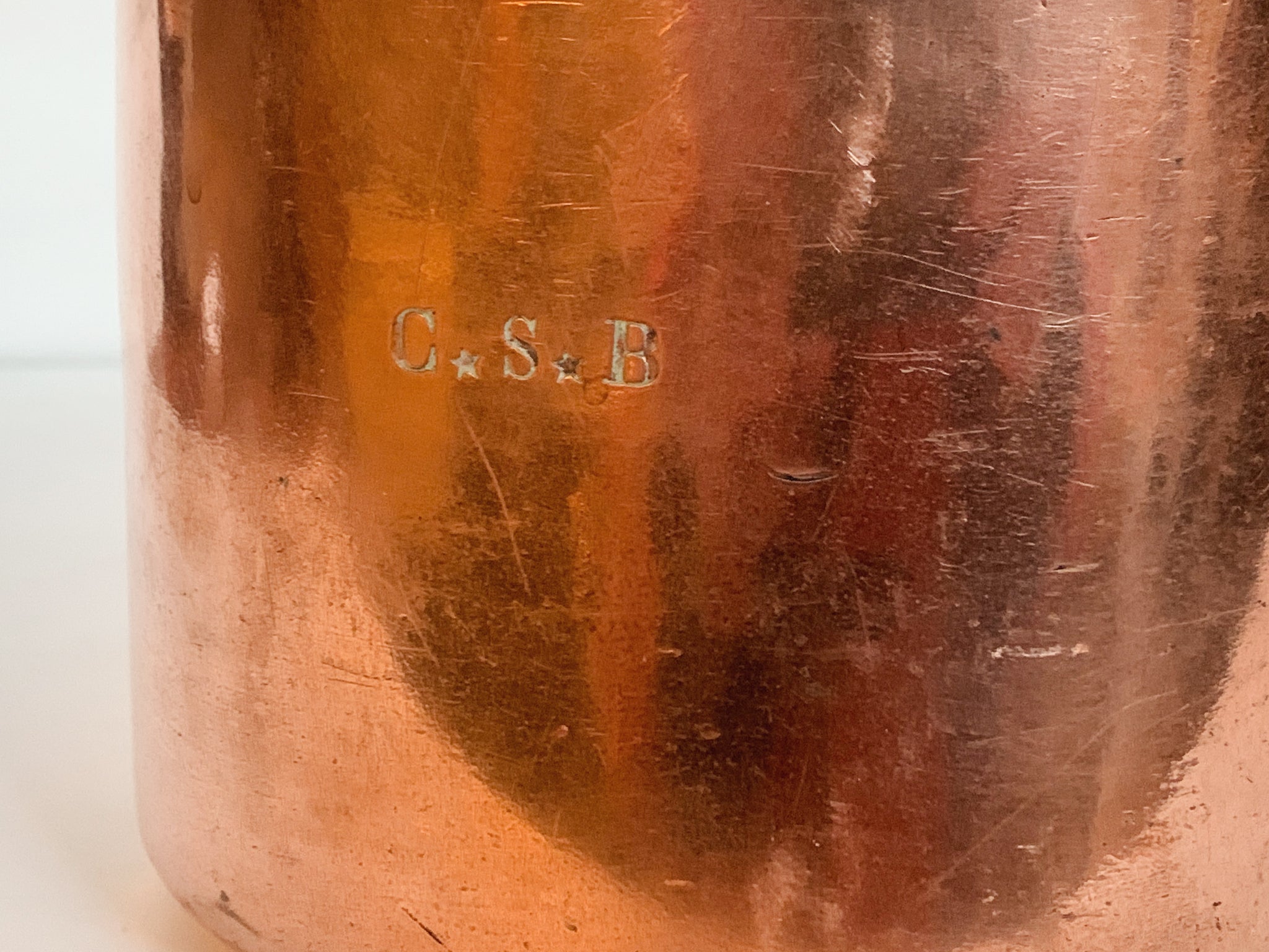 This vintage rectangular copper pot was crafted in France and is built to last. It has a lustrous exterior, an enameled interior, and a curved brass handle. A "C S B" mark is engraved on the front side. Dimensions:11.25 in....