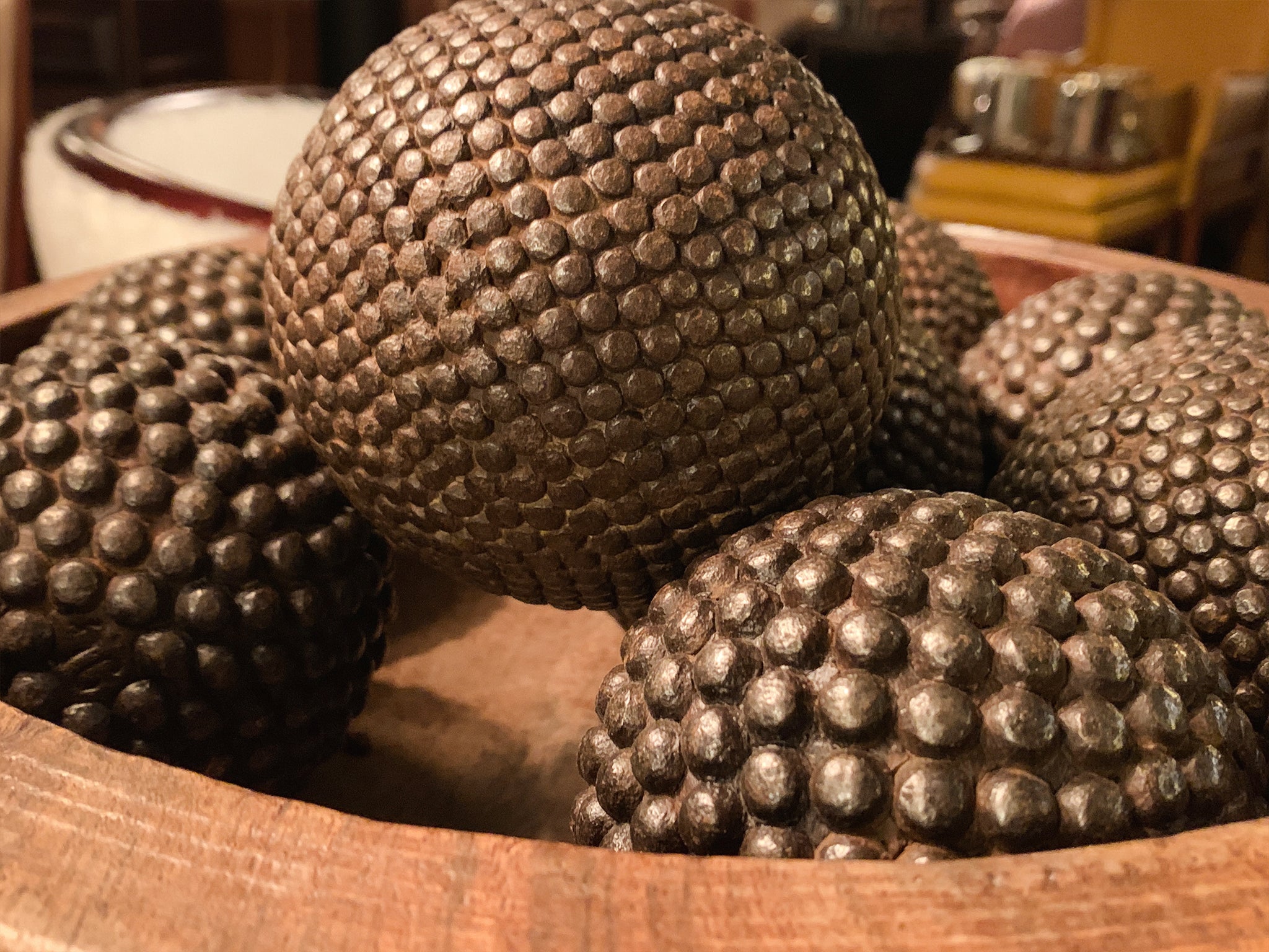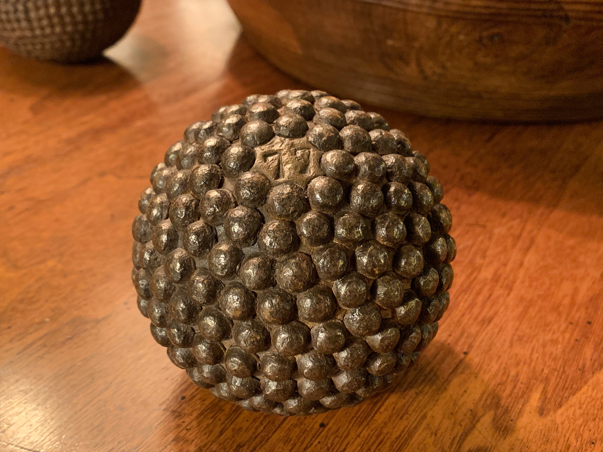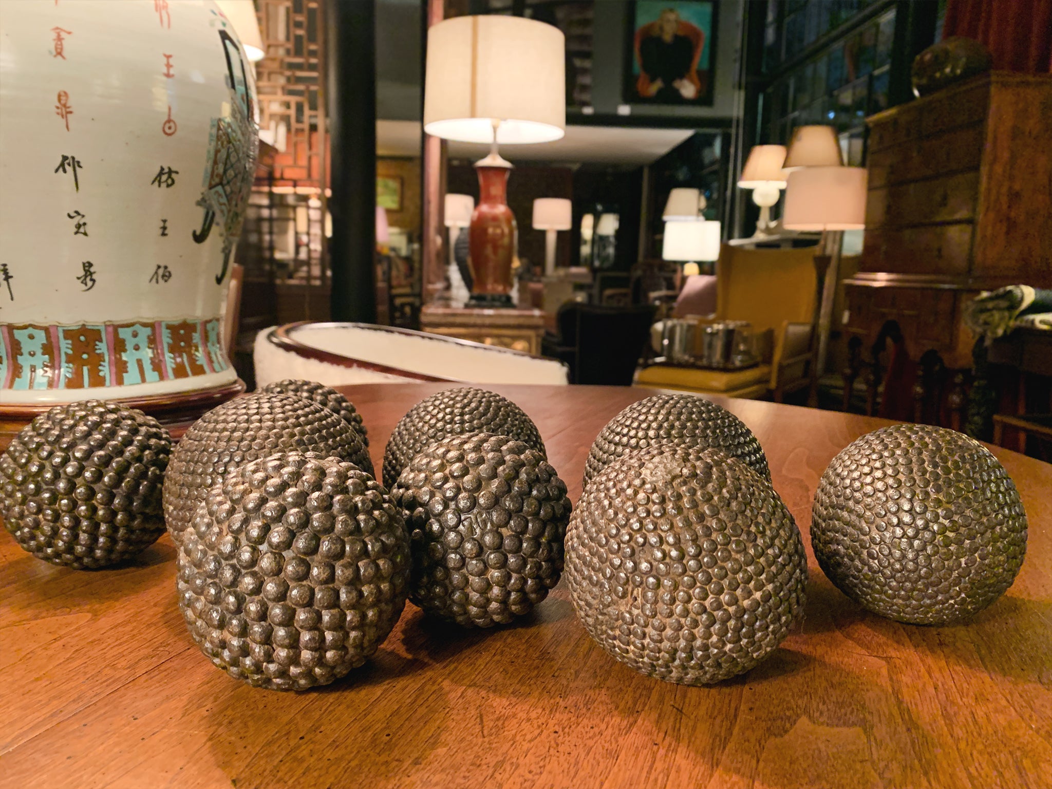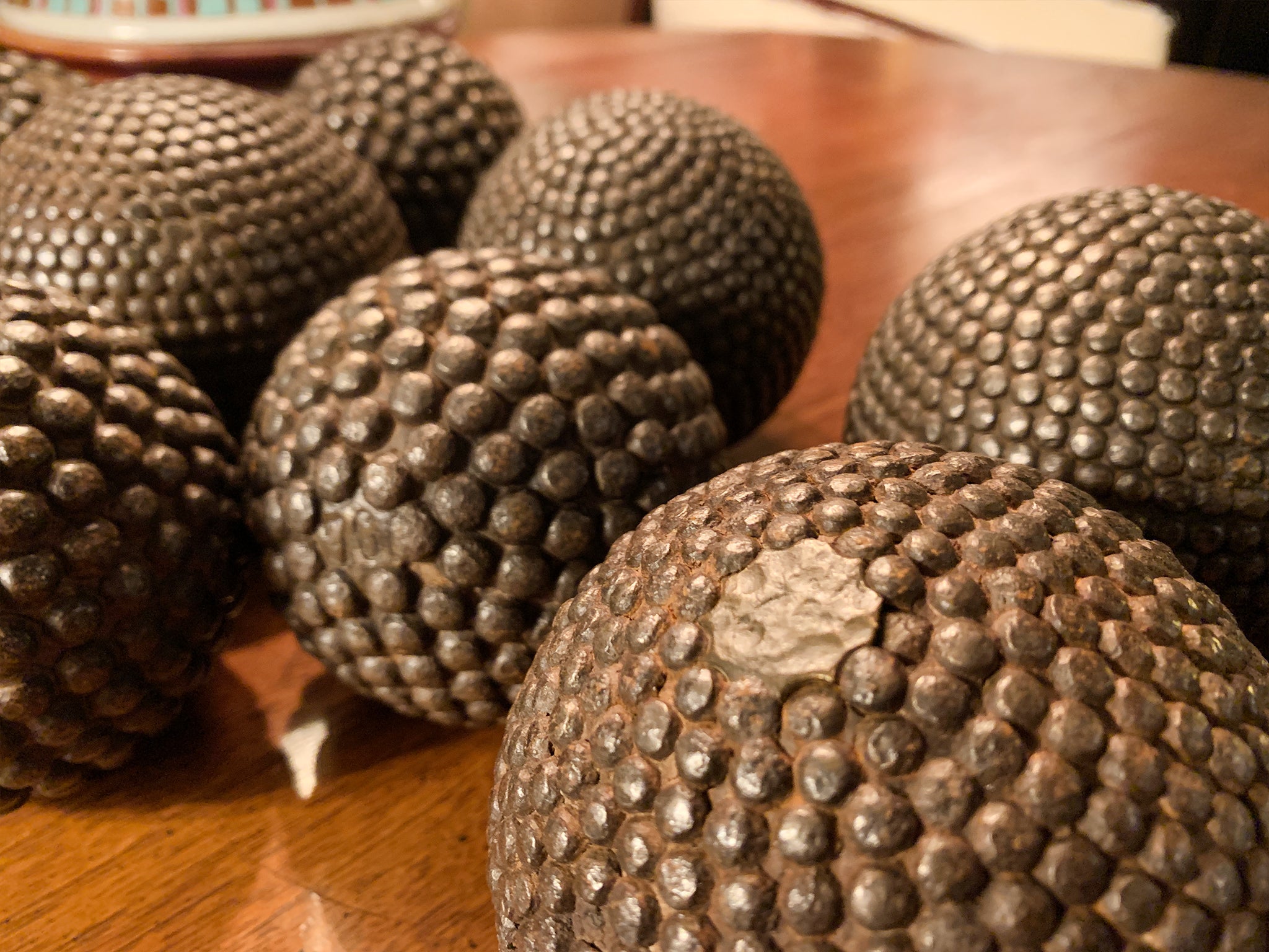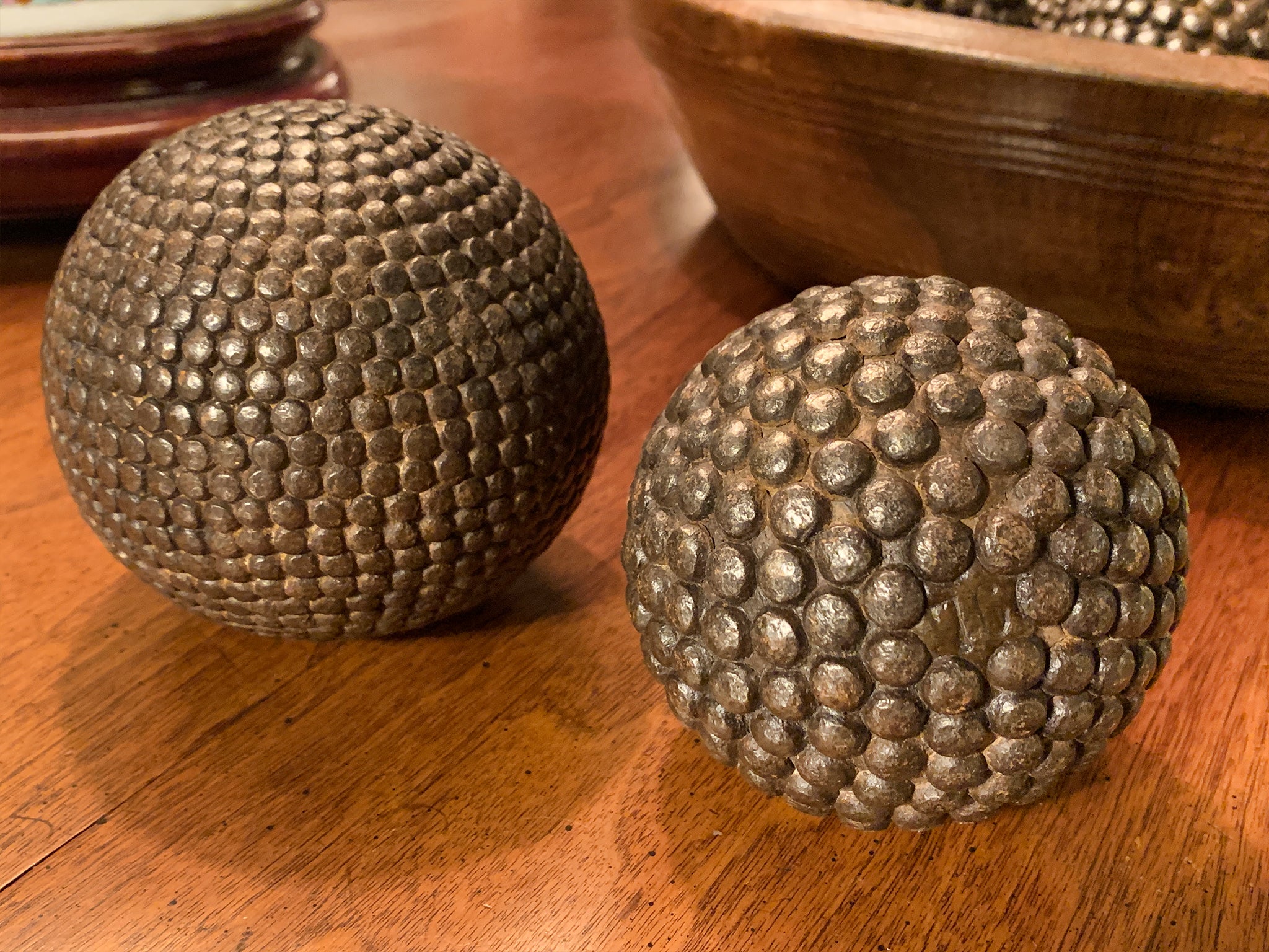A pair of 20th Century obelisks with a bold brick-red and black faux shell veneer that covers all sides. Four ebonized wood globes decorate the space between the obelisk and the base. A sticker on the underside of one obelisk...
