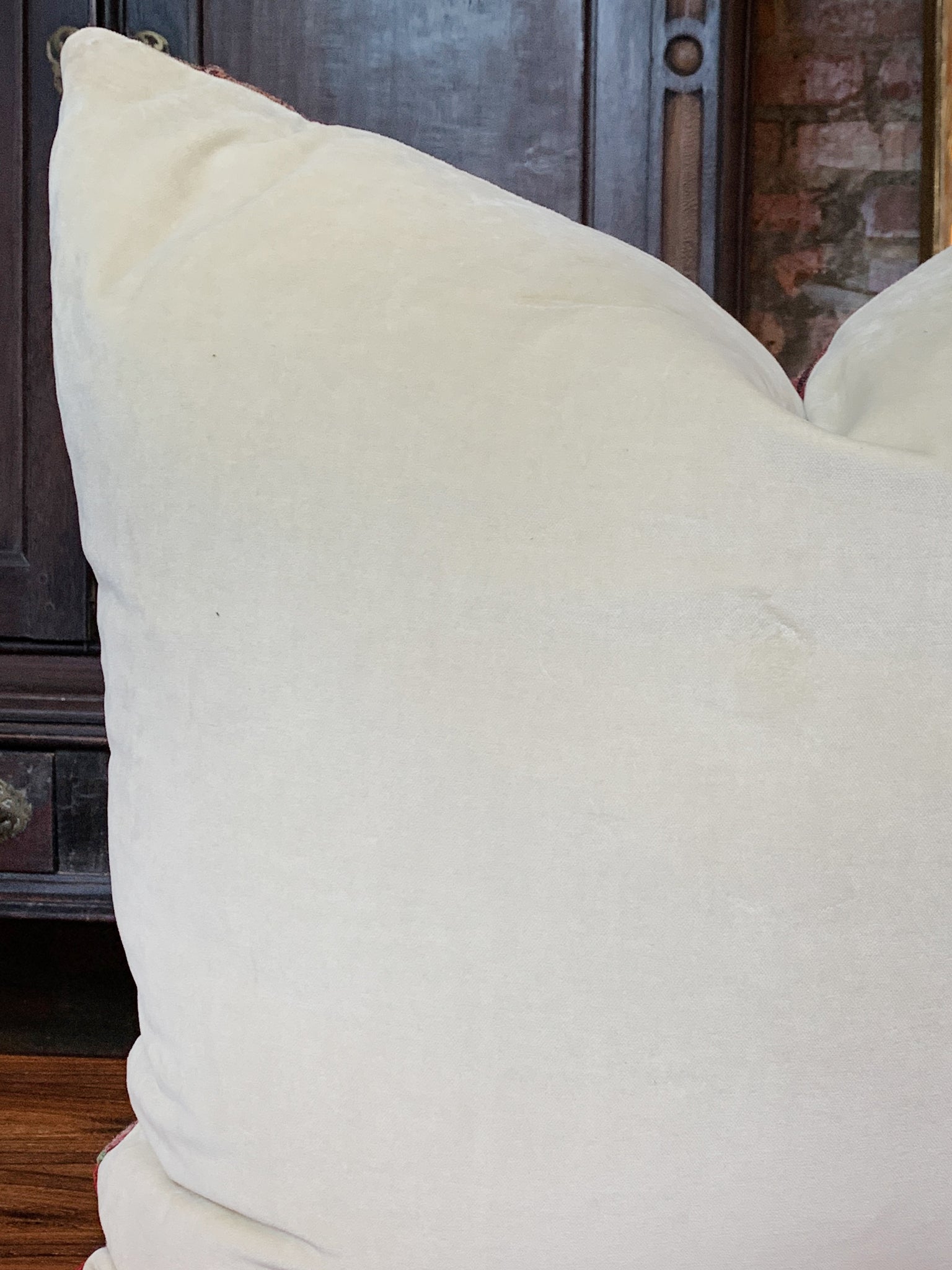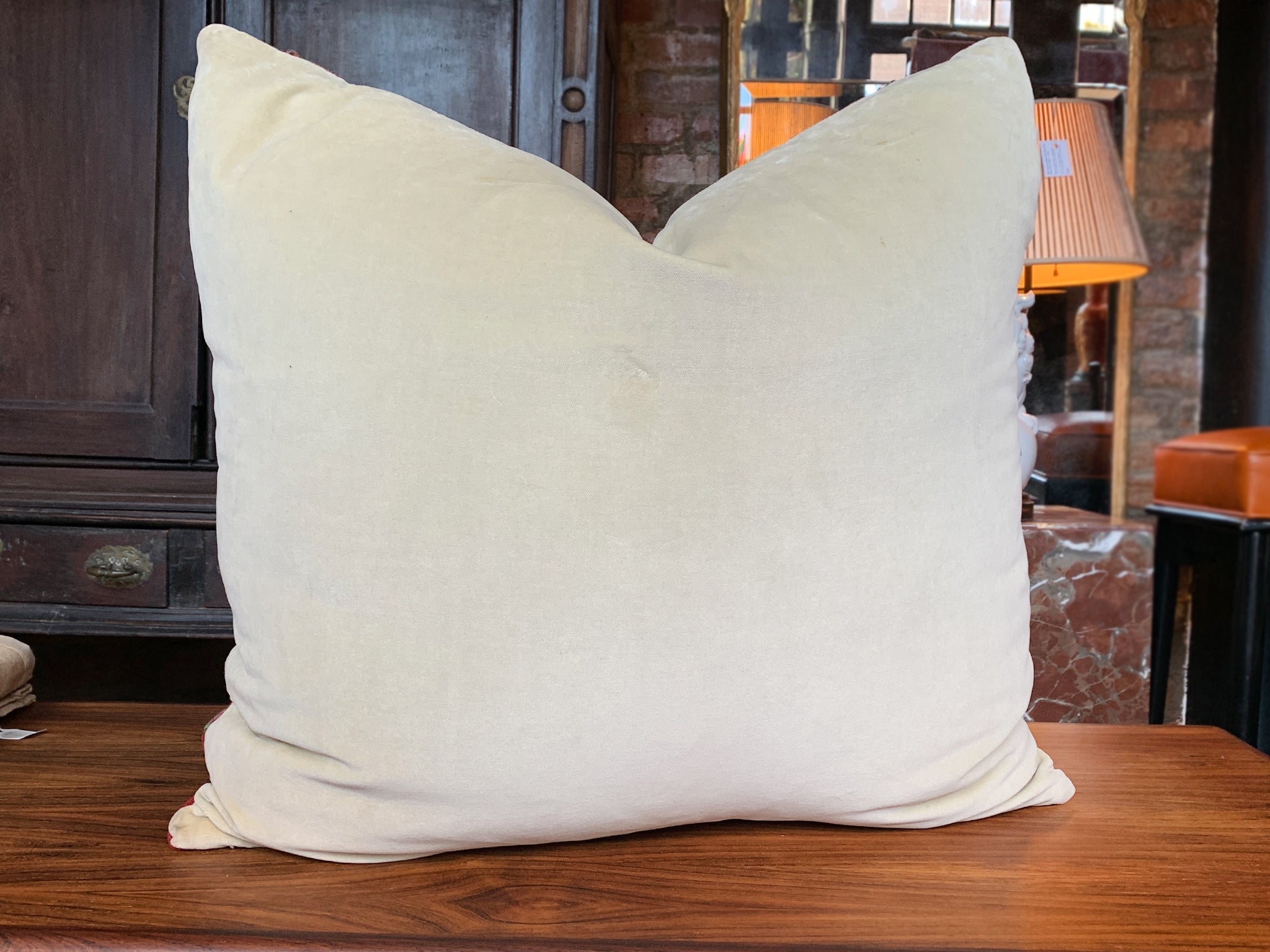 This custom pillow is made from a fragment of an antique, handwoven Kilim rug. The design features geometric and arboreal motifs over a red field with rich variations in tone. The back of the pillow is a cream-white velvet mohair. A zipper is sewn into the side for the pillow insert. The new cushion is a comfortable mix of down and Dacron, making for a substantially cozy rest.