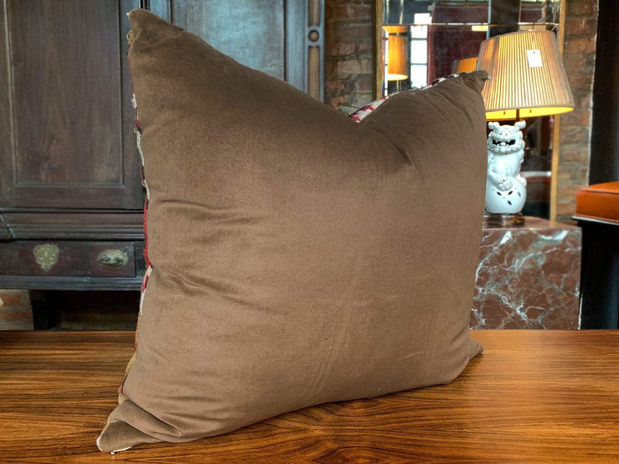 This custom pillow is made from a fragment of an antique, handwoven Kilim rug. The design features a rich geometric pattern in a palette of red, black, ivory, and tan. The back of the pillow is a brown velvet mohair. A zipper is sewn into the side for the pillow insert. The new cushion is a comfortable mix of down and Dacron, making for a substantially cozy rest.