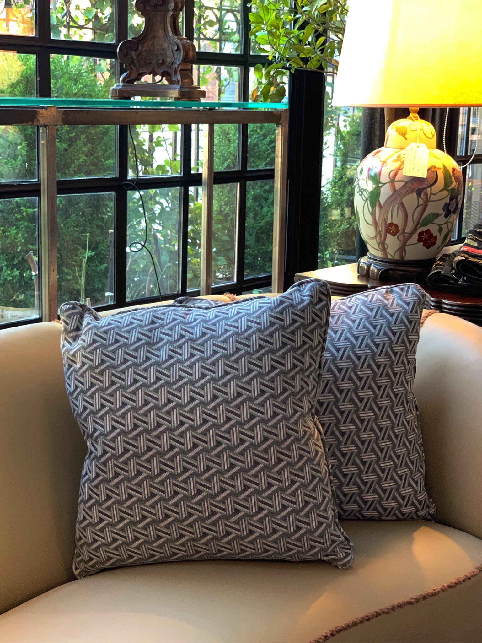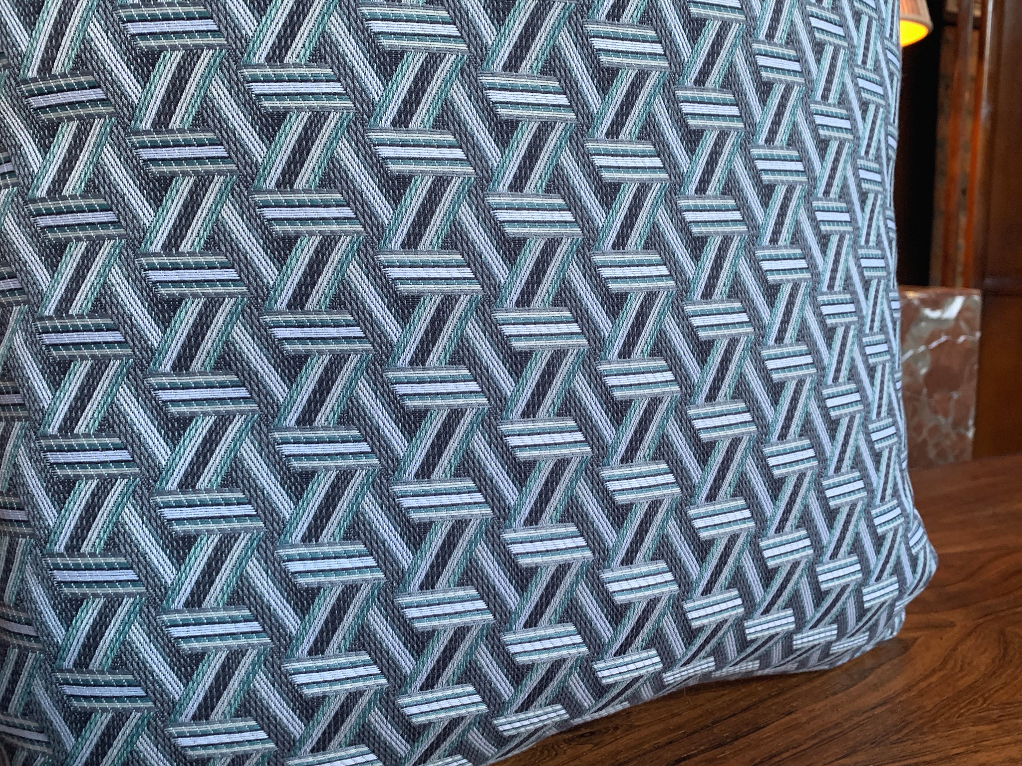 A pair of new custom square pillows exclusively made for Cafiero Select. The jewel-like fabric is a Jacquard patterned weave from Lelièvre from their TRIBU series. The pattern is an intricate network of ribbons that was inspired by basketwork. The cushion is a comfortable mix of Dacron and down.