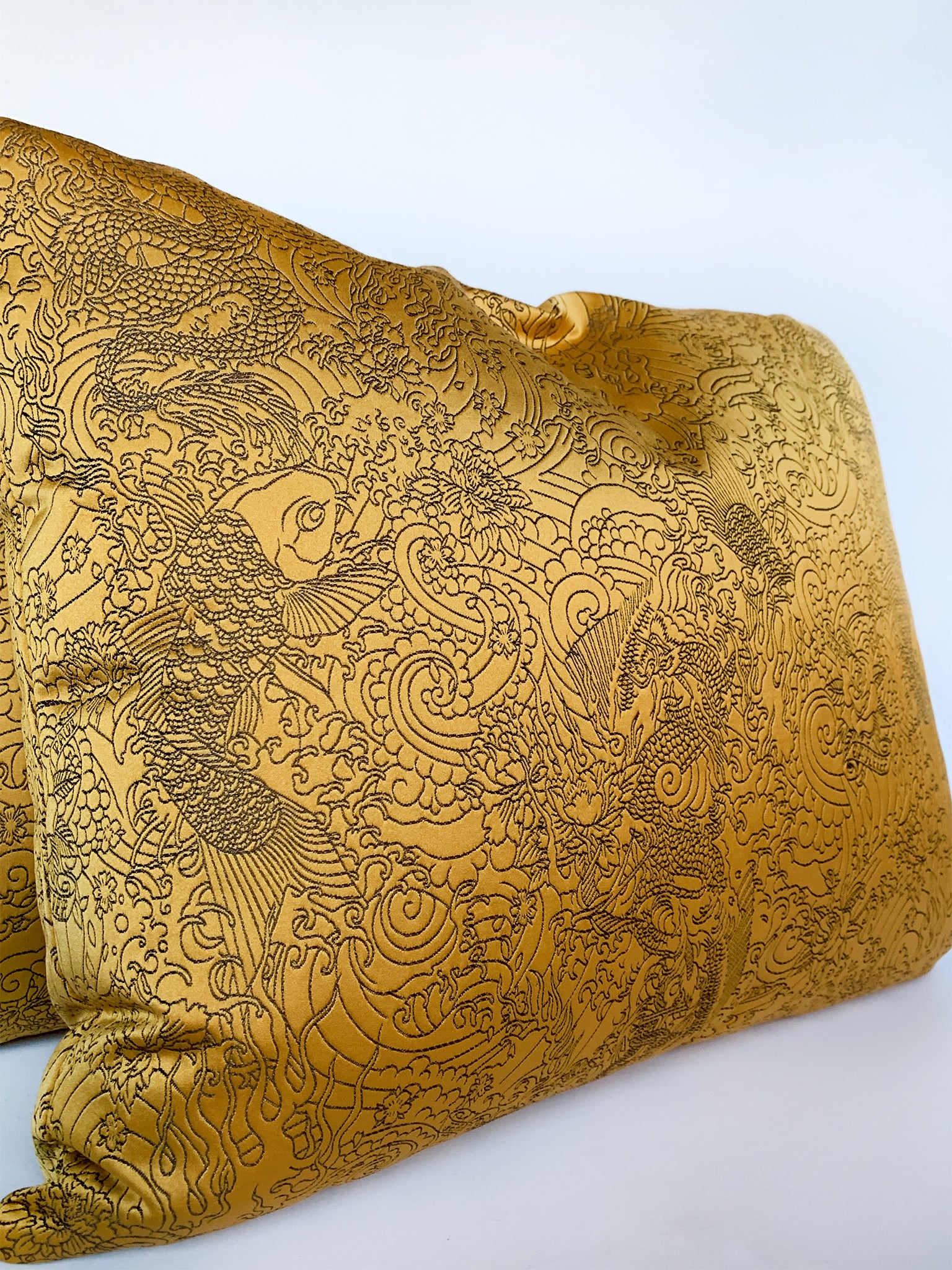 A new pair of custom-made rectangular pillows by Cafiero Select in a stunning gold satin from Jean Paul Gaultier. The fabric is intricately embroidered with a Chinoiserie pattern that sprawls beautifully across the entire surface. The cushion is a comfortable mix of Dacron and down.