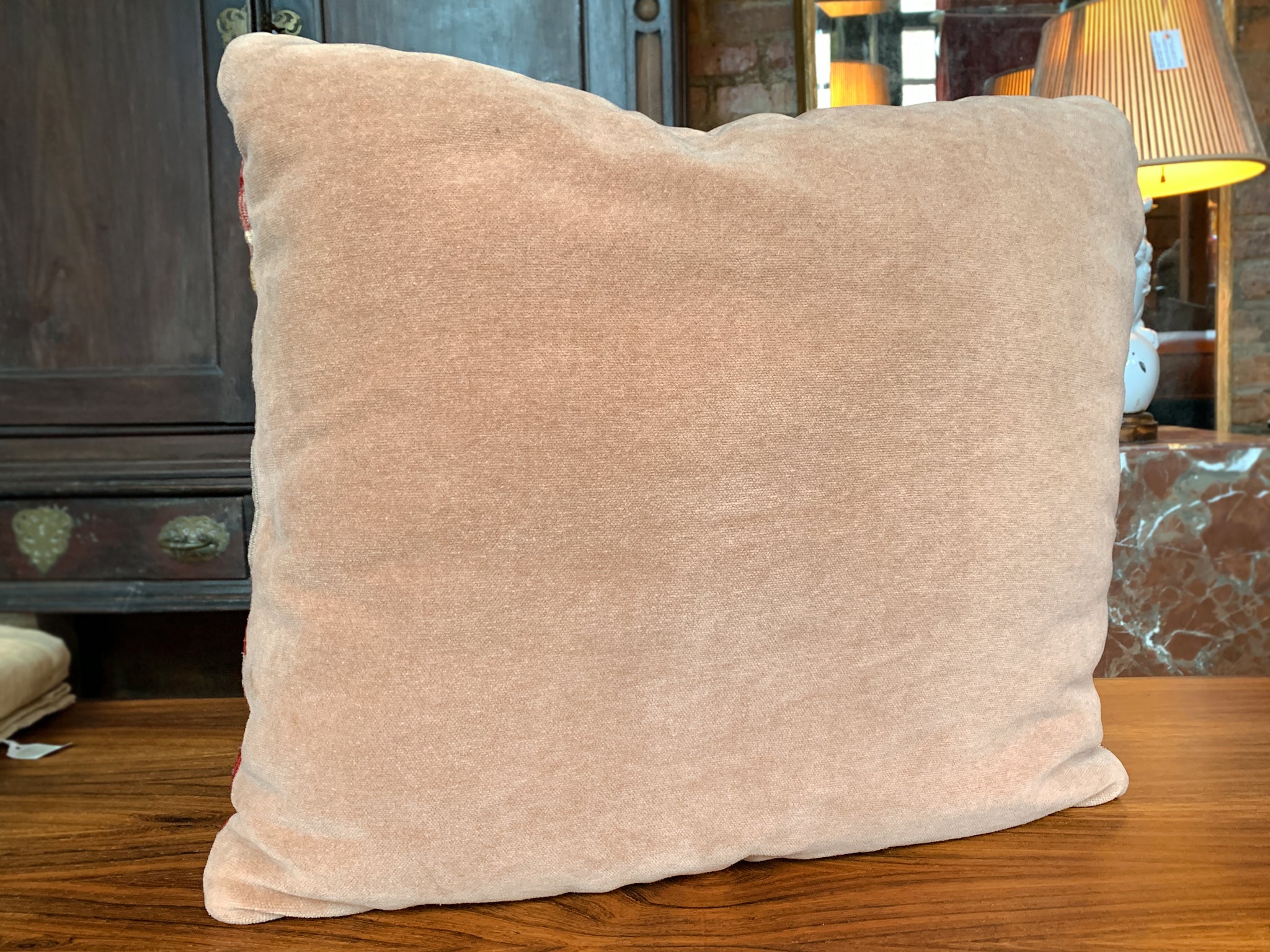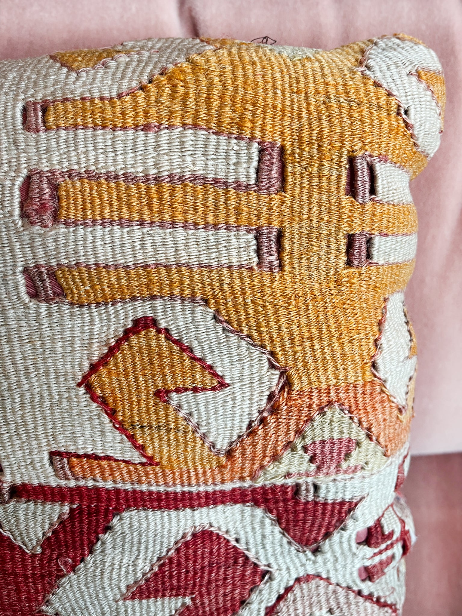 This small pillow is custom-made from a fragment of an antique, handwoven Kilim rug. The design features geometric motifs in a bold palette of red, yellow, pink, and ivory. The back of the pillow is a pink mohair fabric. A zipper is sewn into the side for the pillow insert. The new cushion is a comfortable mix of down and Dacron, making for a substantially cozy rest.