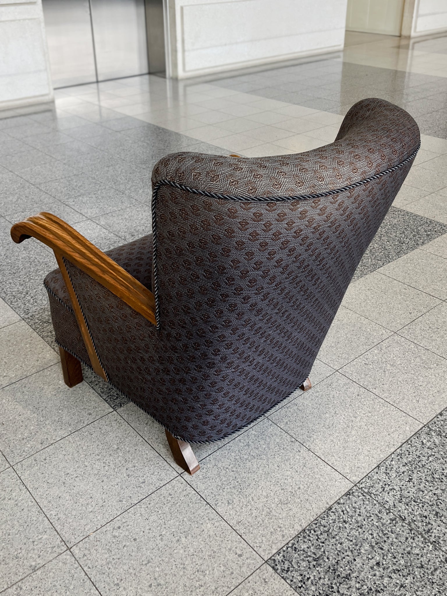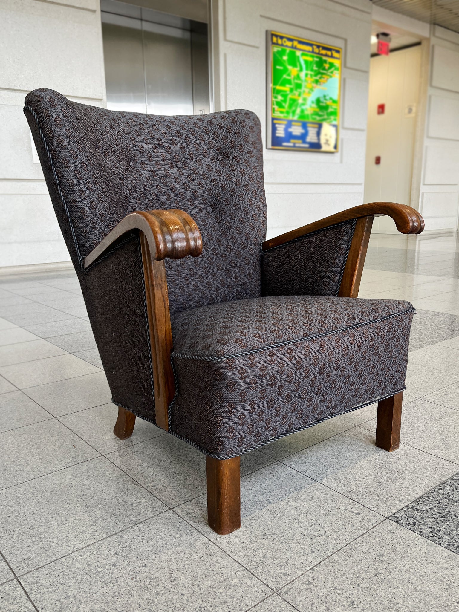 Made in the 1950s, this Danish wingback armchair takes after the elegant designs of Alfred Christensen, founder of Slagelse Møbelværk. The frame, arms, and legs are mahogany, while the upholstery is a woven fabric with rope trims. Like the well-crafted furniture produced by Christensen, this chair is characterized by soft lines and curves, and by carved details such as the rolled arms. The woven fabric is noteworthy for its textured floral pattern and gray-eggplant color.