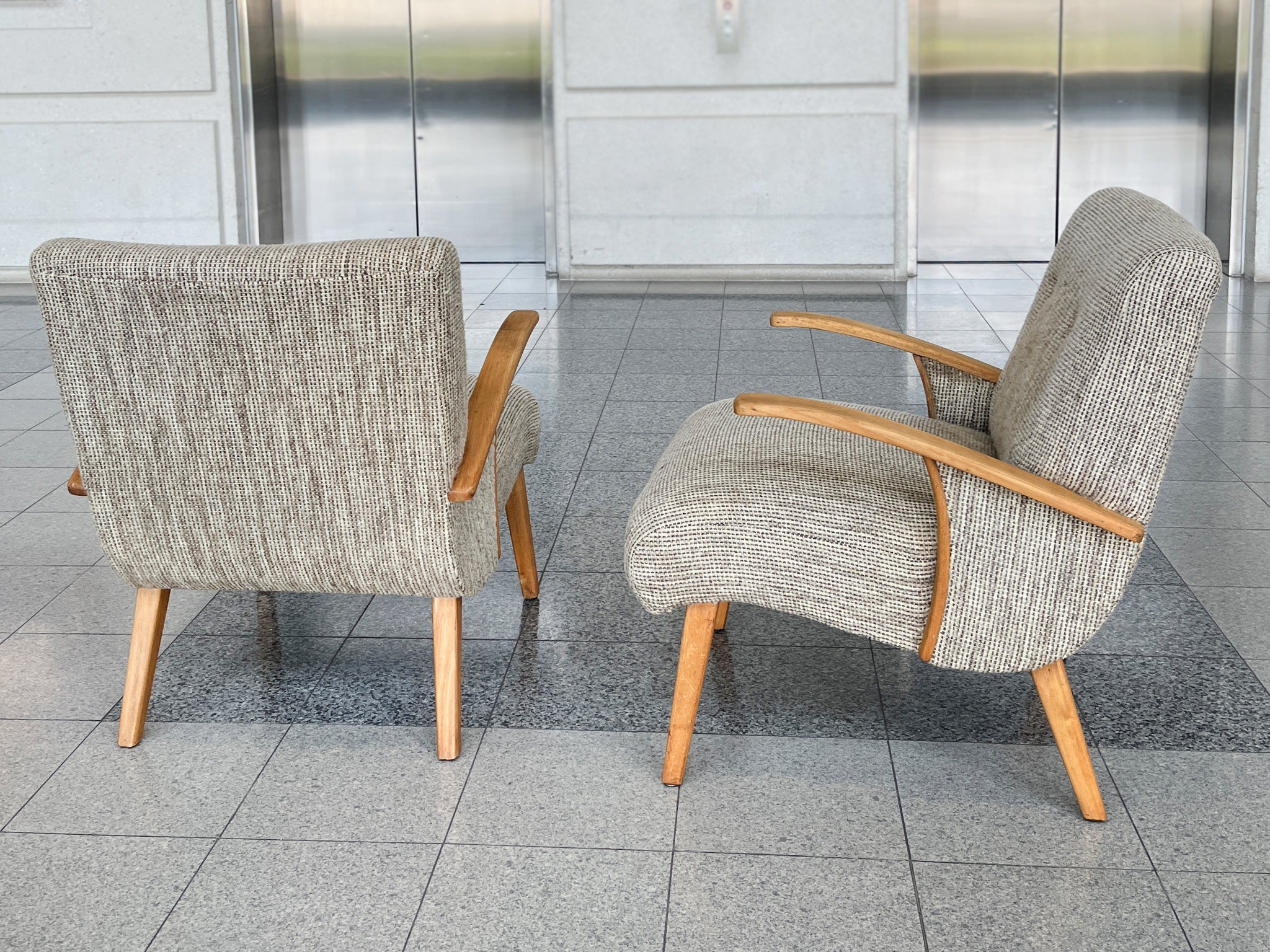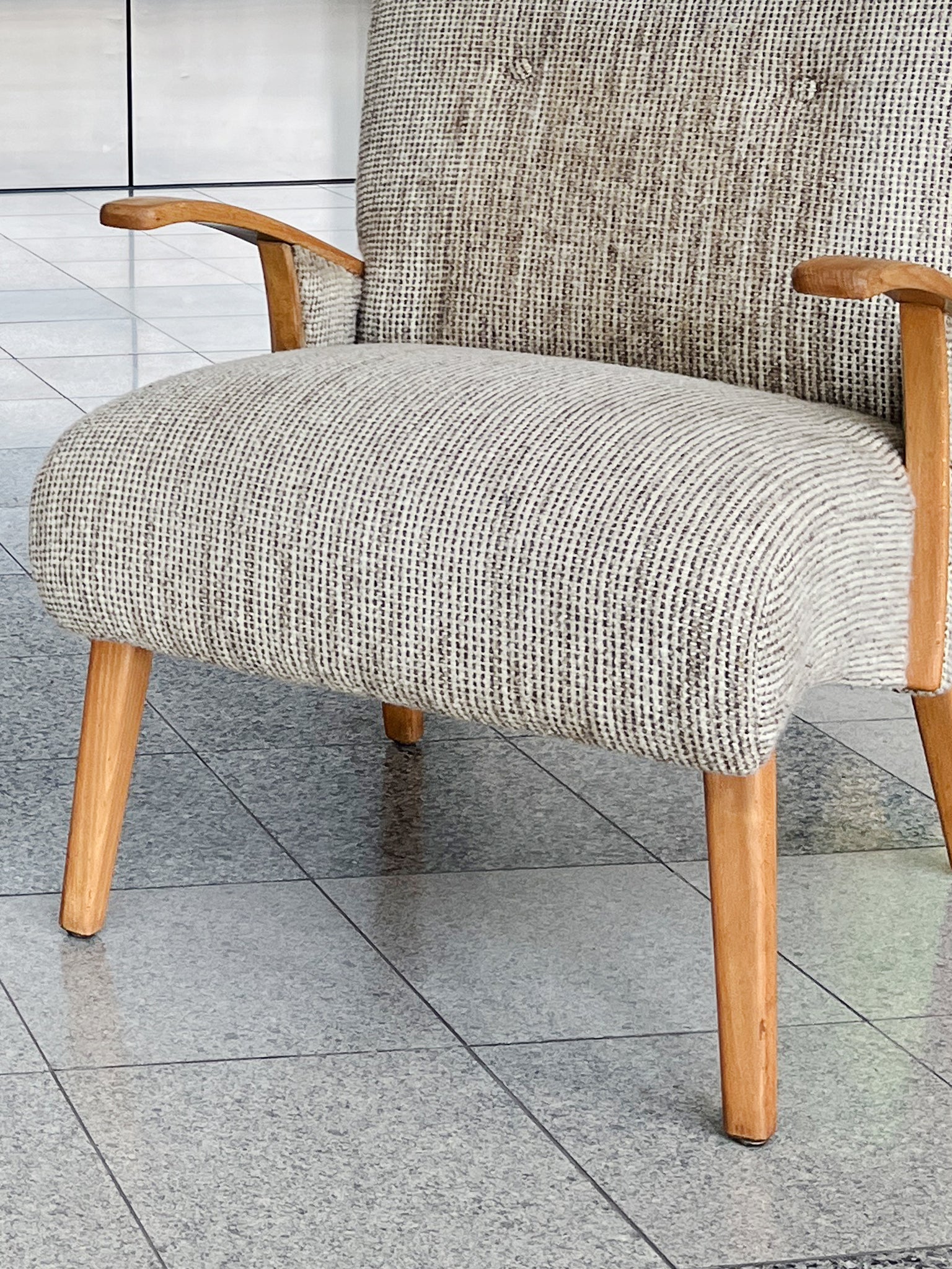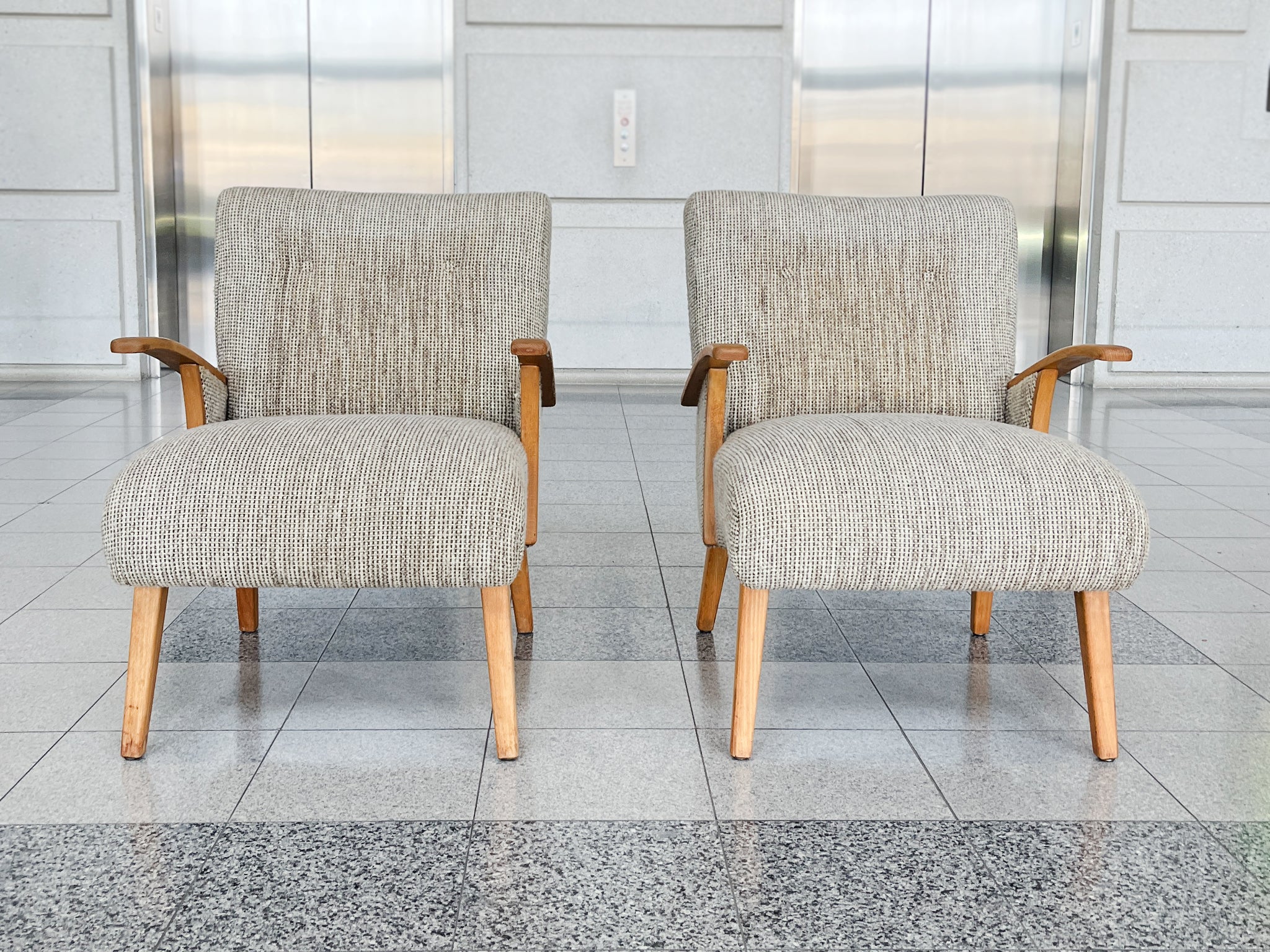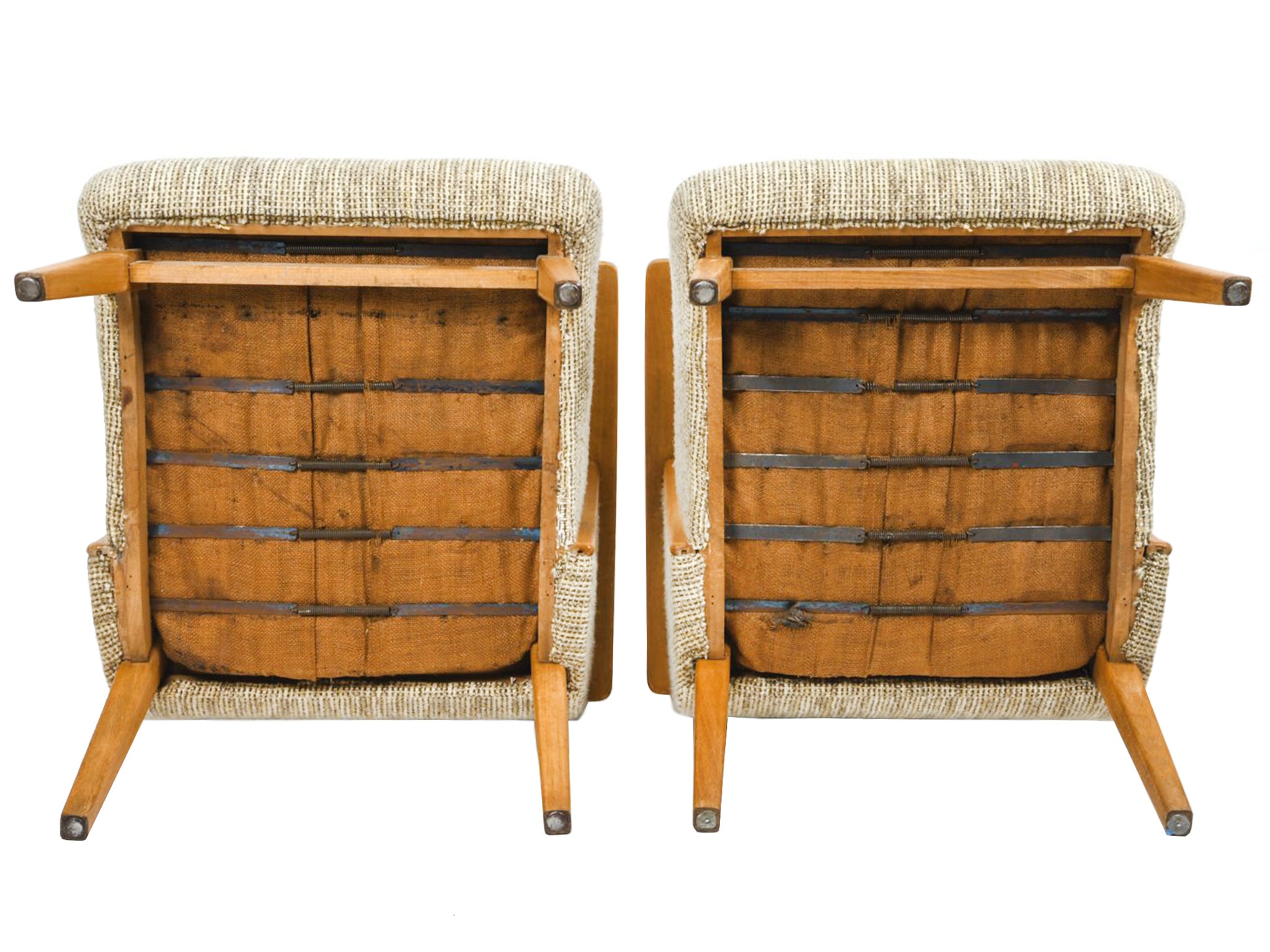 Pair of vintage Scandinavian lounge chairs, made in the 1960s. They are beech wood with woven wool upholstery. Soft curves and rounded corners characterize the overall modern design. The arms in particular have a flat shape that slopes upward from the back, while the legs are tapered and slightly splayed.
