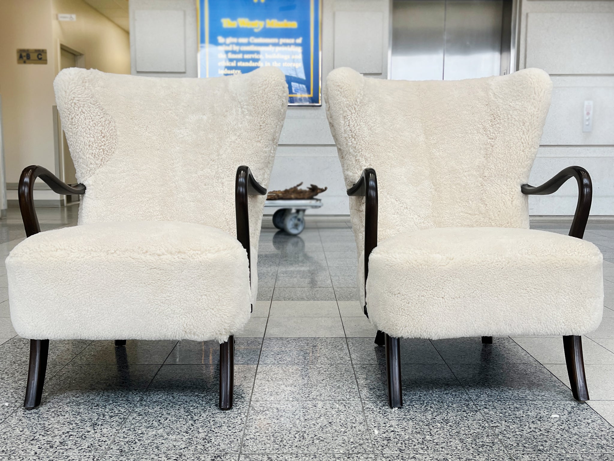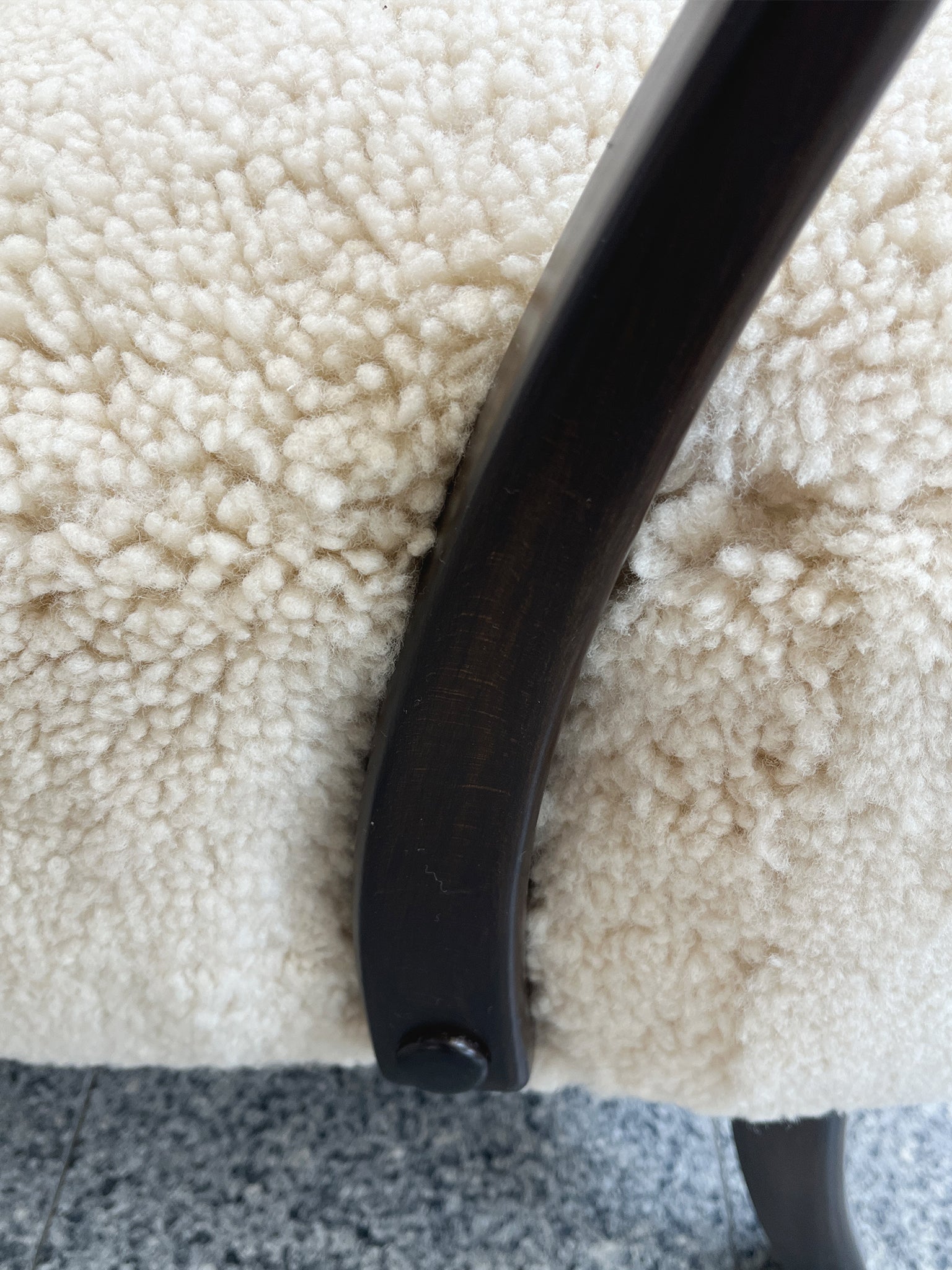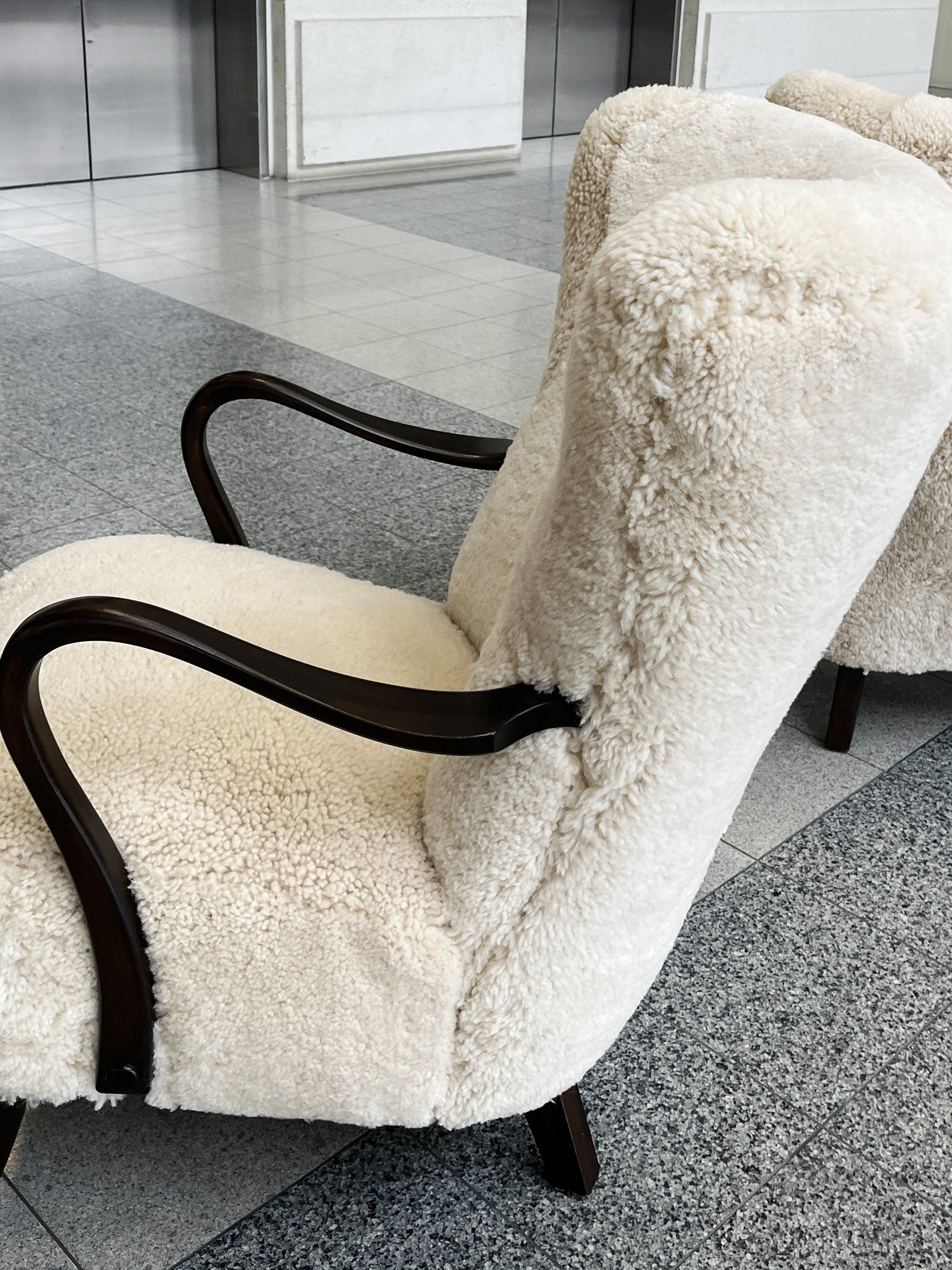 This settee was designed by Frits Henningsen in the 1940s. The simplified lines you'd expect from modern furniture are tempered by rounded forms and curves in Henningsen's design. The settee has been newly reupholstered with a gold-and-black chevron wool from...