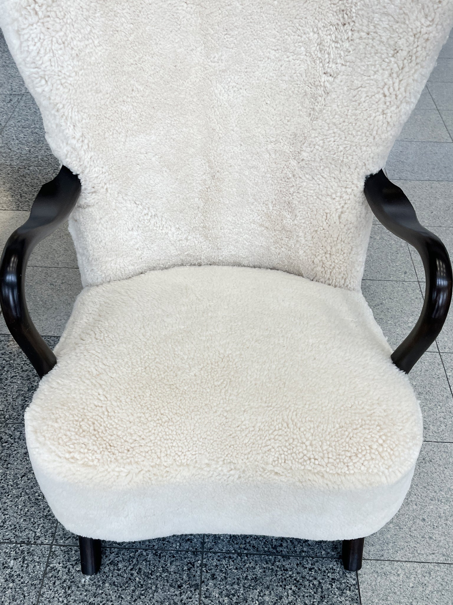 This Danish Modern lounge chair was hand-crafted in the 1940s and takes after the "Easy Chair" design by Fritz Hansen. Like Hansen's design, this chair is built with comfort in mind. It is characterized by plump cushioning, a channeled back...