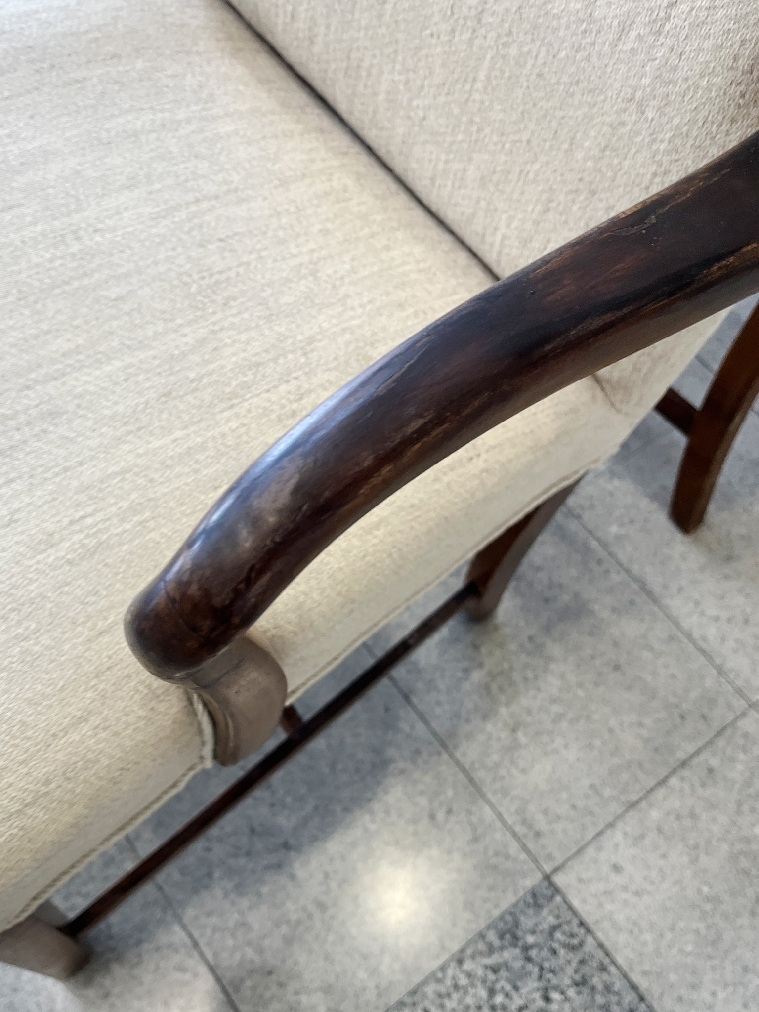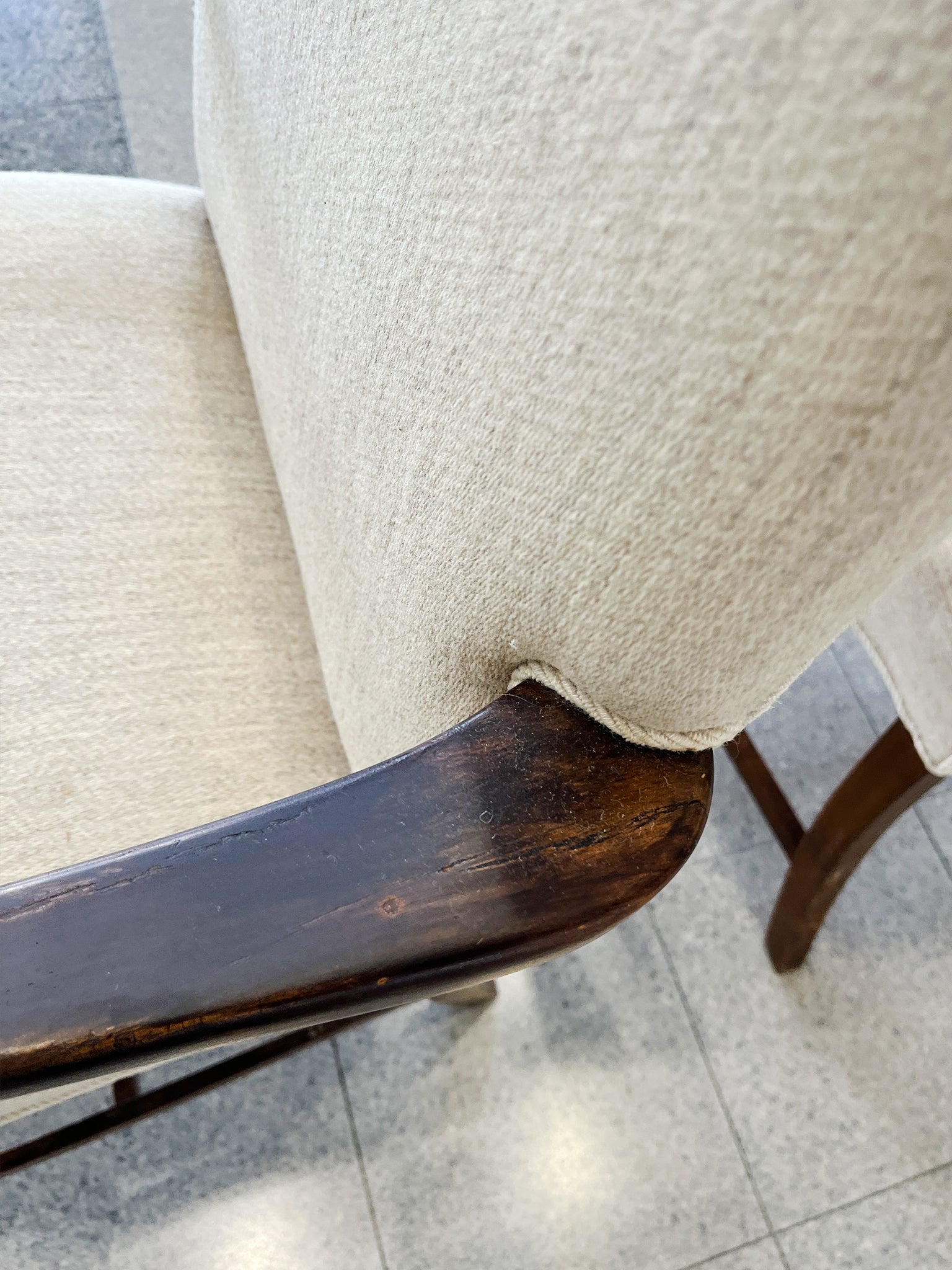 In overall good condition with general wear (discoloration to wool and scuffs to wood), all consistent with the chairs' age and use. Great as is; a good candidate for future re-upholstery work.