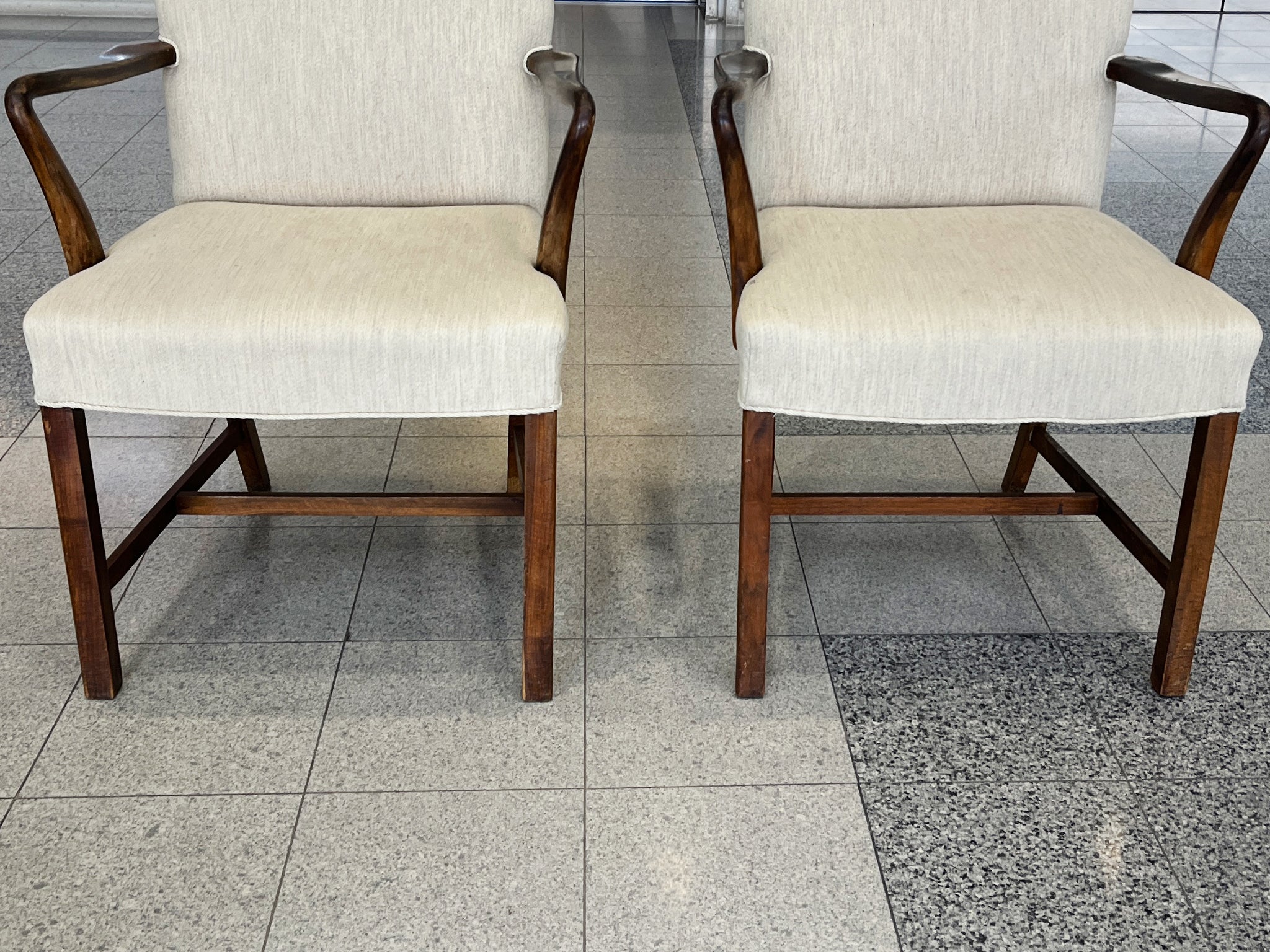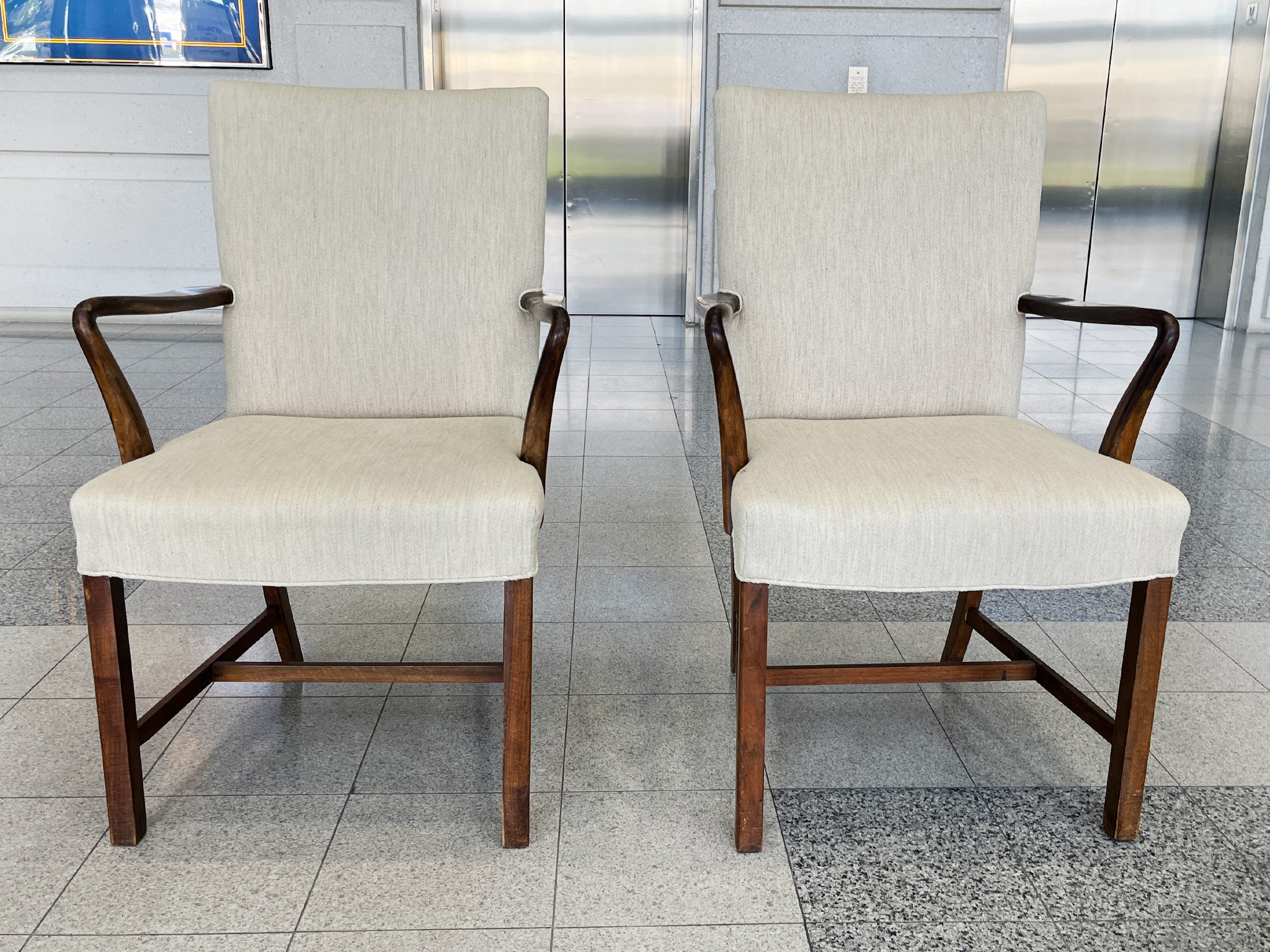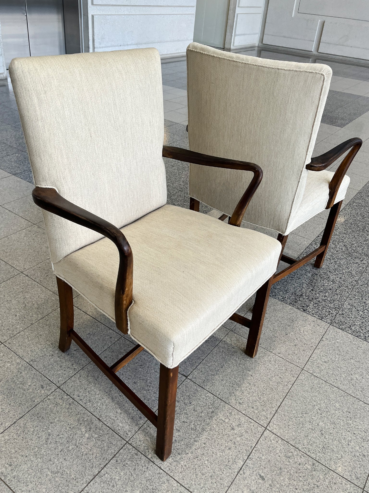 Originally crafted in the 1940s in Denmark, these two Fritz Hansen-style armchairs consist of mahogany frames and light beige wool upholstery. Expert woodwork lends the overall design an easy appearance, with curved arms and streamlined angular legs supported by stretcher bars. These chairs are a great candidate for future re-upholstery work, but they are outstanding as they are.