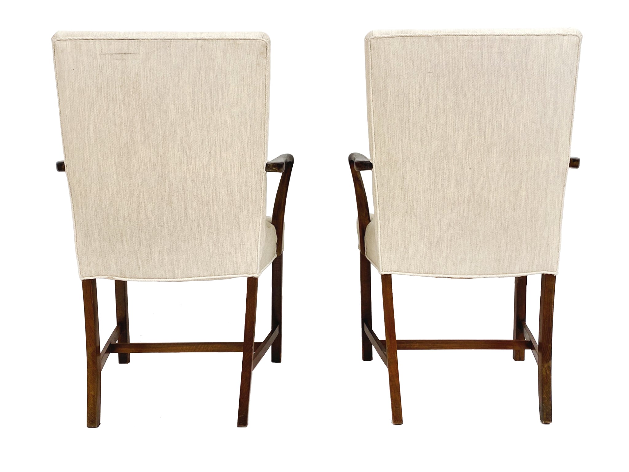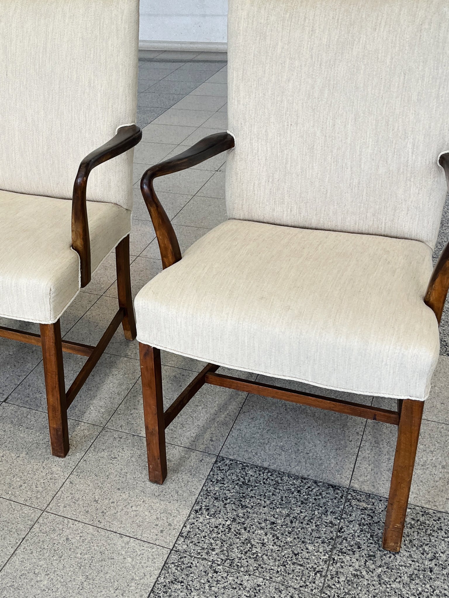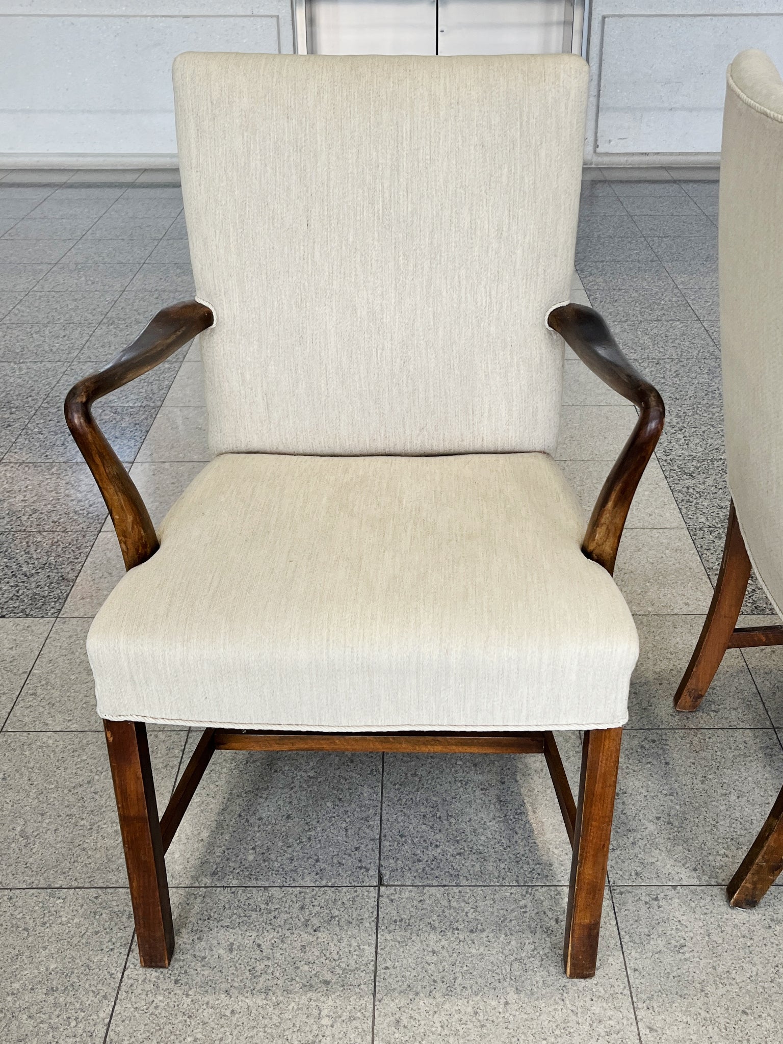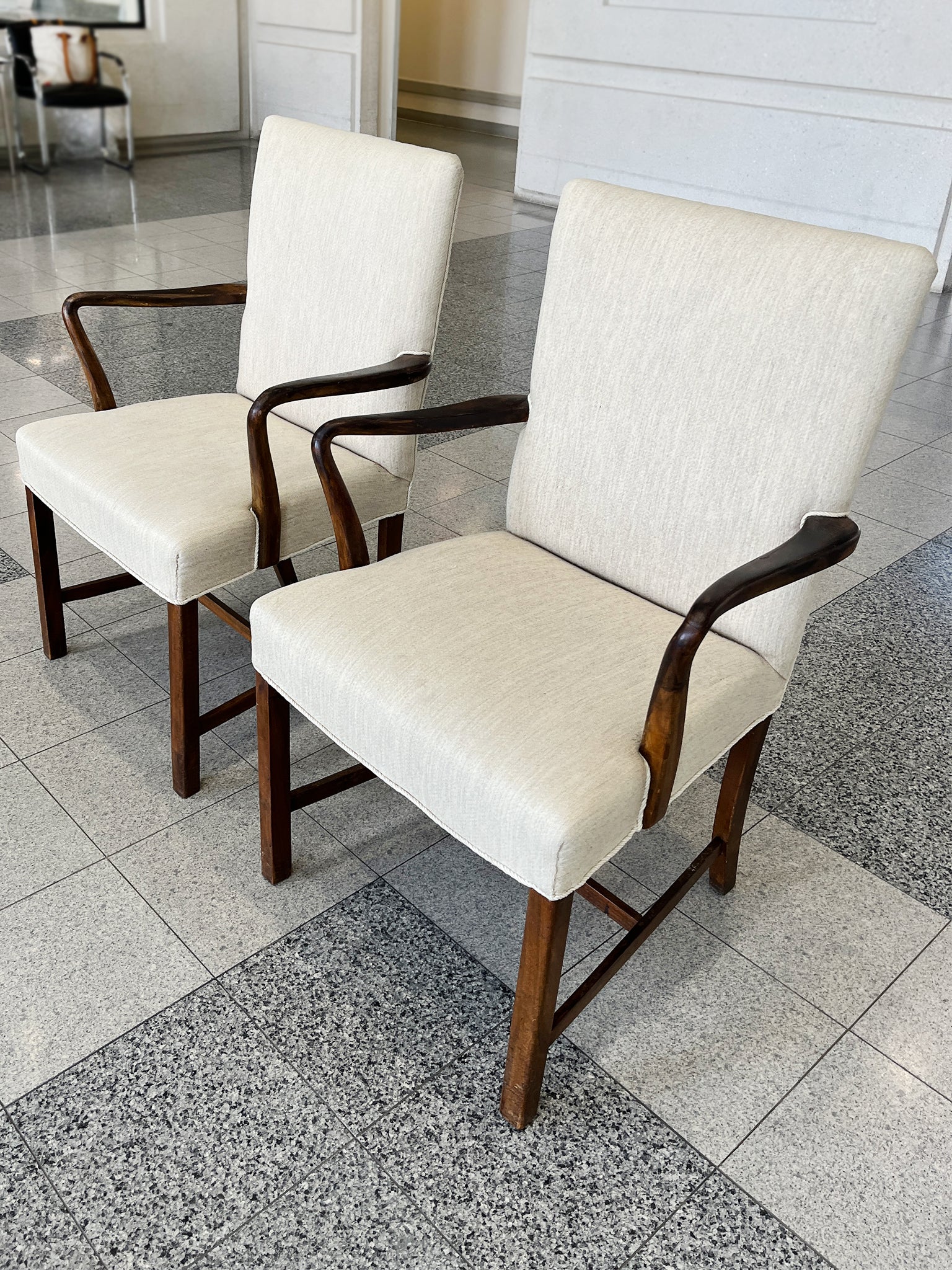 Originally crafted in the 1940s in Denmark, these two Fritz Hansen-style armchairs consist of mahogany frames and light beige wool upholstery. Expert woodwork lends the overall design an easy appearance, with curved arms and streamlined angular legs supported by stretcher bars. These chairs are a great candidate for future re-upholstery work, but they are outstanding as they are.