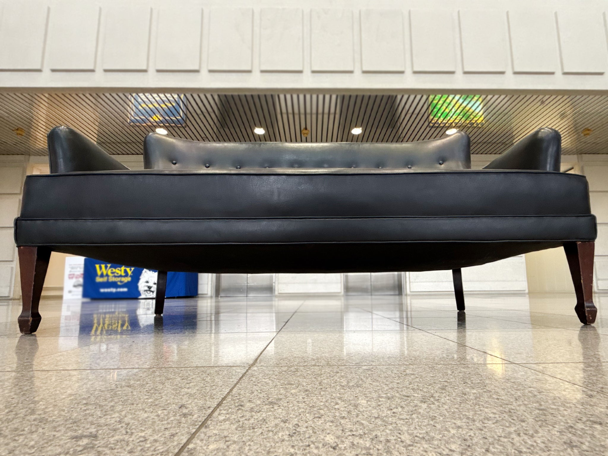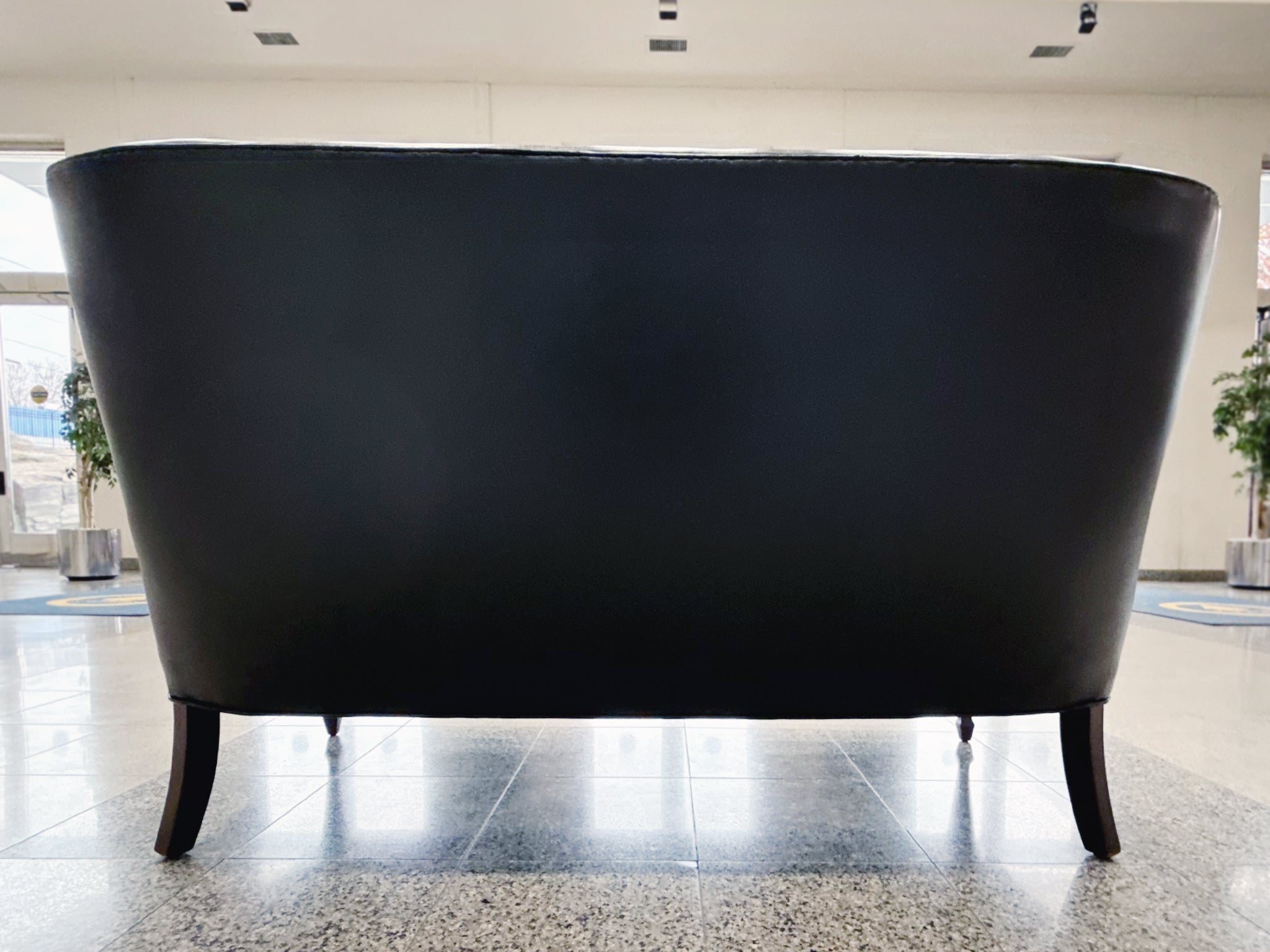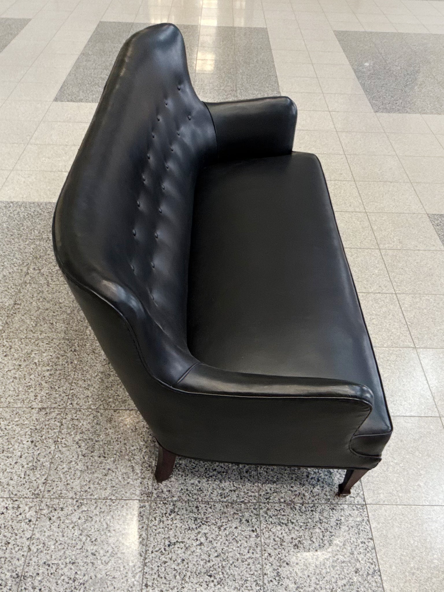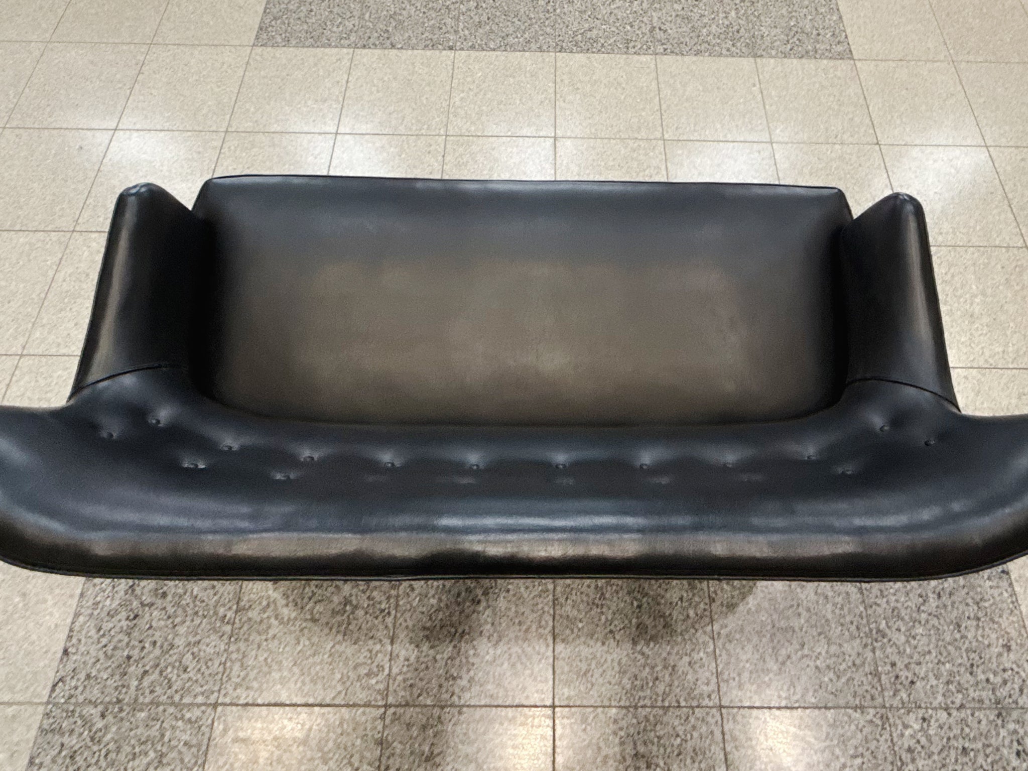 Made in the 1940s, this black leather settee was designed and produced by the Danish cabinetmaker Georg Kofoed. Minimalist in design, the settee offers some subtle drama with its sloping arms, winged corners, and elegant button-tufted backrest. The legs are beechwood and give the settee some height. Overall, this vintage two-sitter is a comfortable, well-designed settee, perfect for smaller spaces.
