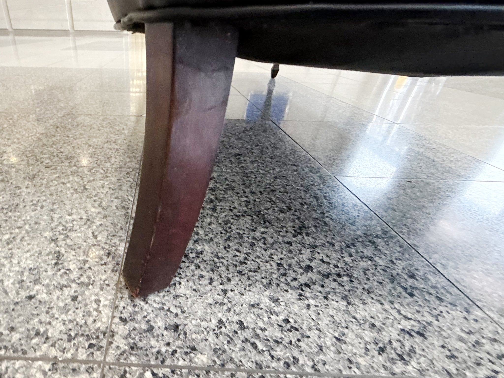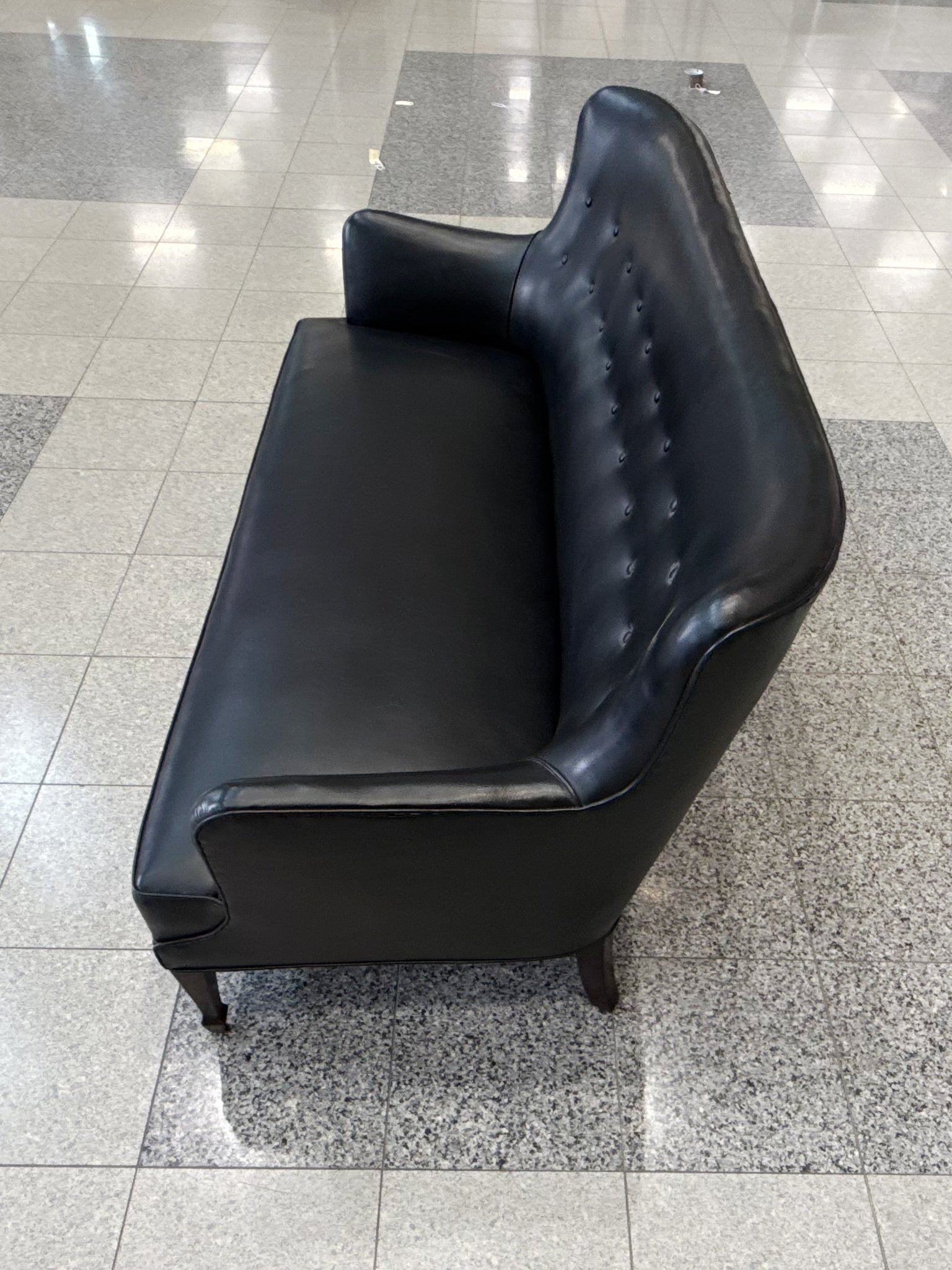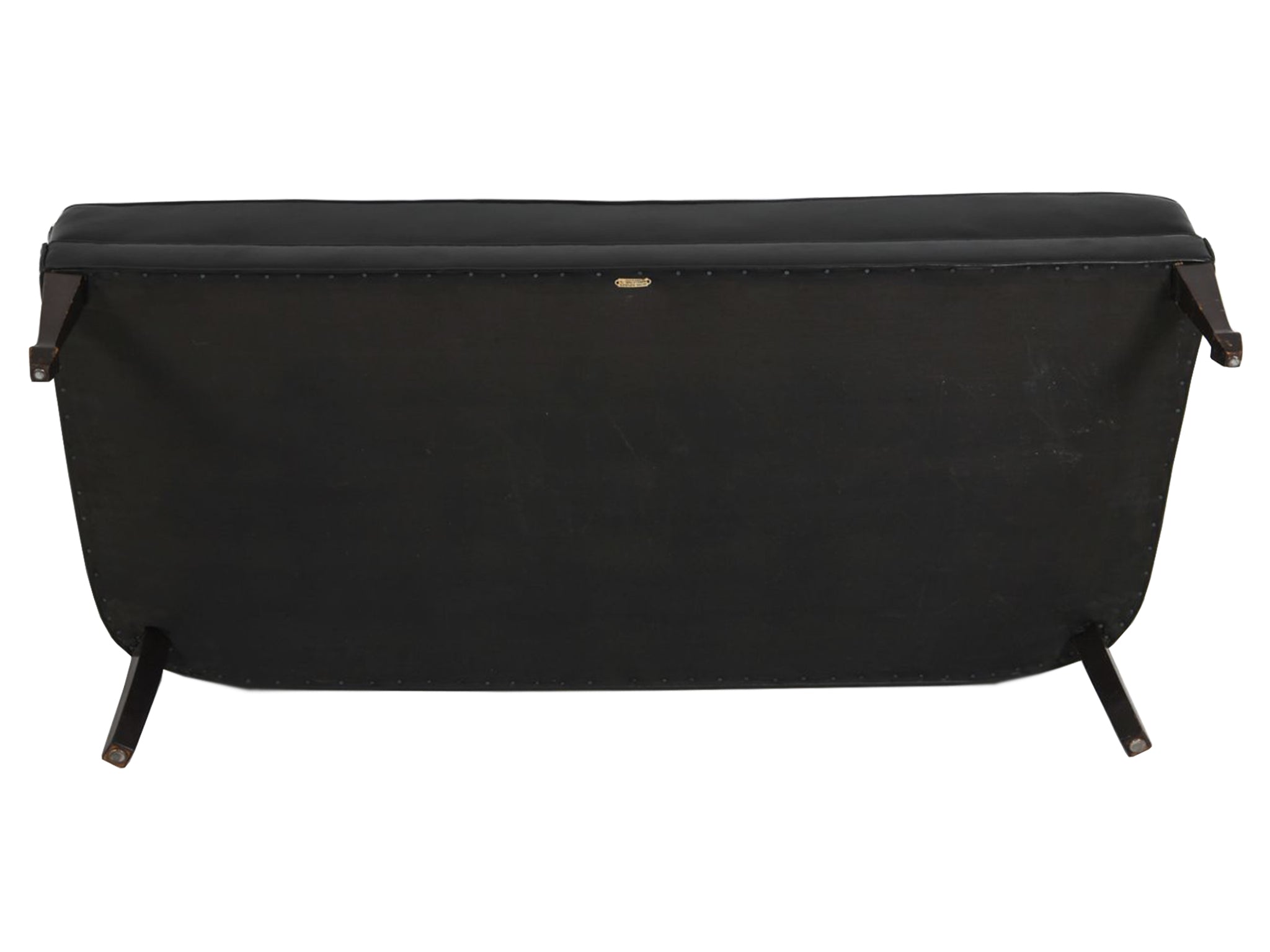 In overall good condition and structurally sound. Minor scuffs to legs and general wear to leather consistent with the settee's age and use.
