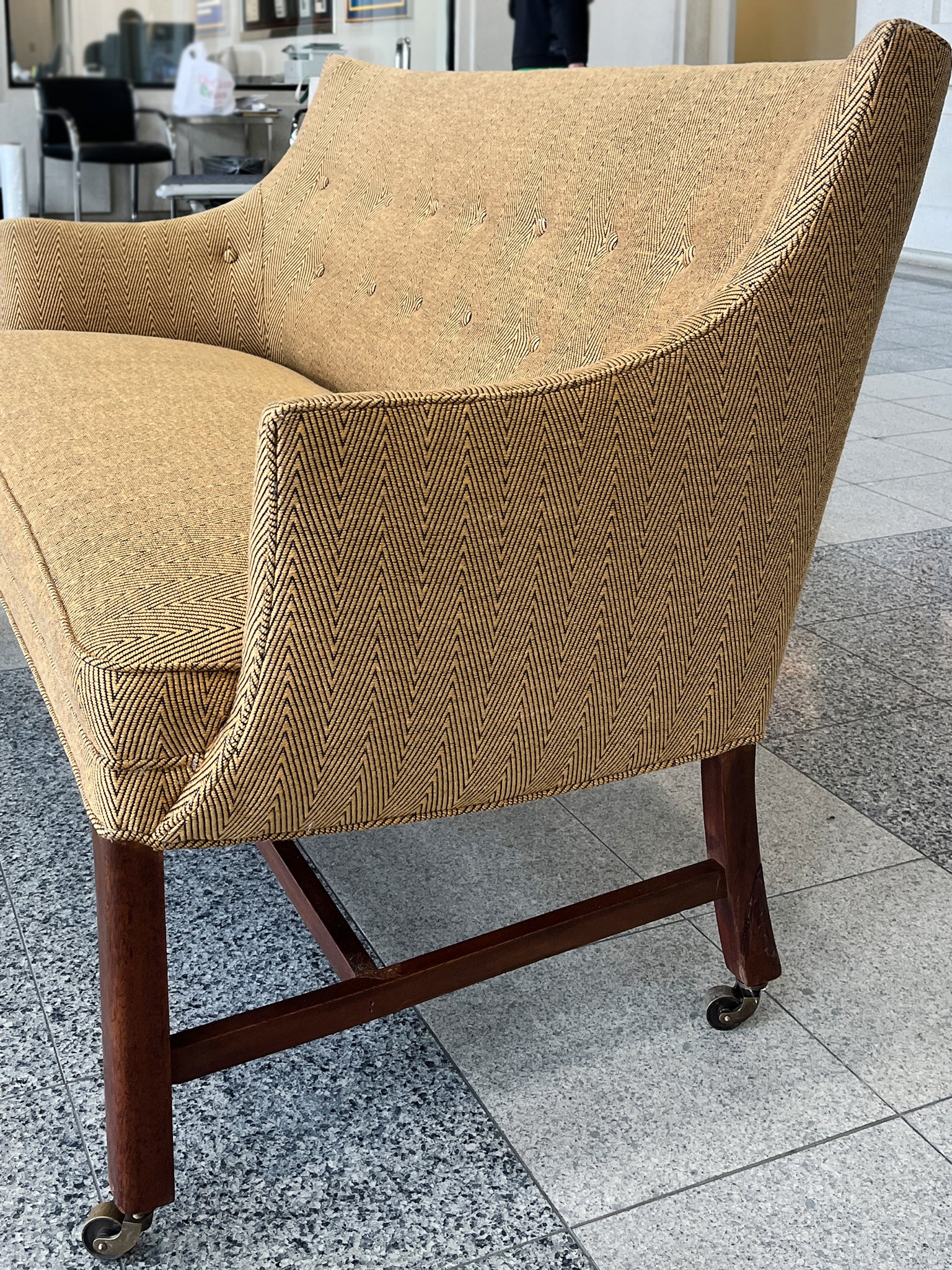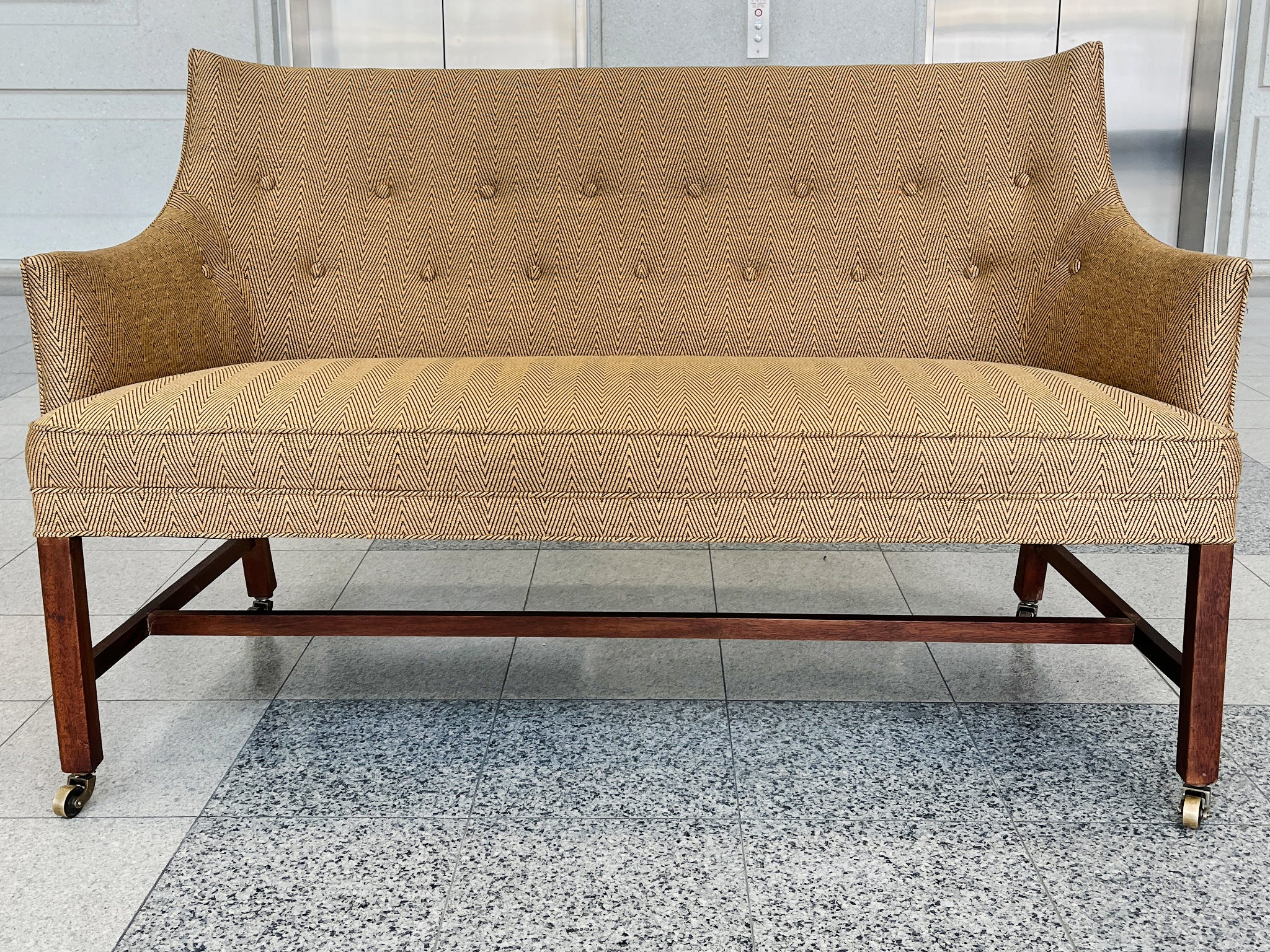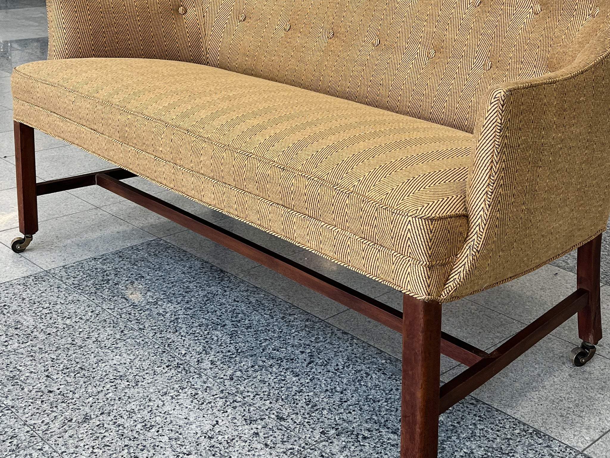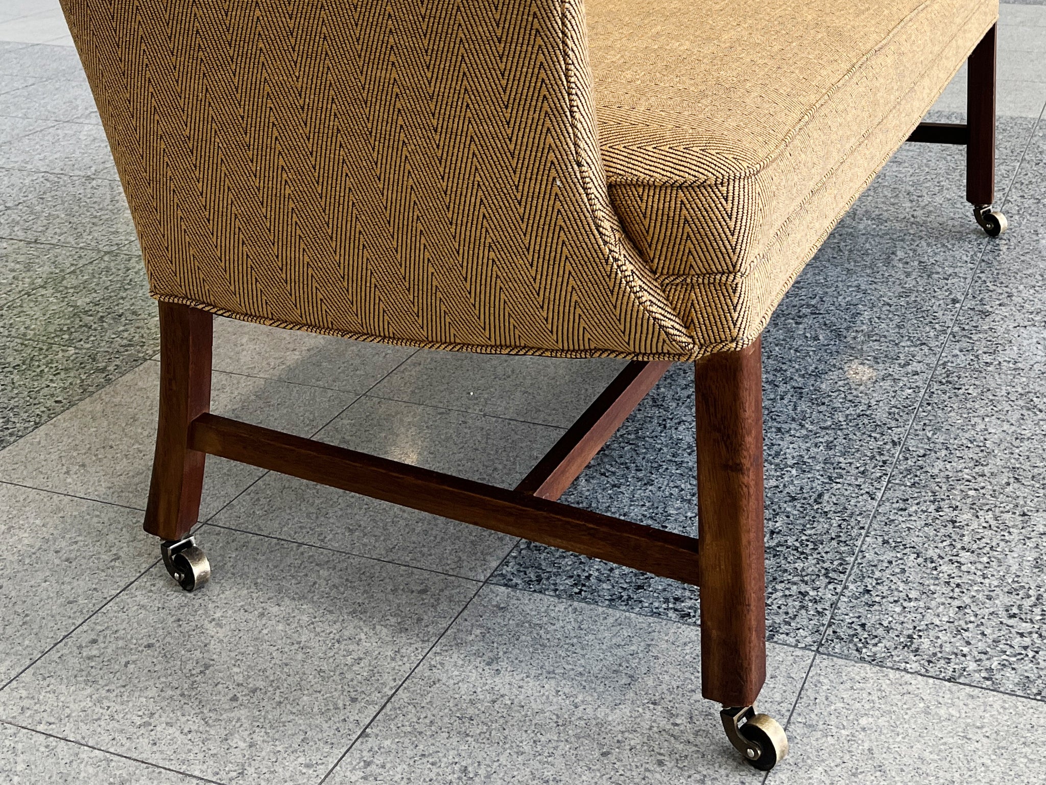 This settee was designed by Frits Henningsen in the 1940s. The simplified lines you'd expect from modern furniture are tempered by rounded forms and curves in Henningsen's design. The settee has been newly reupholstered with a gold-and-black chevron wool from...