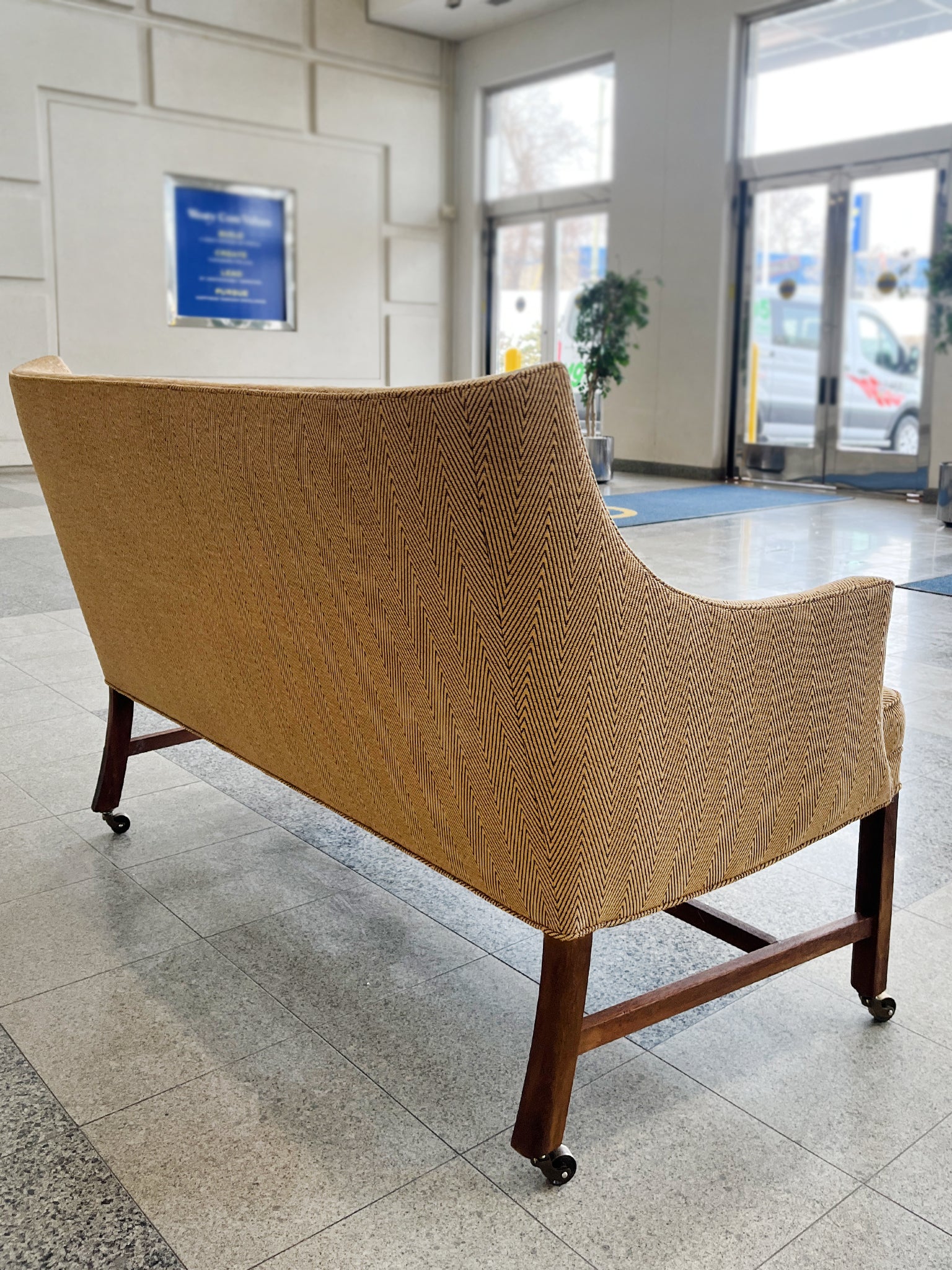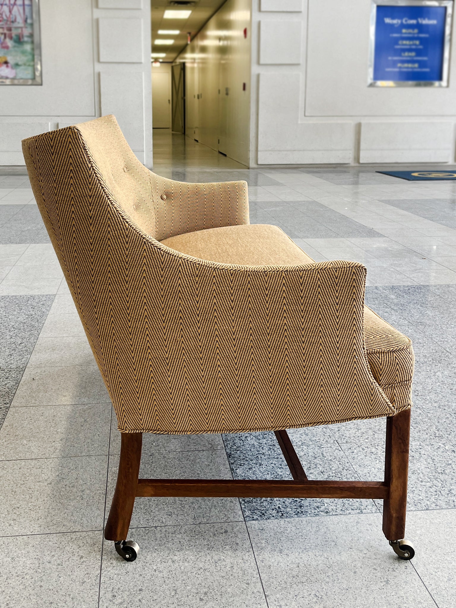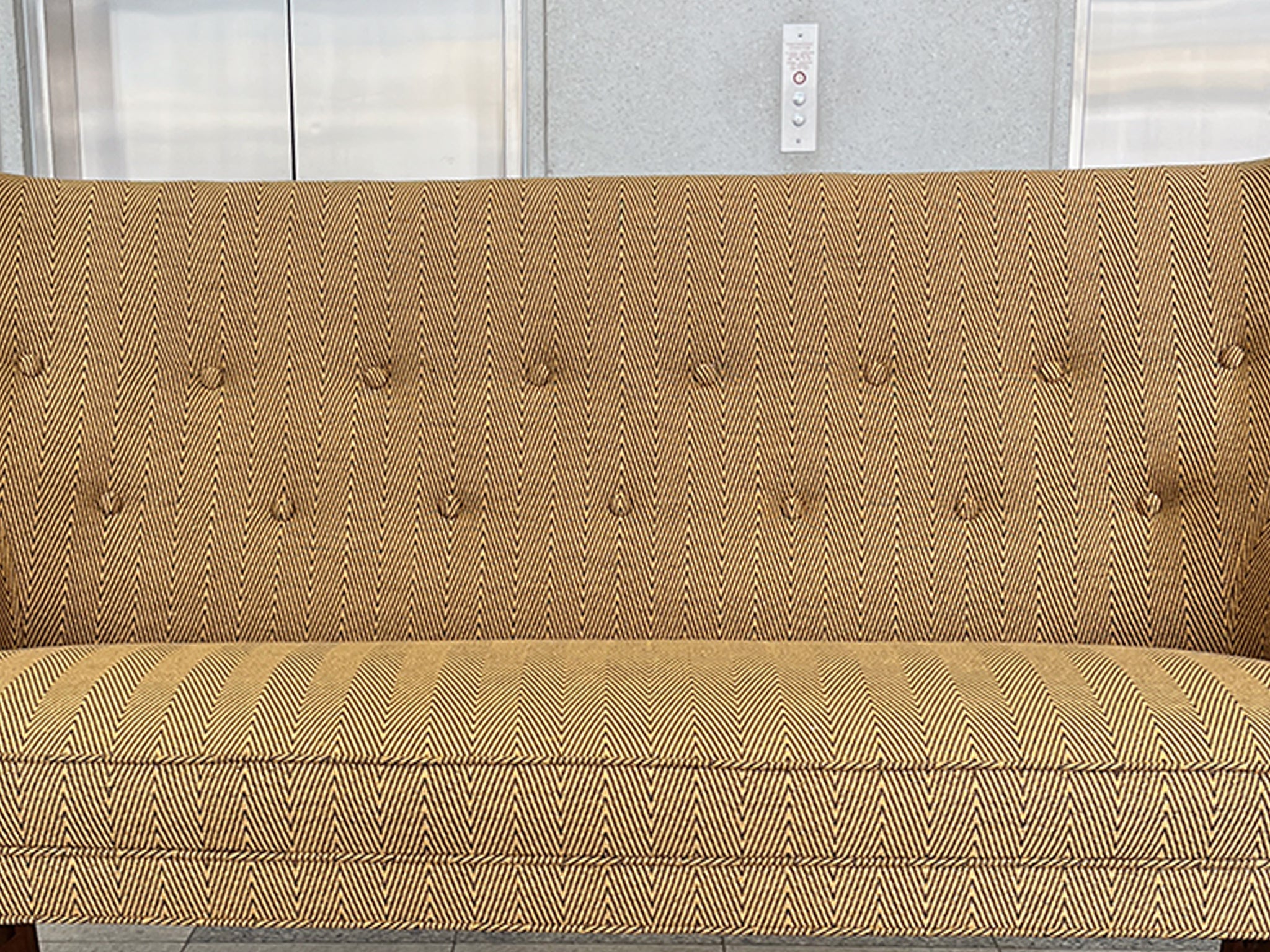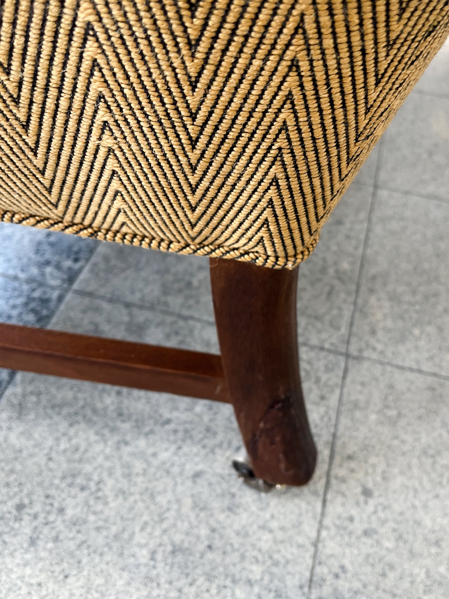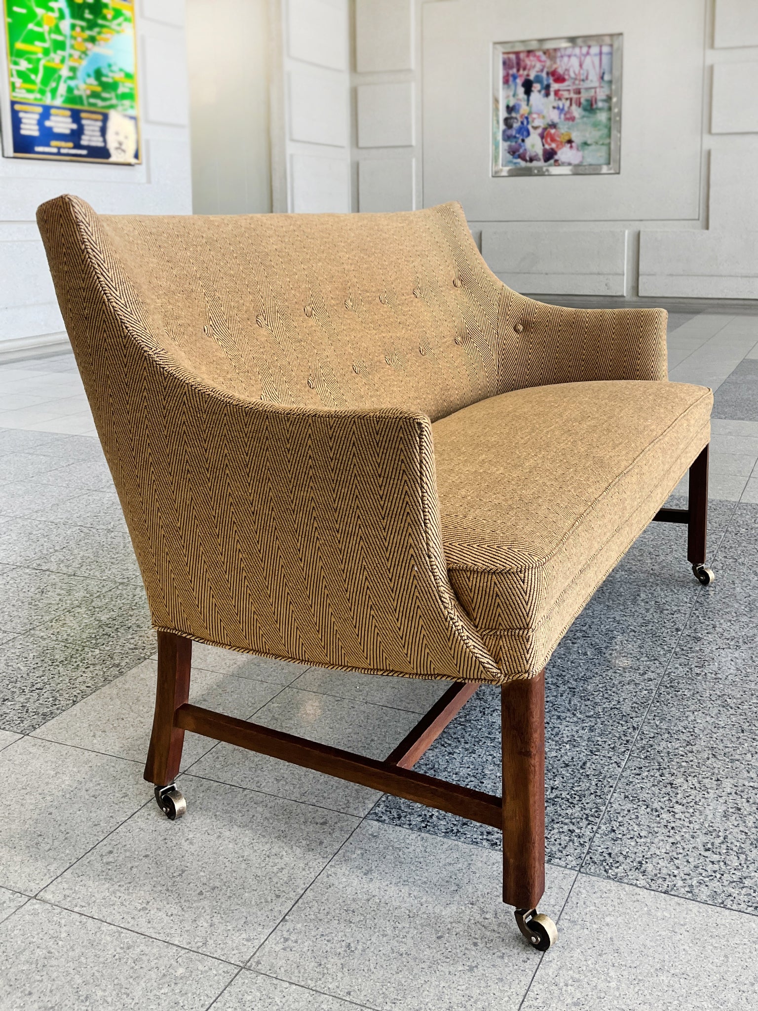 This settee was designed by Frits Henningsen in the 1940s. The simplified lines you'd expect from modern furniture are tempered by rounded forms and curves in Henningsen's design. The settee has been newly reupholstered with a gold-and-black chevron wool from...