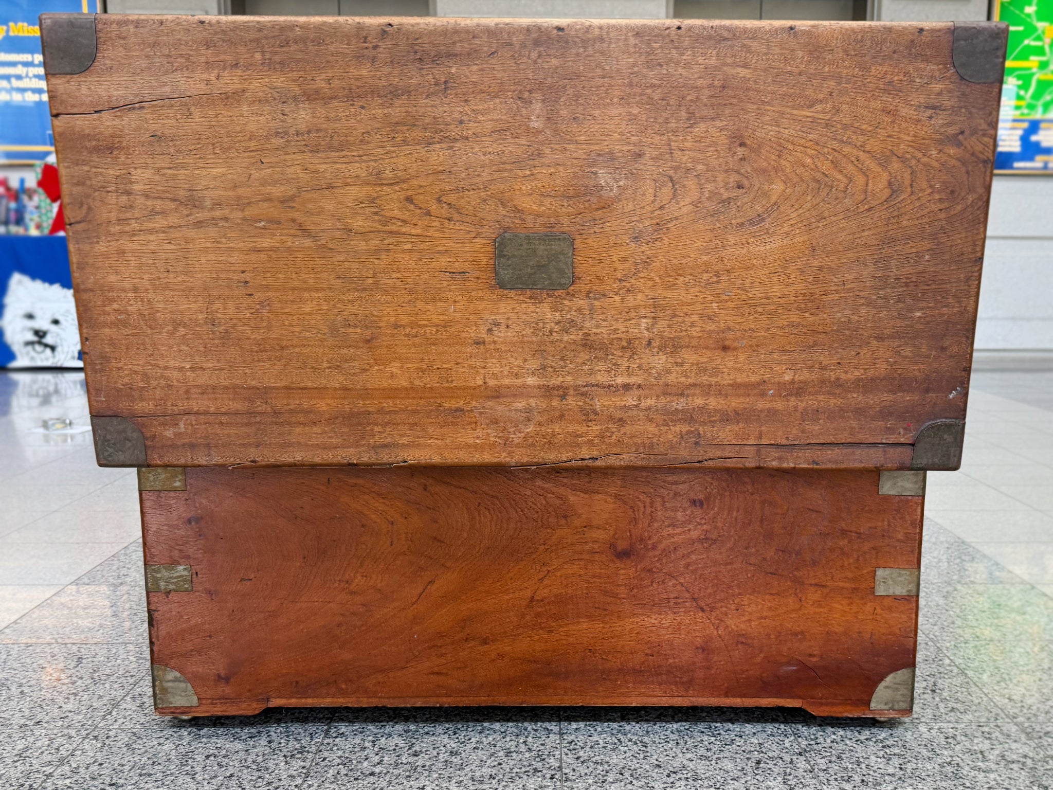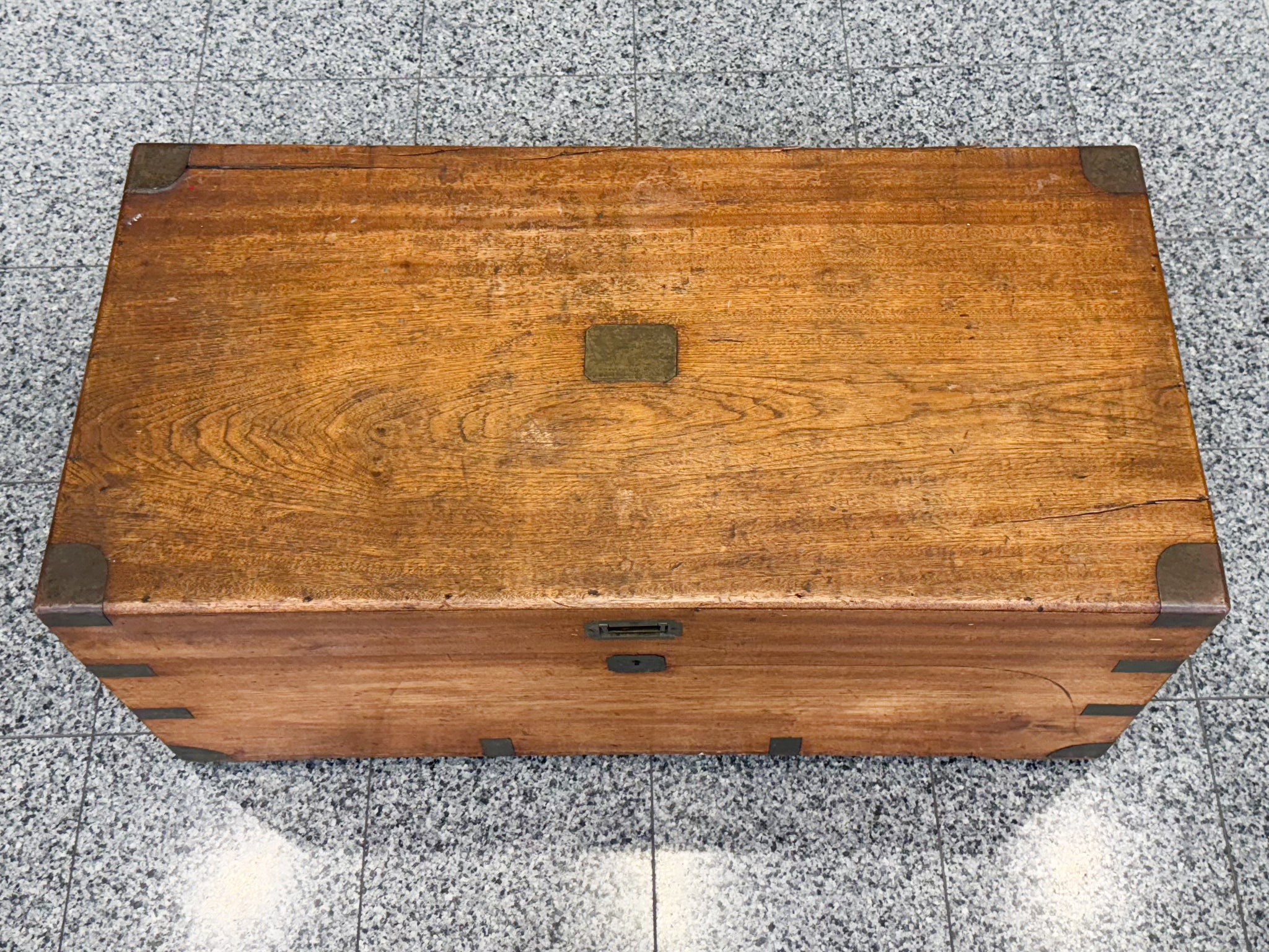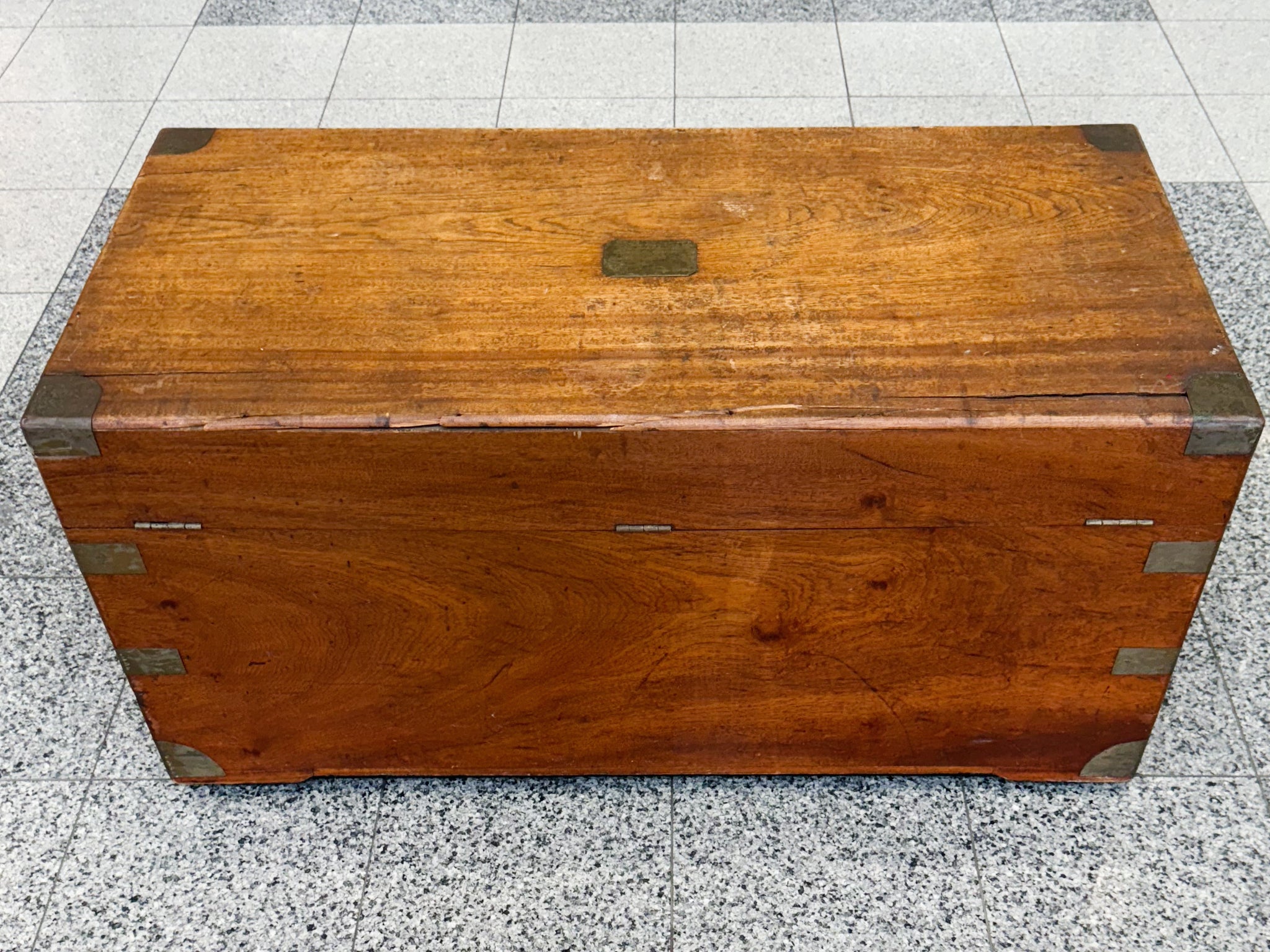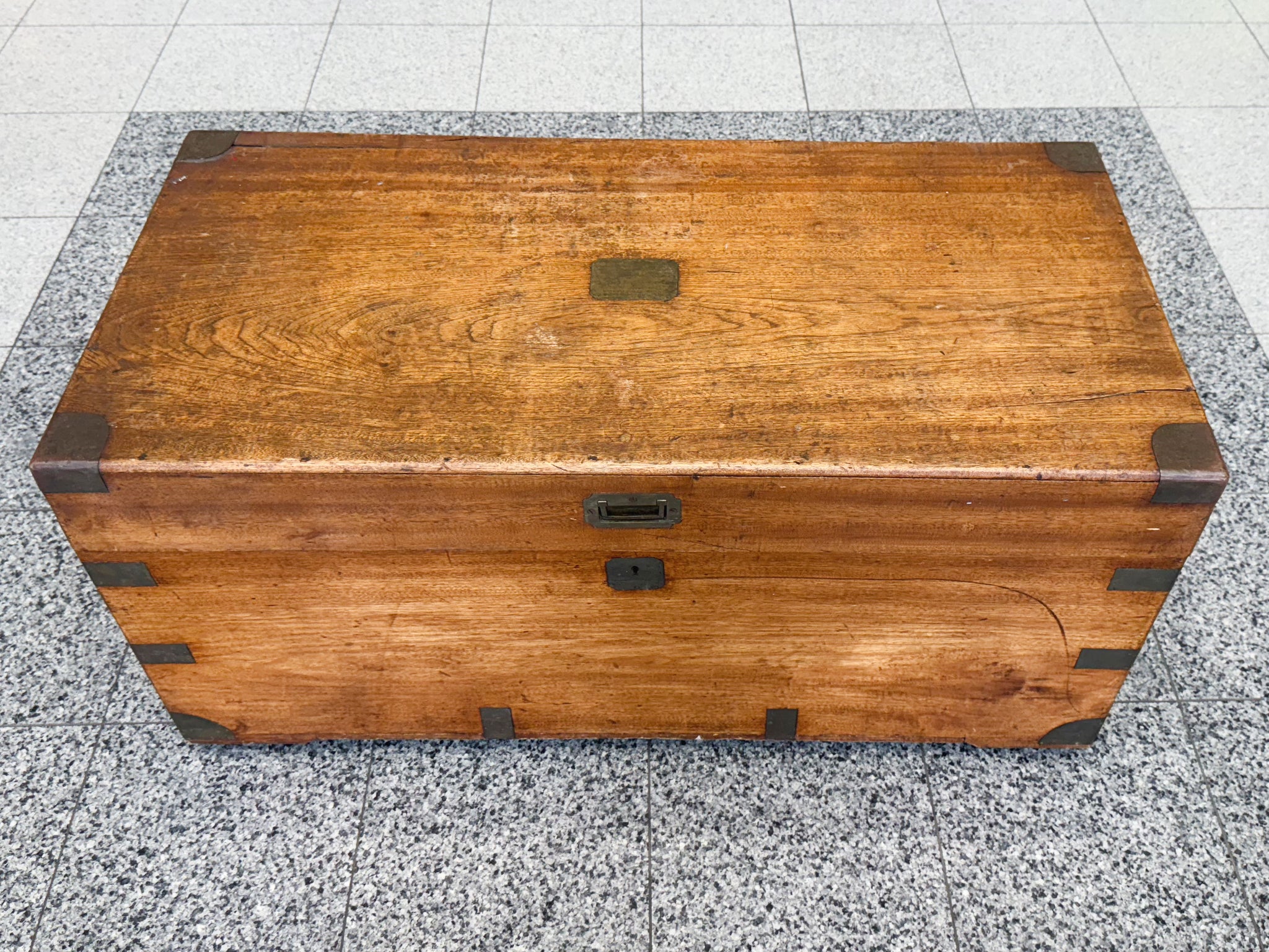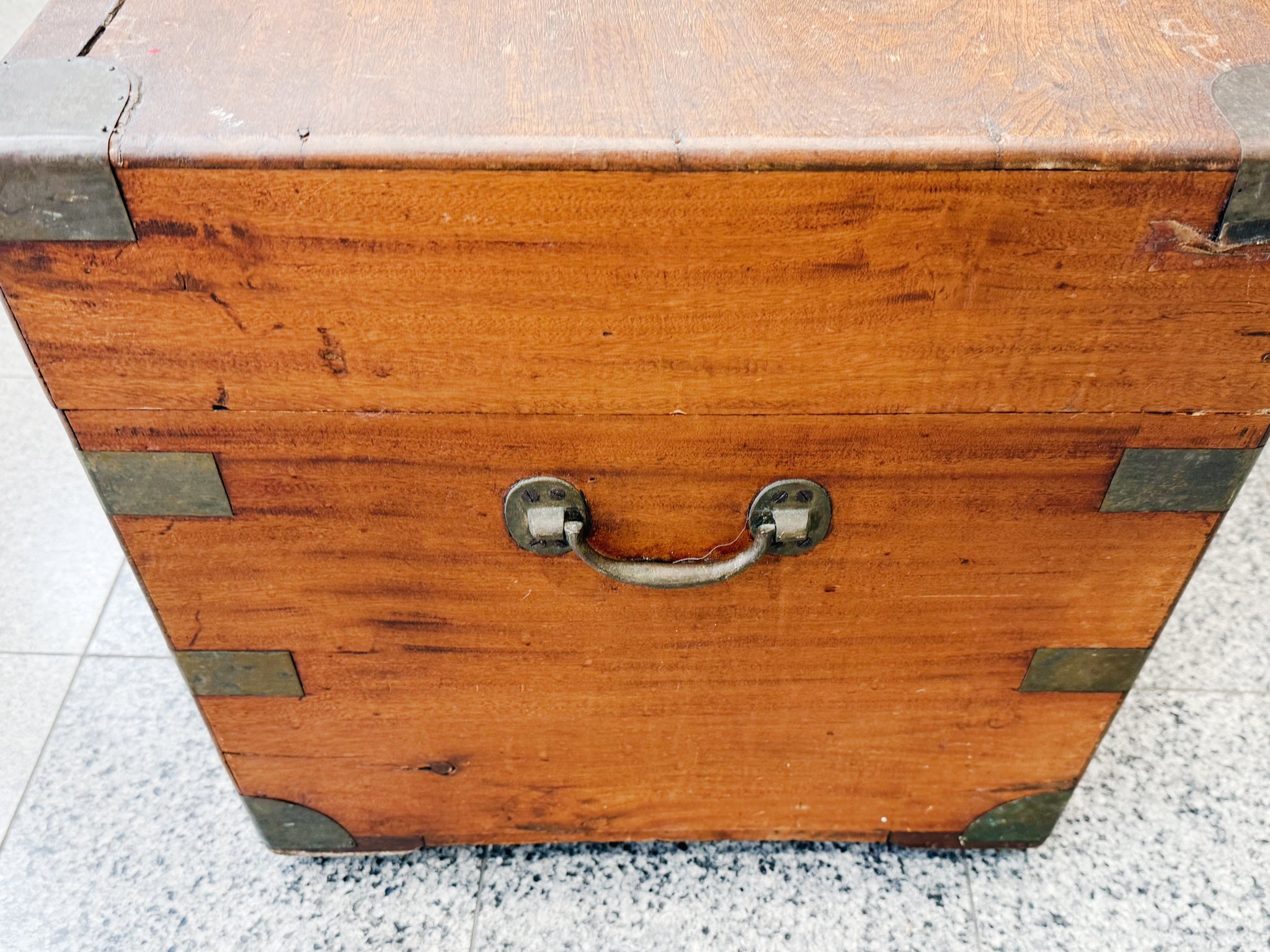 Hand-crafted in the 19th Century, this English campaign chest is made of sturdy camphor wood with brass mounts and hardware. The wood has aged beautifully over the years. It has a rich grain patterning and warm, burnt-orange hue. Providing ample storage space, the chest can also double as a table surface.