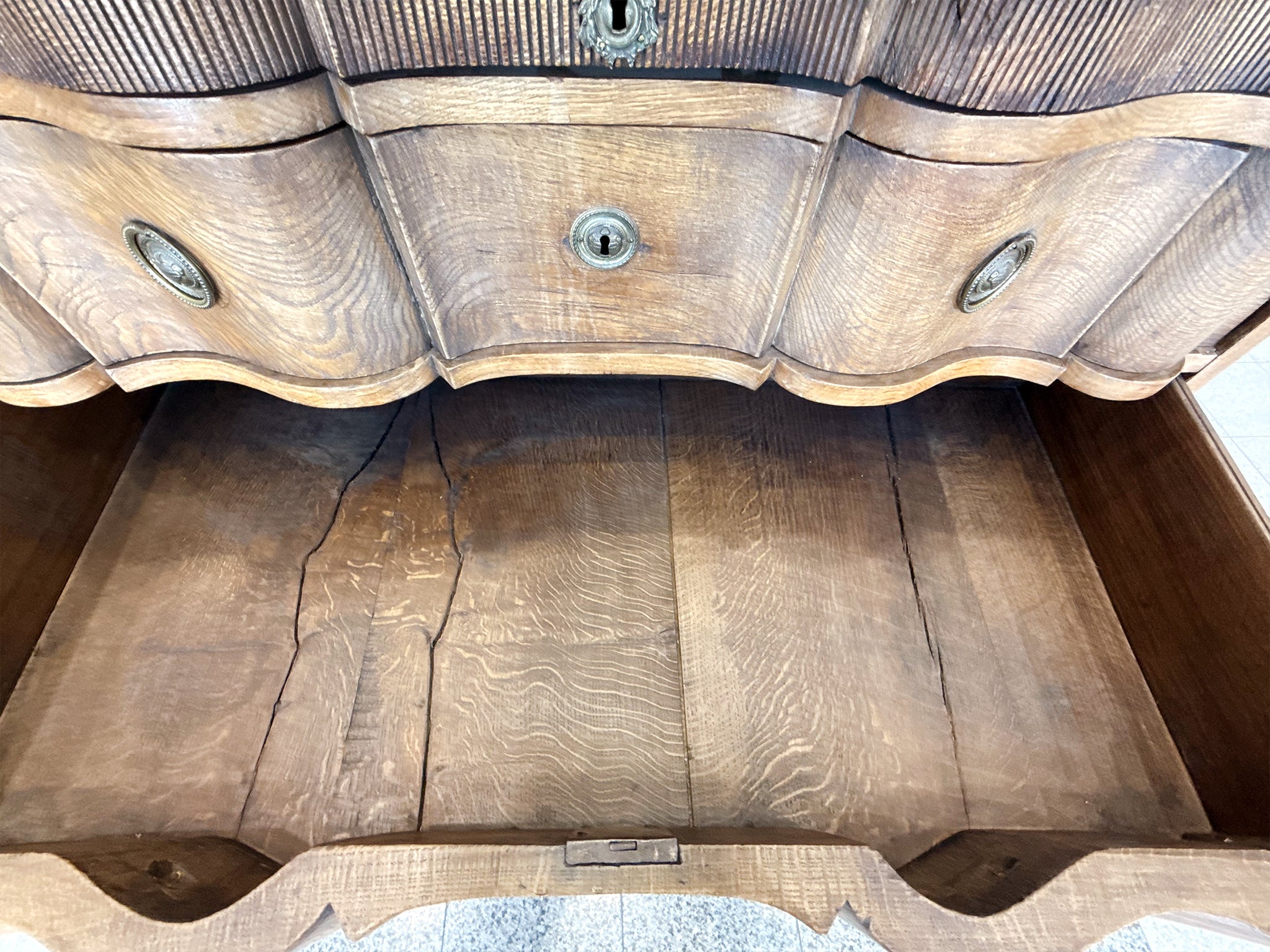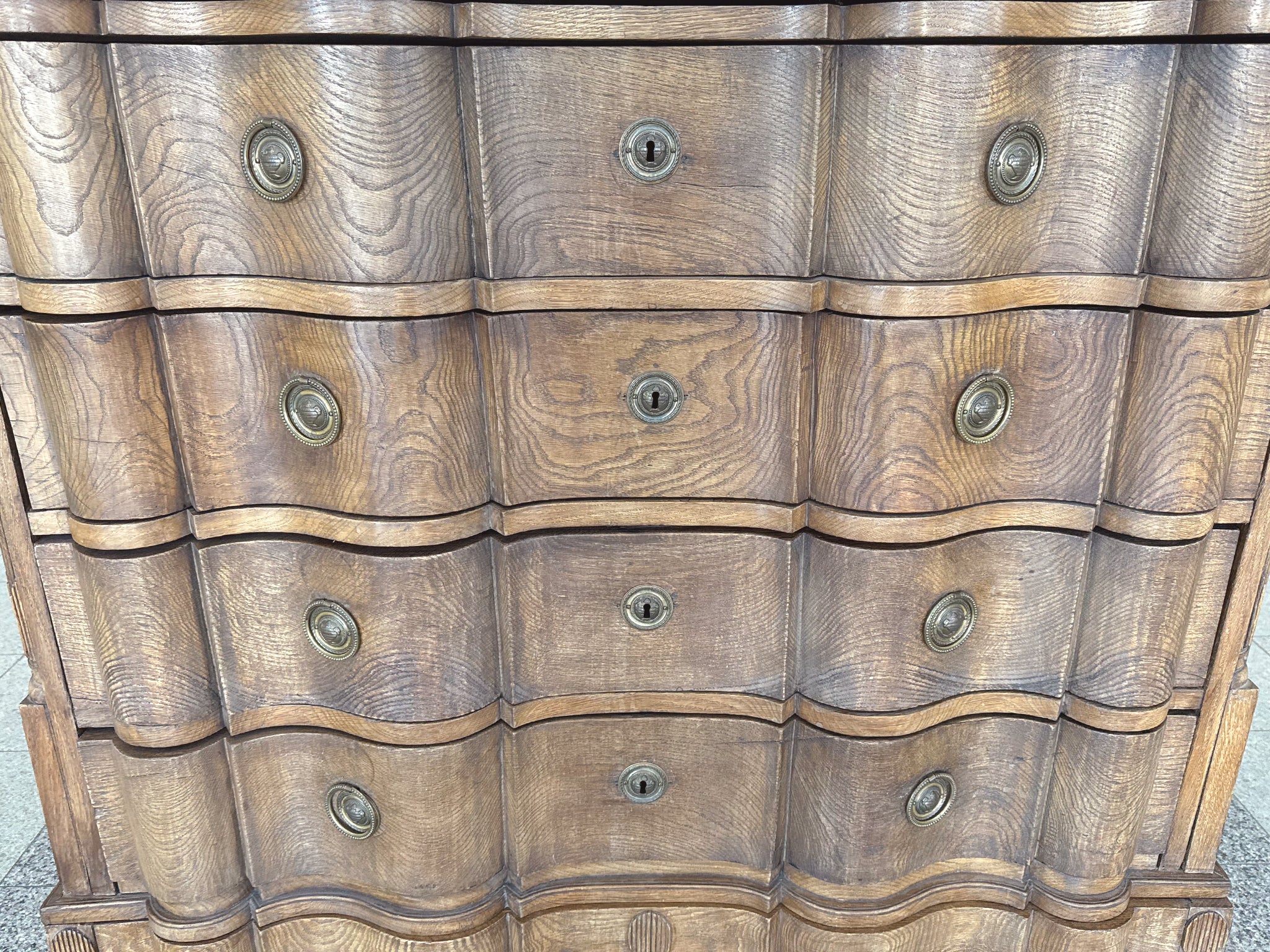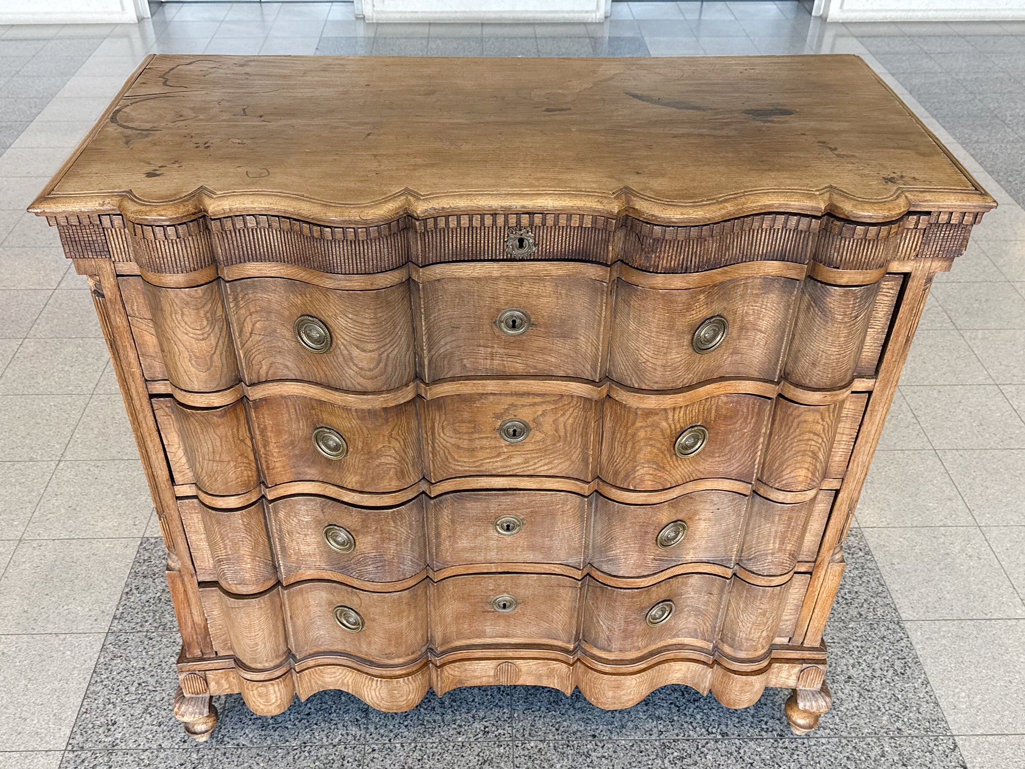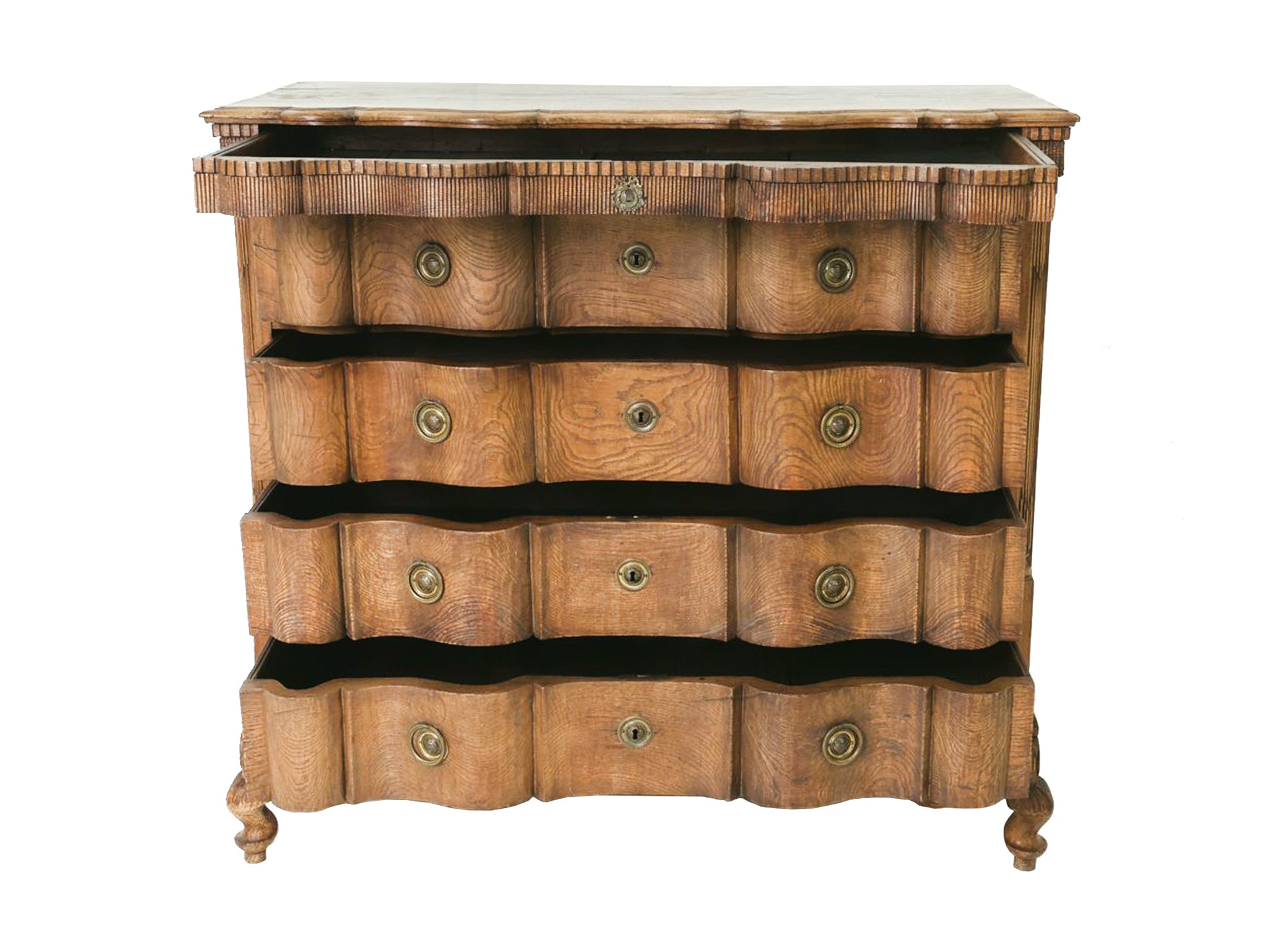 This antique William & Mary chest of drawers was hand-crafted from black oak wood in the 18th Century. The wood has a warm red-brown tone and has aged beautifully, accruing a textured patina. While the overall design is characterized by...