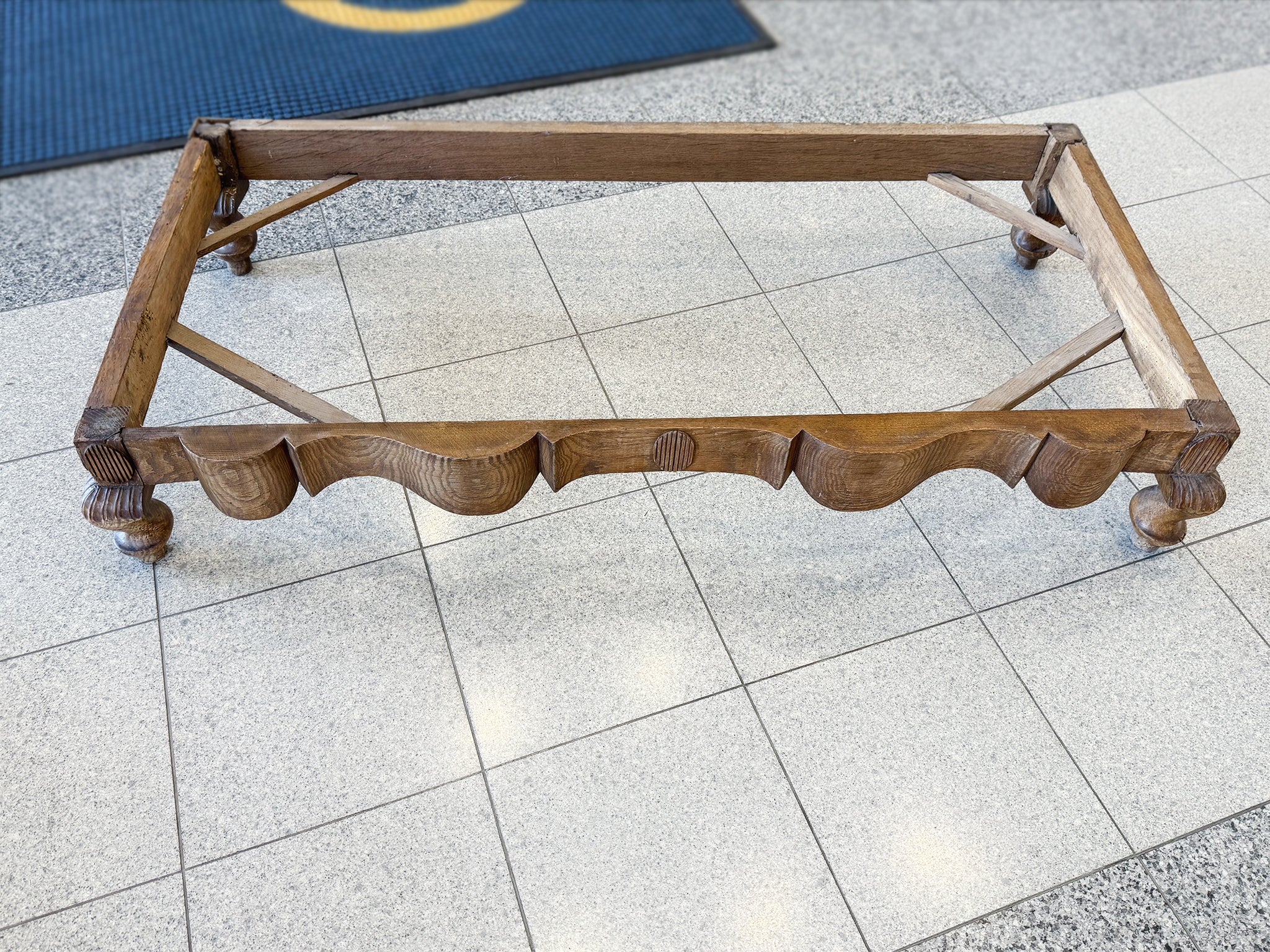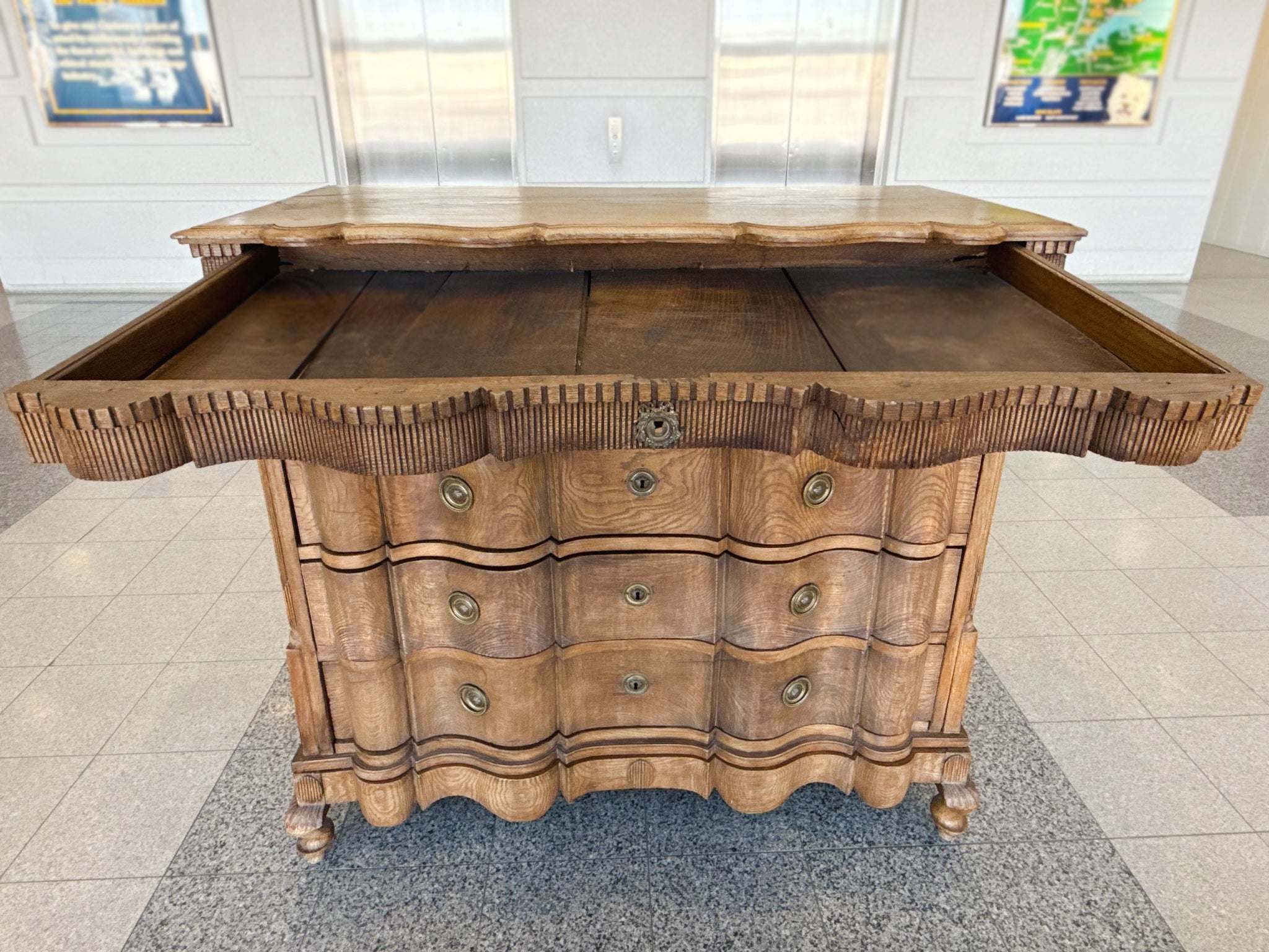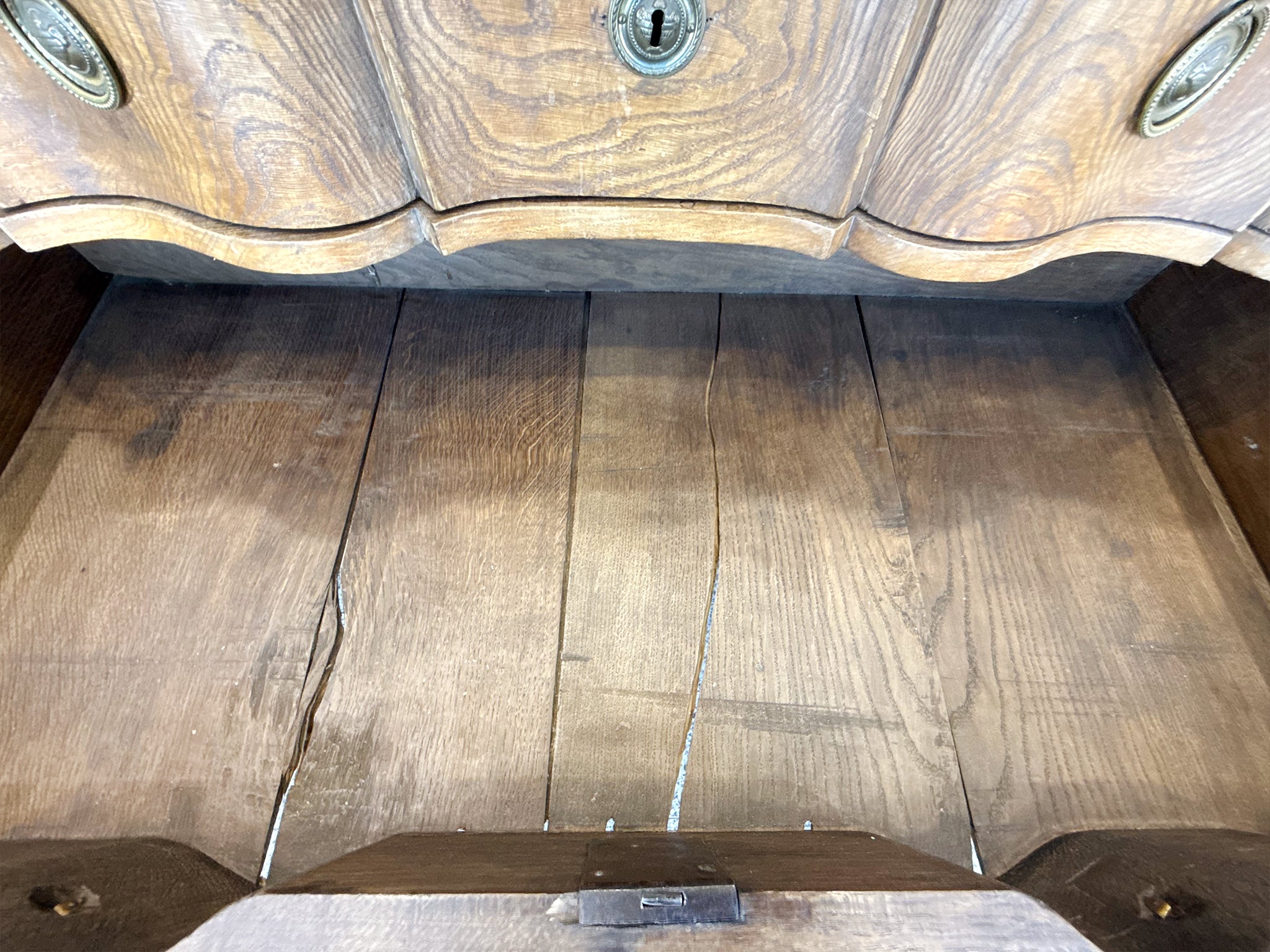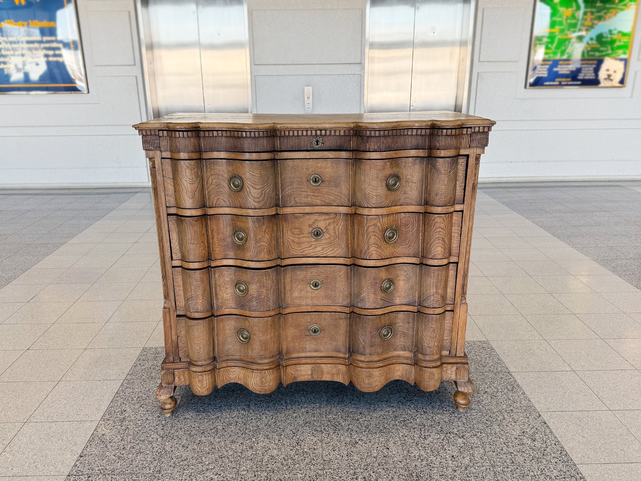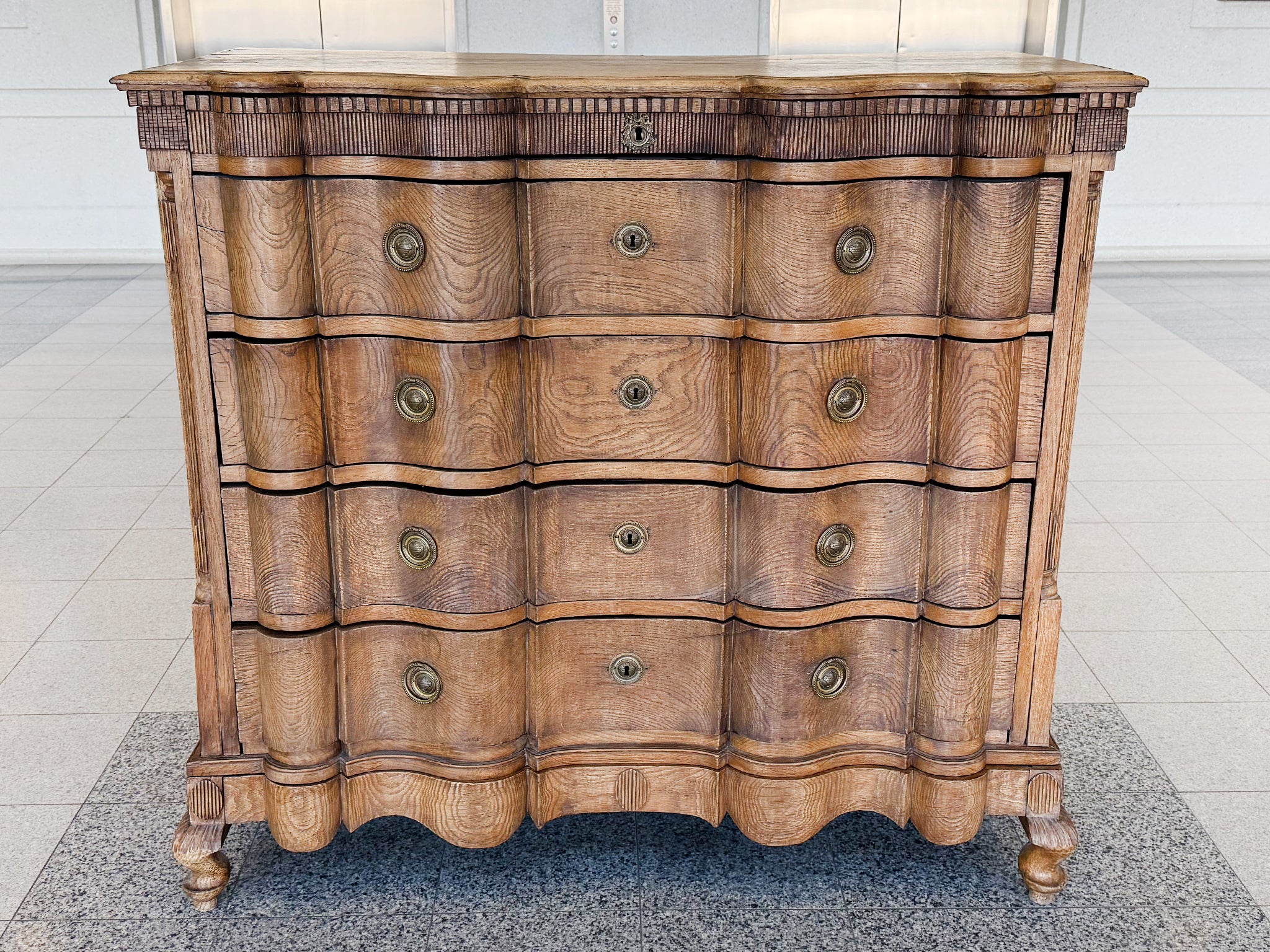 This antique William & Mary chest of drawers was hand-crafted from black oak wood in the 18th Century. The wood has a warm red-brown tone and has aged beautifully, accruing a textured patina. While the overall design is characterized by...