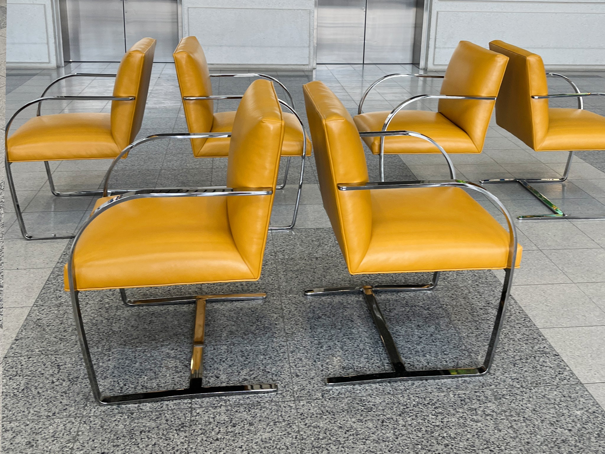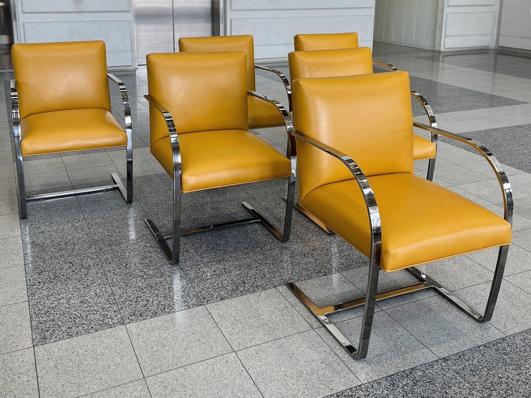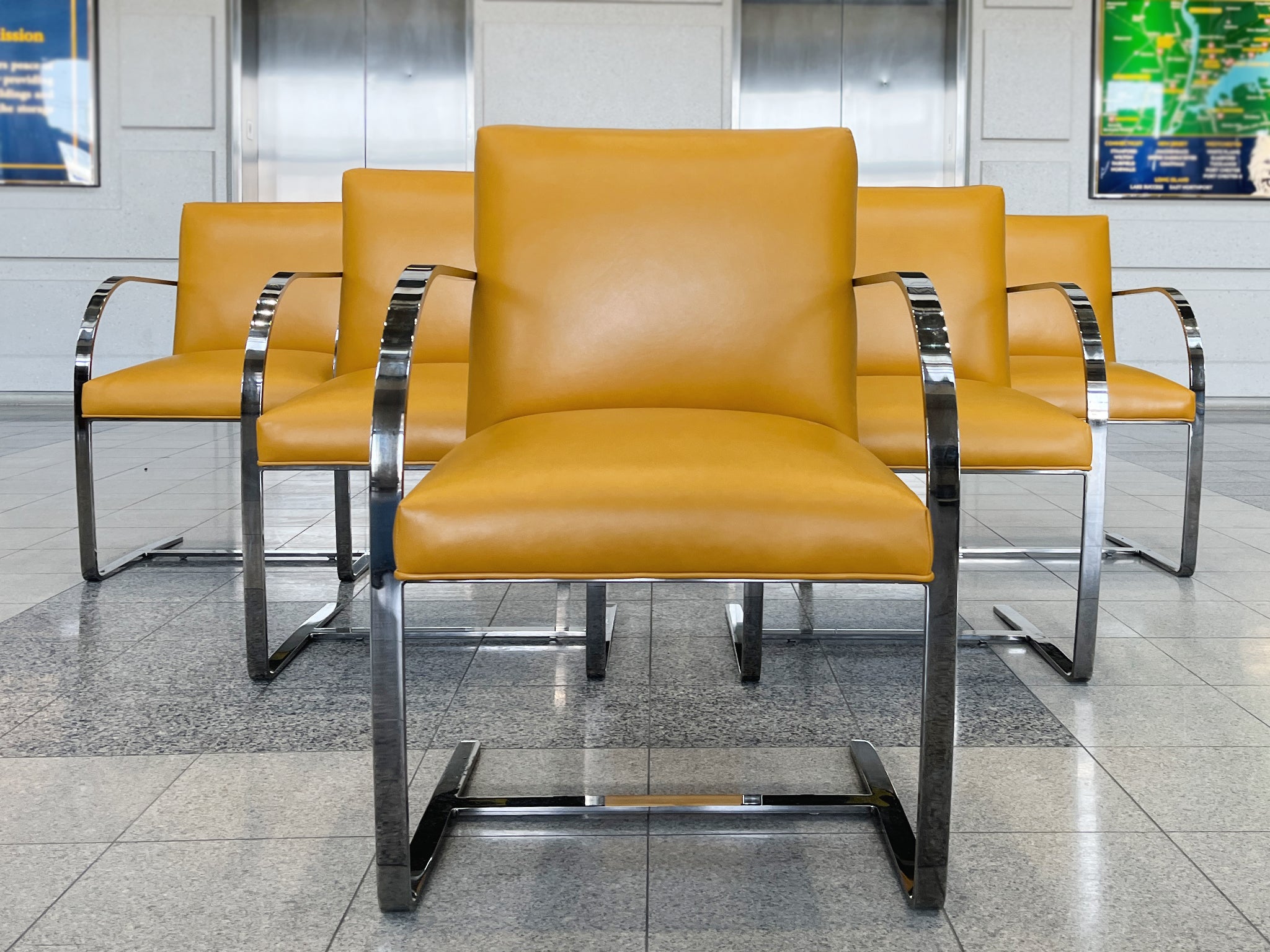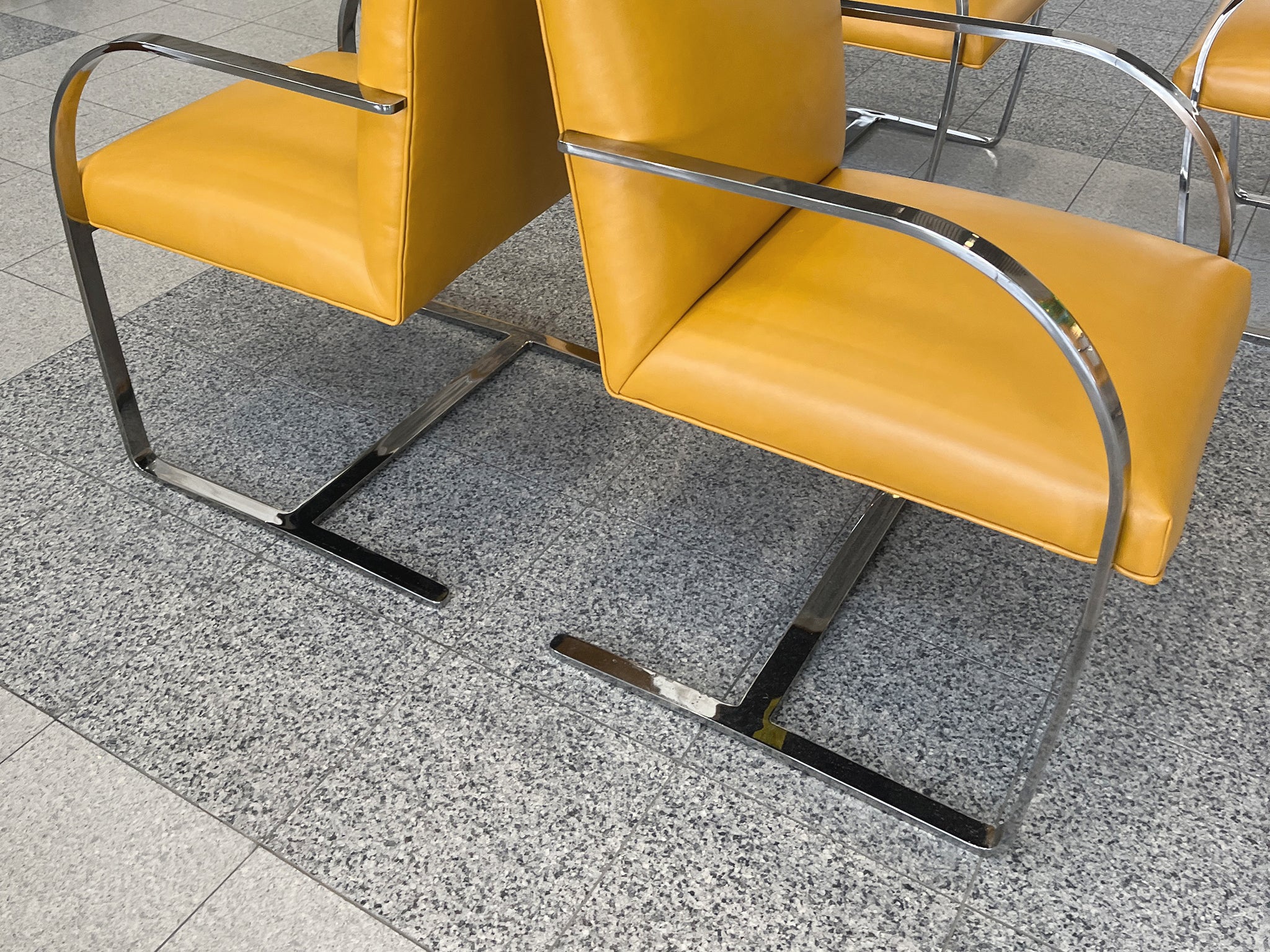 This set of 6 chairs takes after the iconic Brno chairs originally designed by Ludwig Mies van der Rohe and Lilly Reich in the 1920s. They are a classic design using cantilevered steel frames that give the chairs the appearance of floating. The frames are also noteworthy for their sturdy flat bar construction. This set has been reupholstered in bright yellow leather by Fabricut and has new underside webbing.