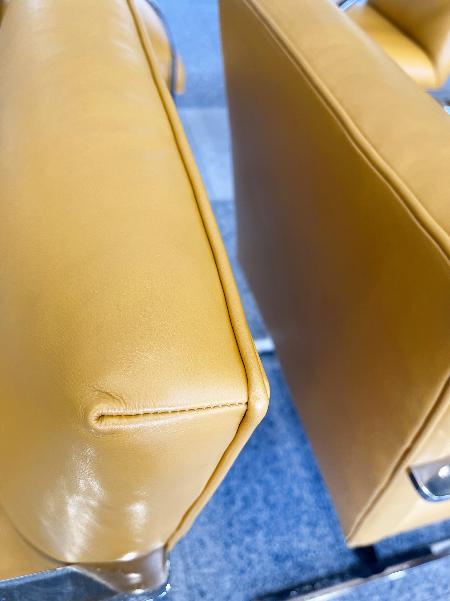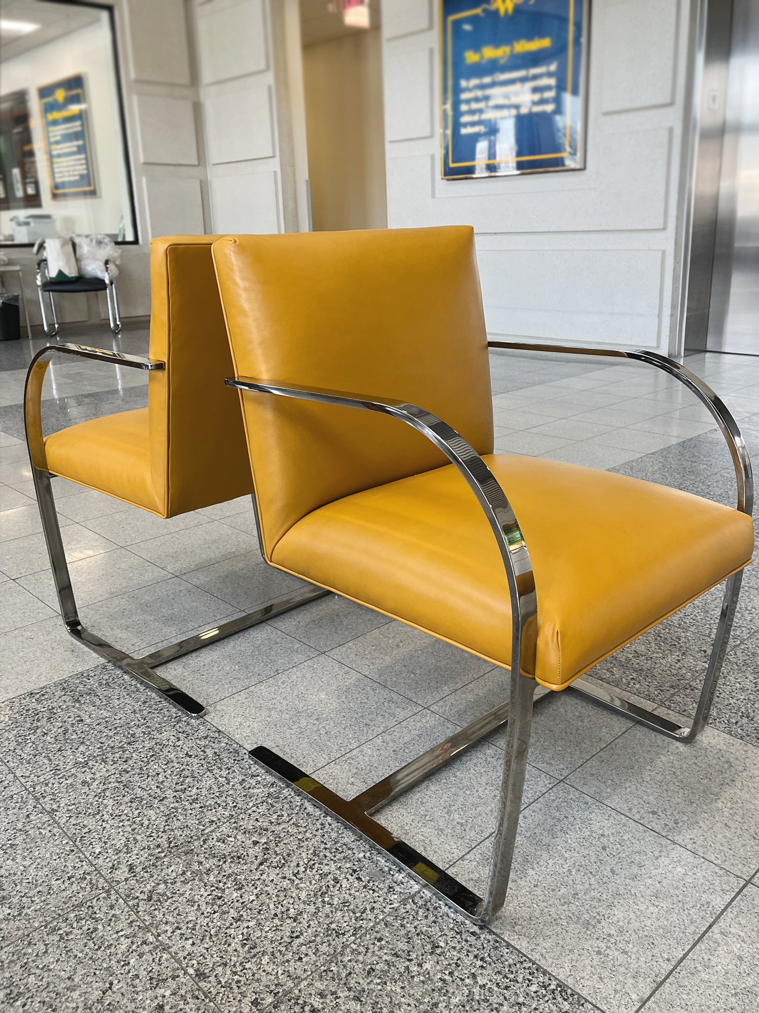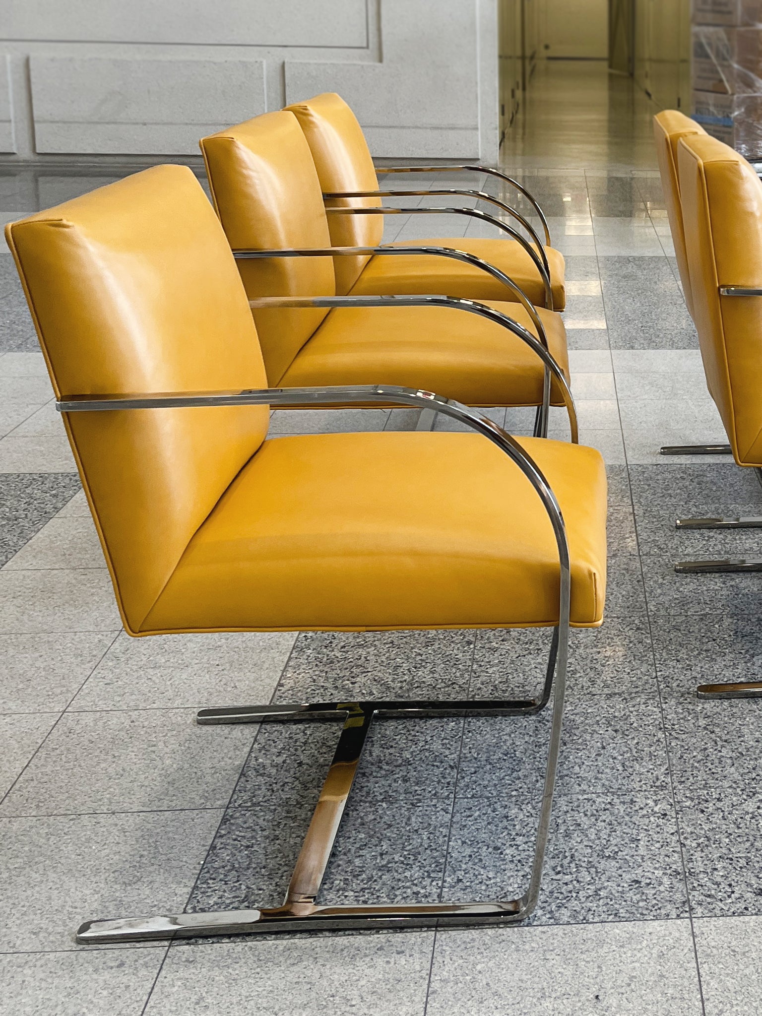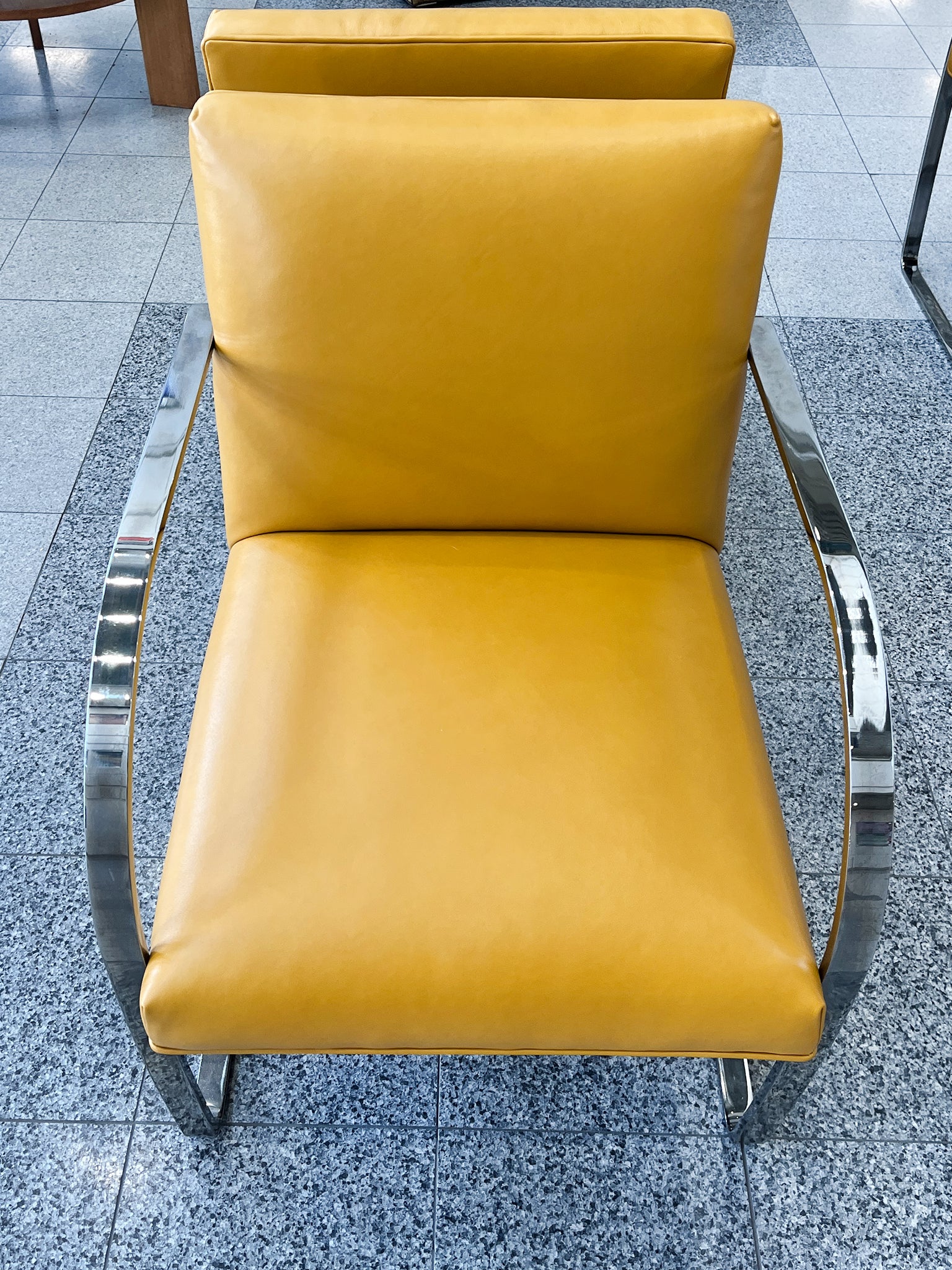This set of 6 chairs takes after the iconic Brno chairs originally designed by Ludwig Mies van der Rohe and Lilly Reich in the 1920s. They are a classic design using cantilevered steel frames that give the chairs the appearance of floating. The frames are also noteworthy for their sturdy flat bar construction. This set has been reupholstered in bright yellow leather by Fabricut and has new underside webbing.