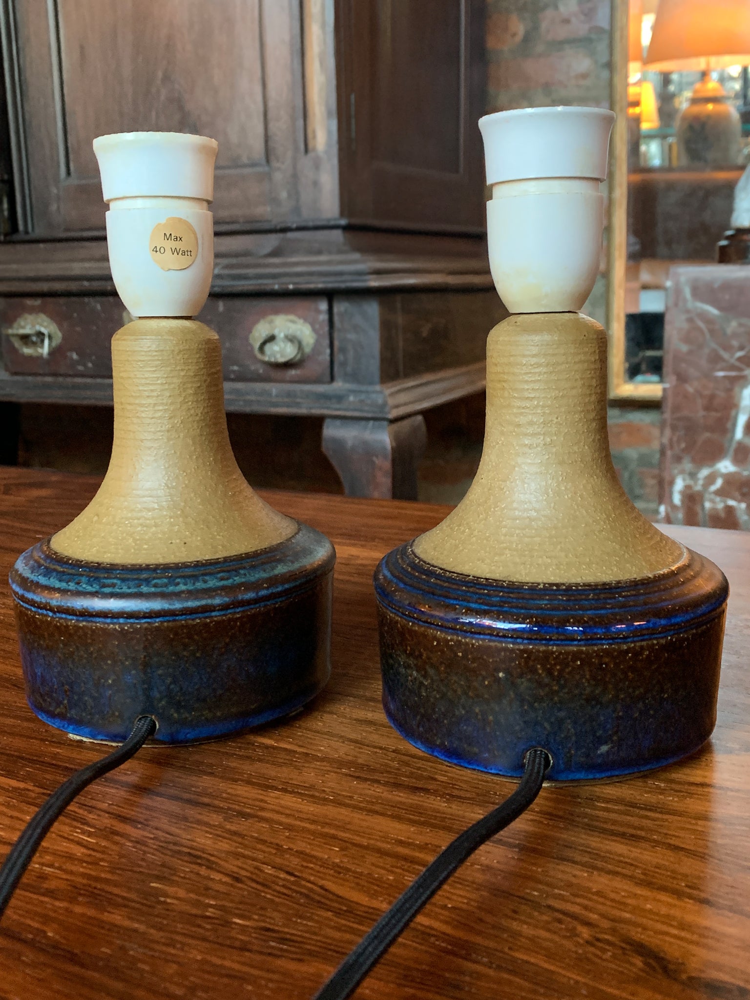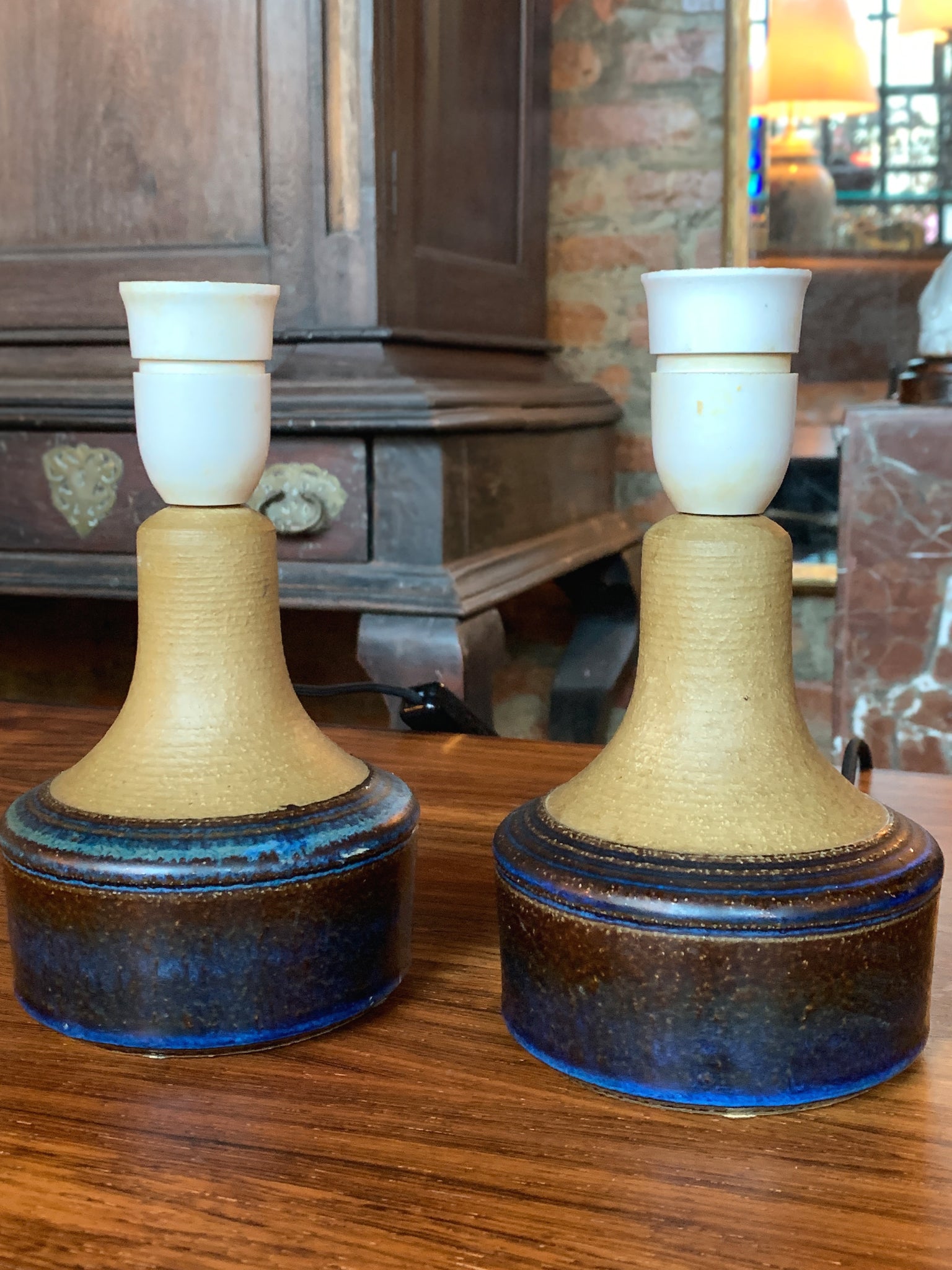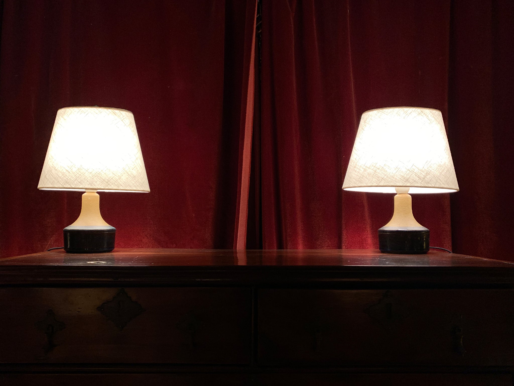 Made in the 20th Century, these charming foo dog table lamps consist of blanc de chine bodies on wooden bases. They are newly rewired and equipped with double bulb sockets with metal pull threads. An additional functional turn-switch is located...