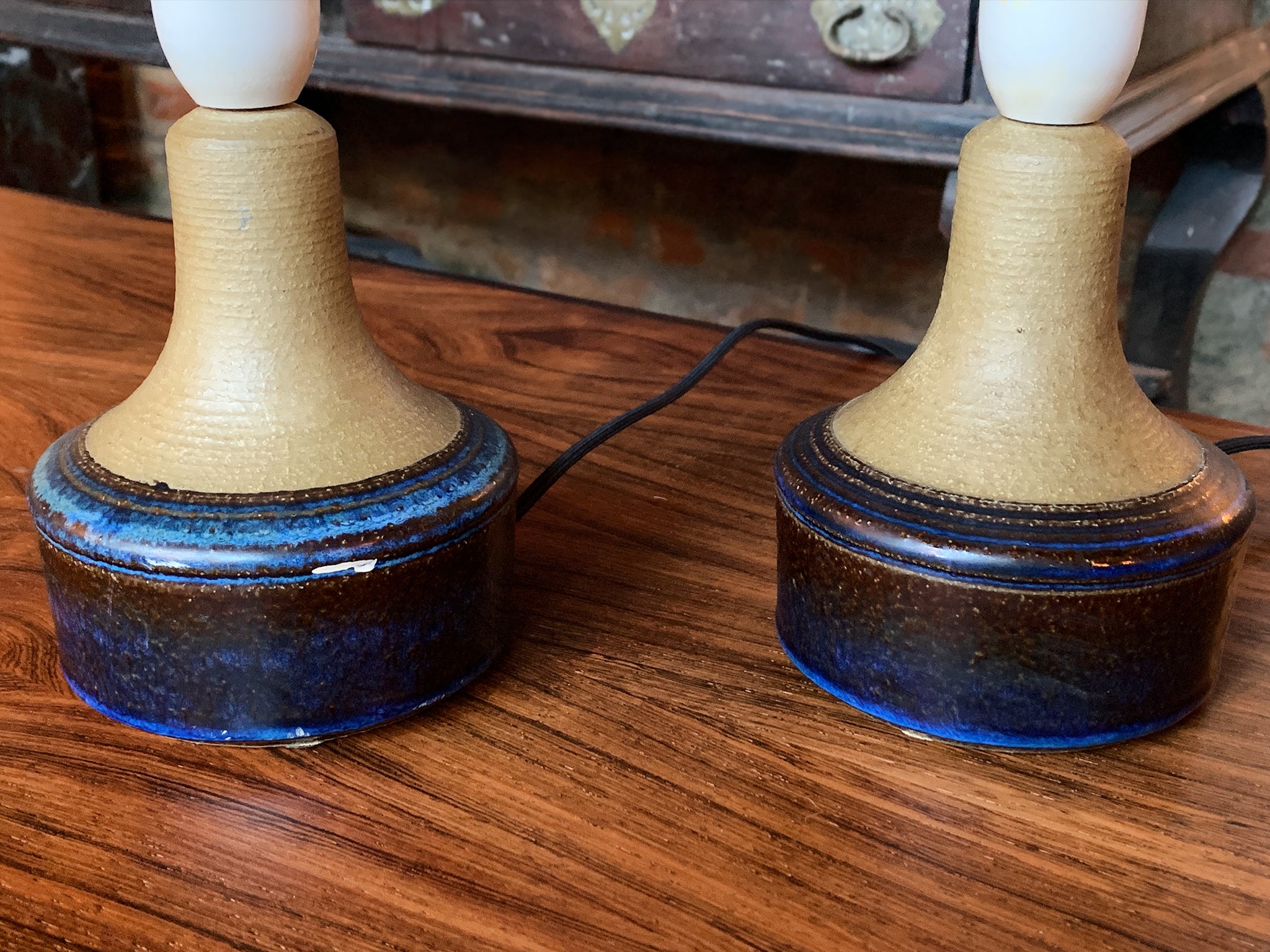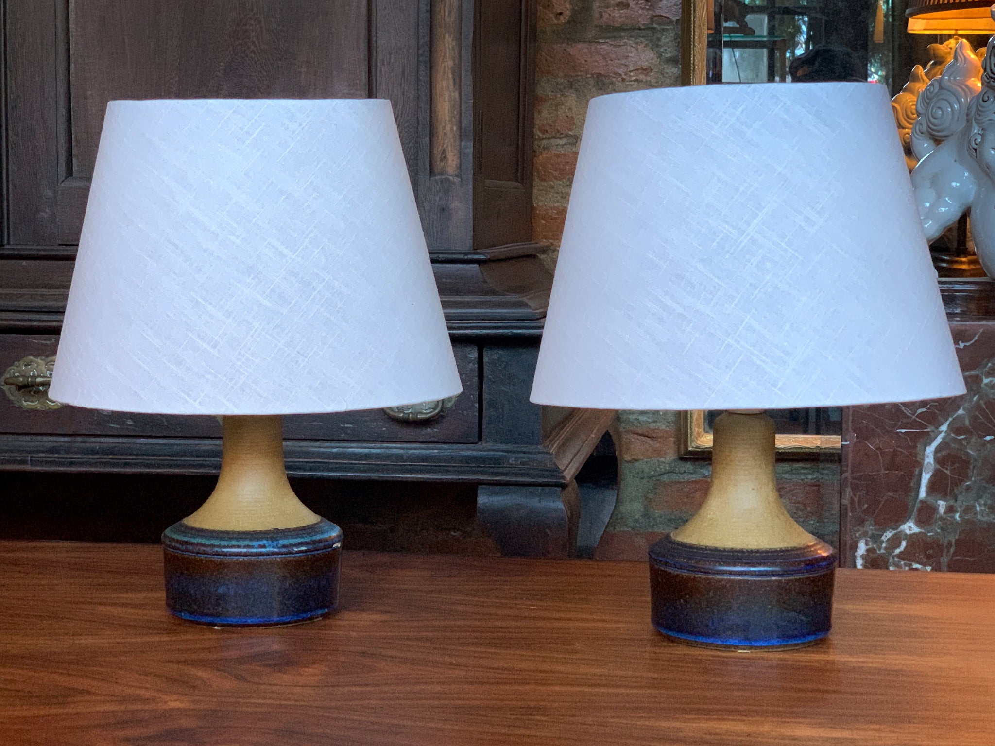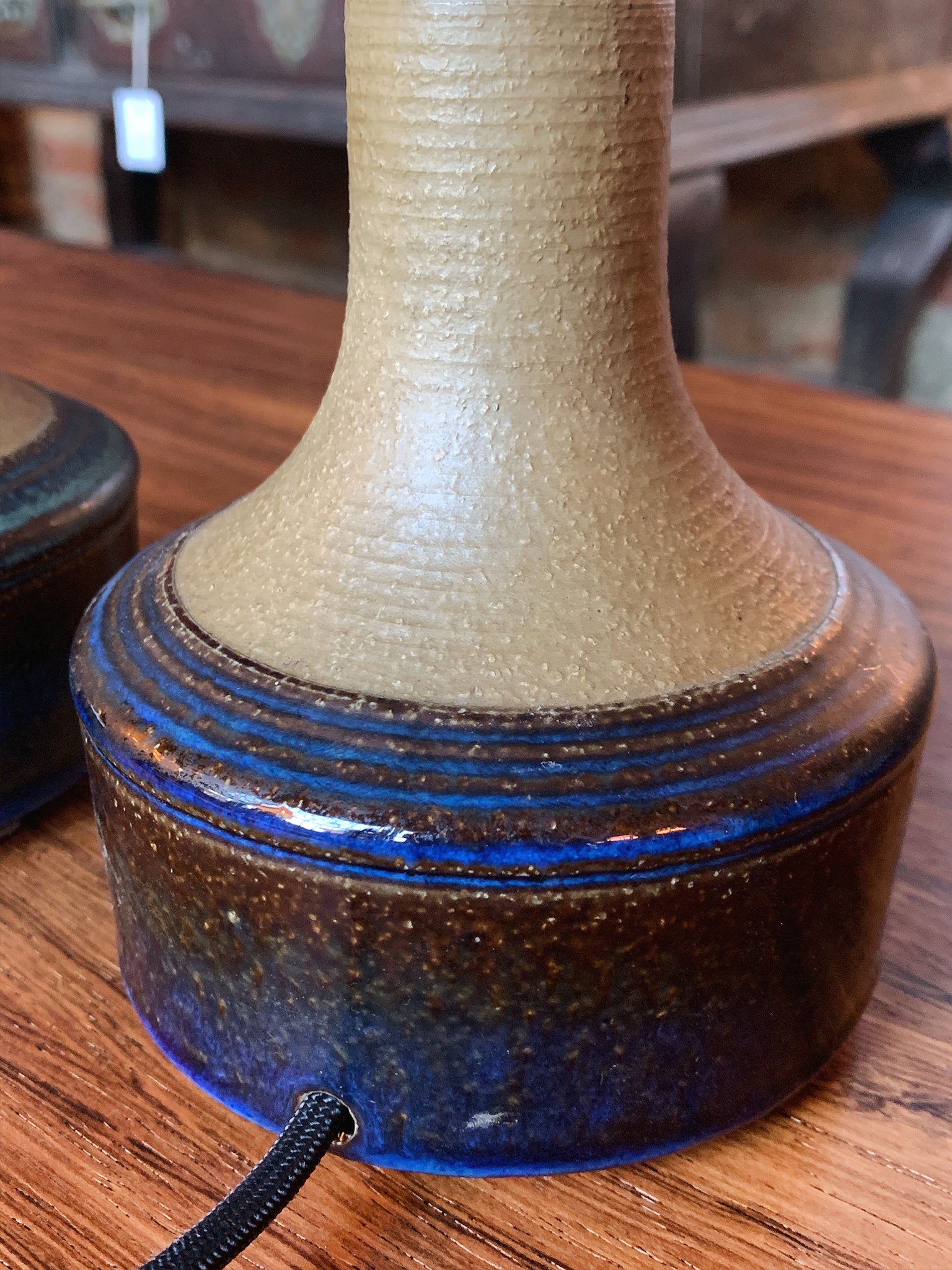 Crafted in the 1940s, these table lamps have ceramic bodies, brass hardware, and ebonized wood bases. The ceramic bodies are in an elegant urn form and have an exquisite celadon green glaze. The lamps have been newly rewired with single...