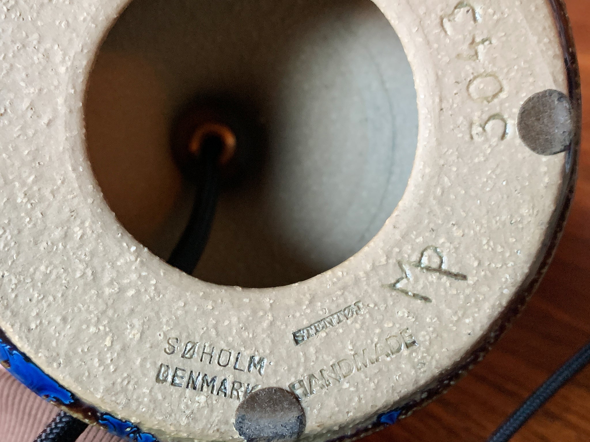 Originally made in the 1930s, this Chinese table lamp is made of a gourd-shaped ceramic vase body with brass base and brass hardware. The ceramic's distinctive purple glaze has an almost iridescent sheen that's even more stunning under the light....