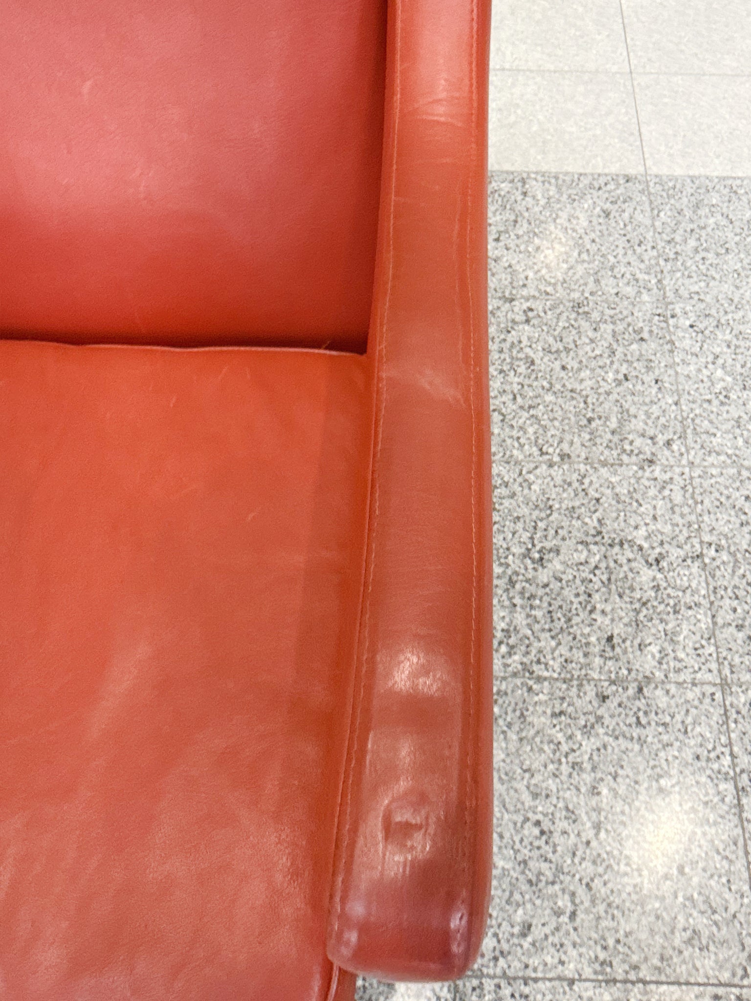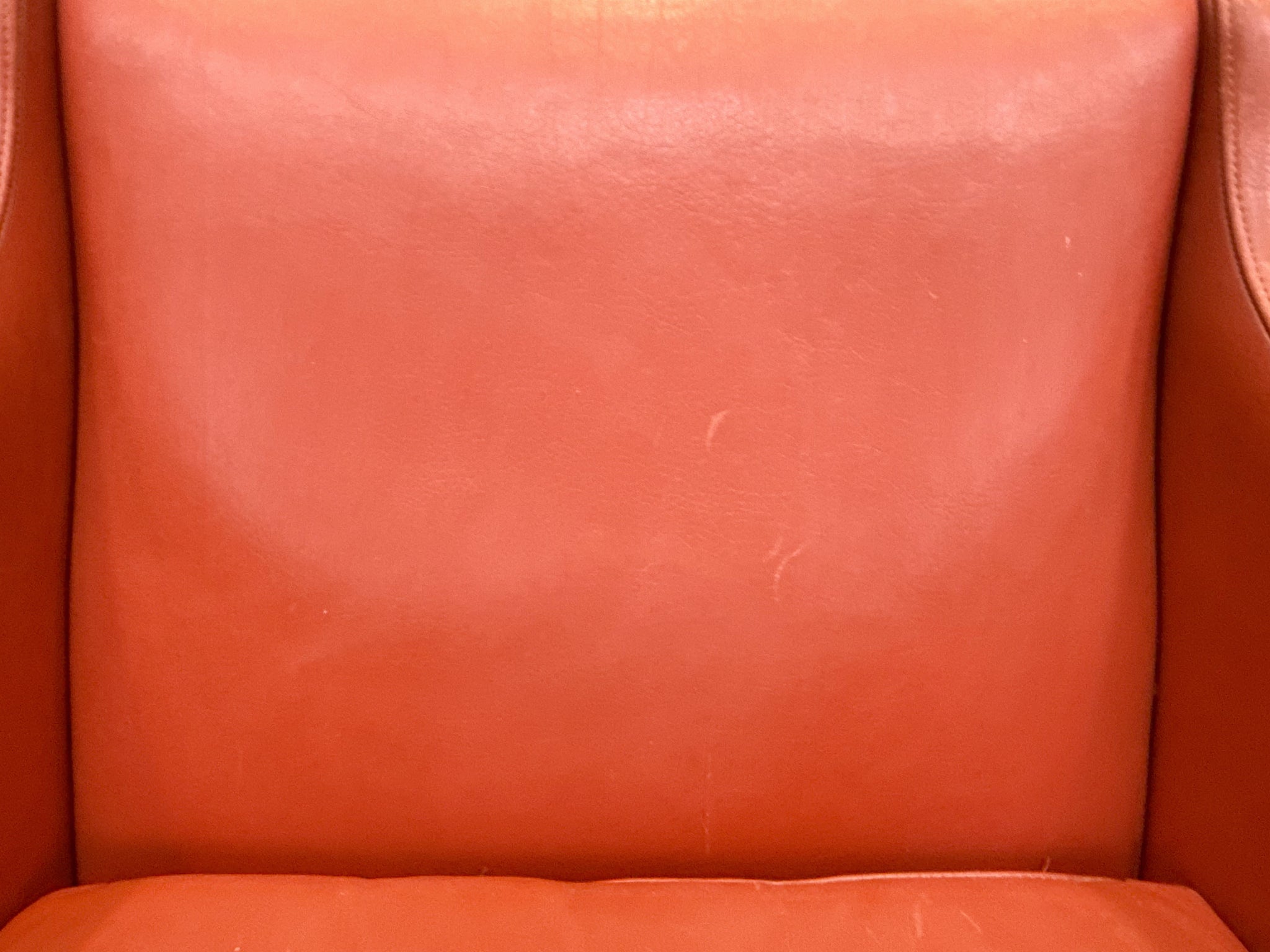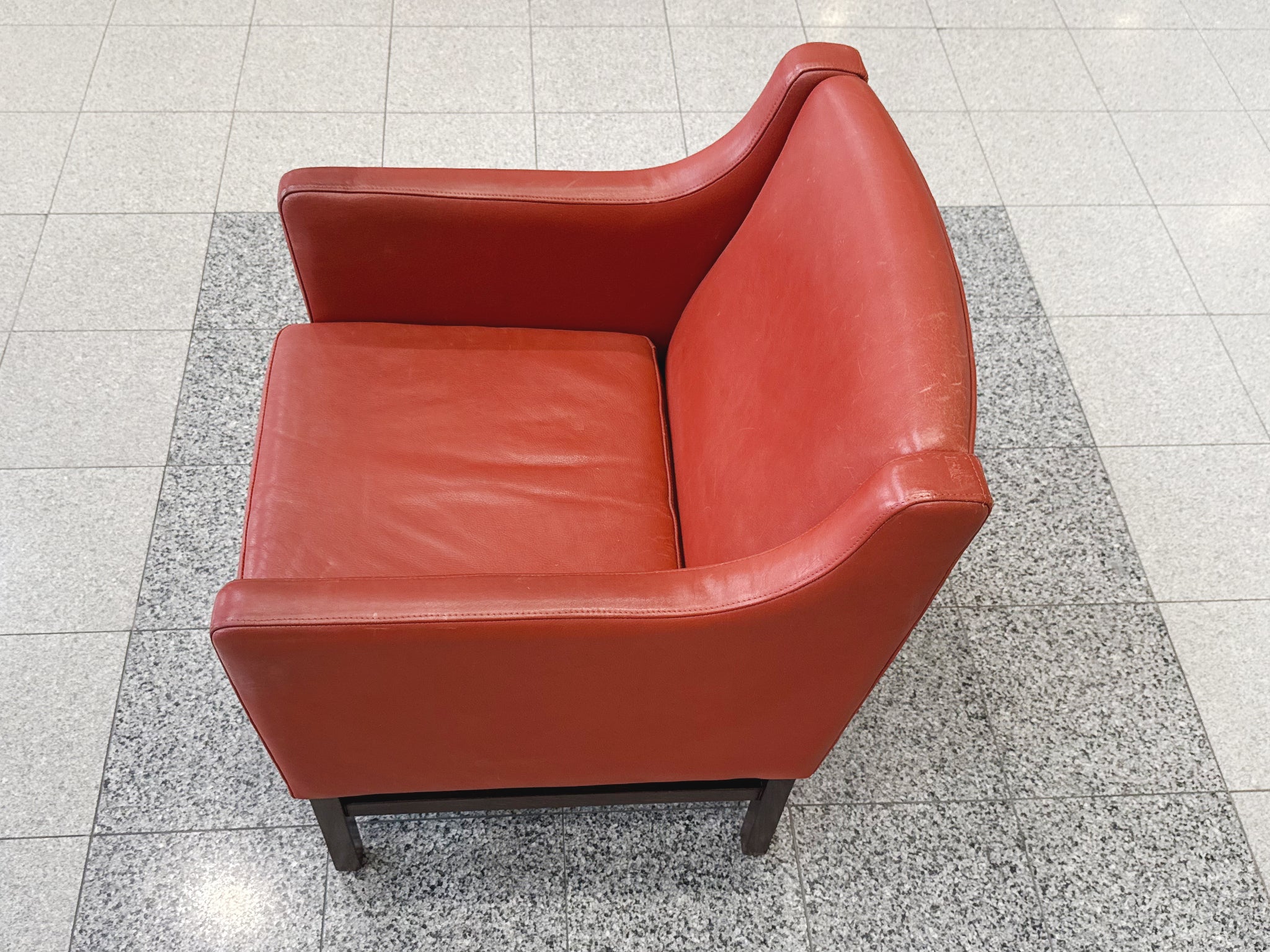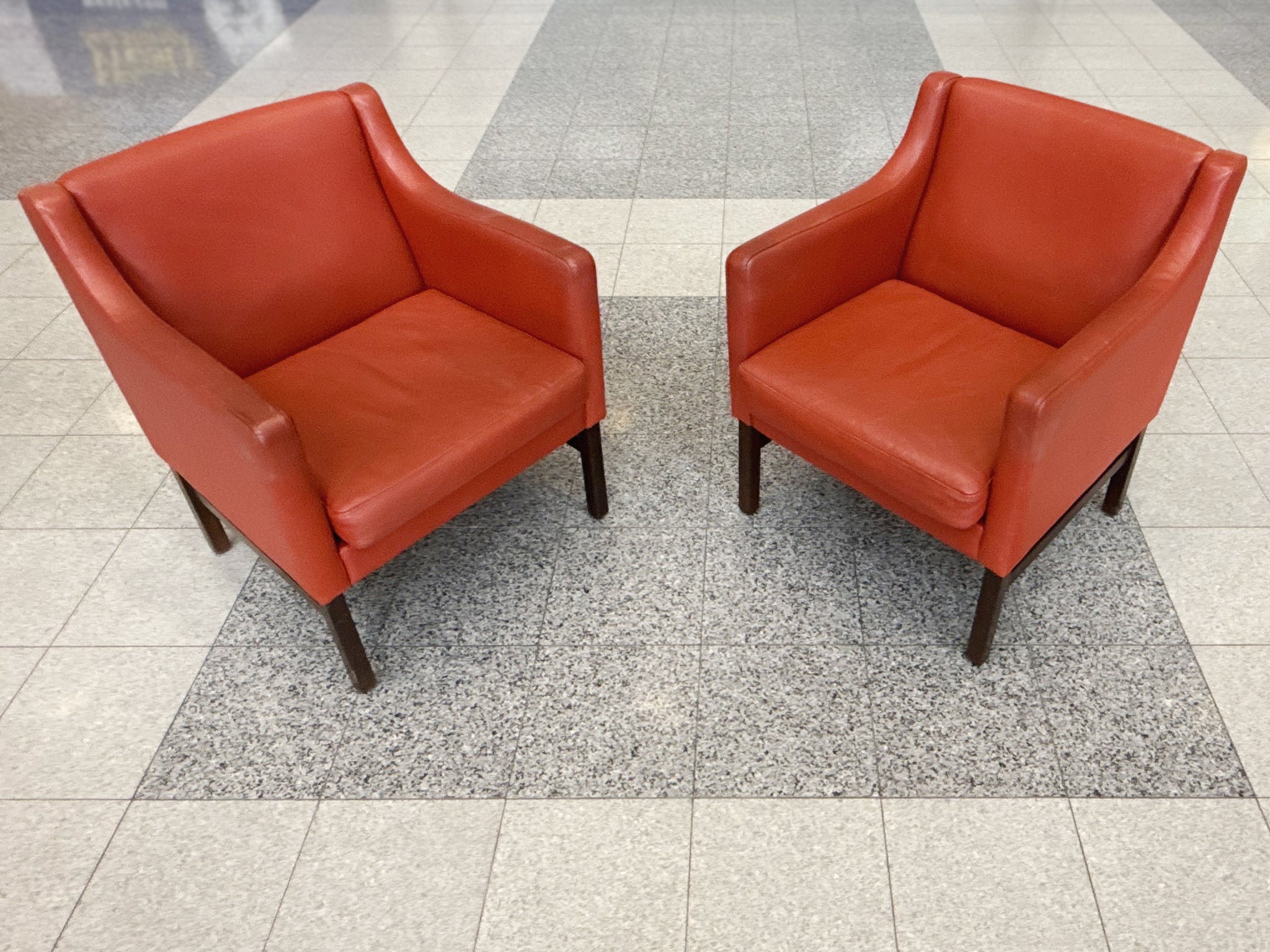 These Børge Mogensen-style lounge chairs were made in Denmark in the 1960s. They have red-orange leather upholstery and beech wood frame. Similar to Mogensen's designs, these chairs feature smooth lines that curve and soften at the corners. The stained beech legs provide a bit of height that adds a sense of lightness. A classic pair of Danish Modern furniture that will add elegance and a note of color to your home.