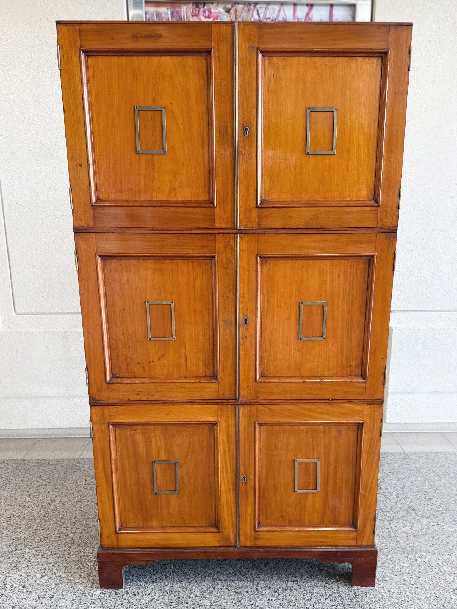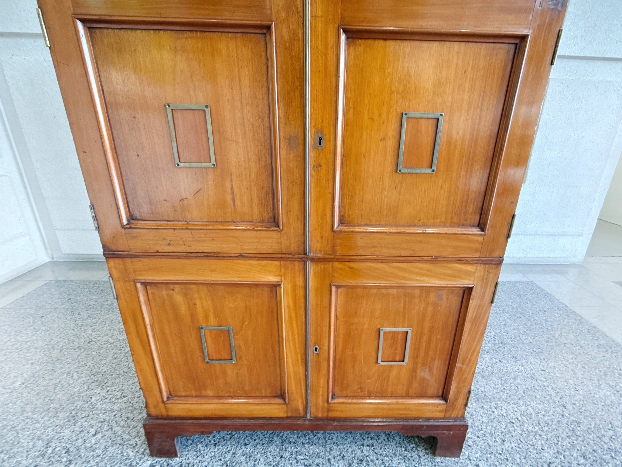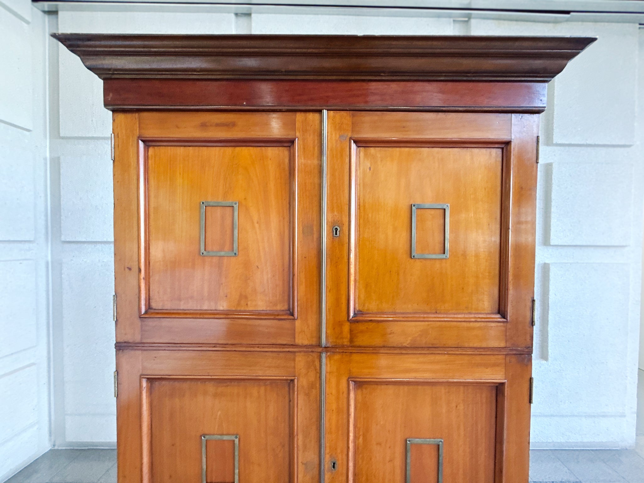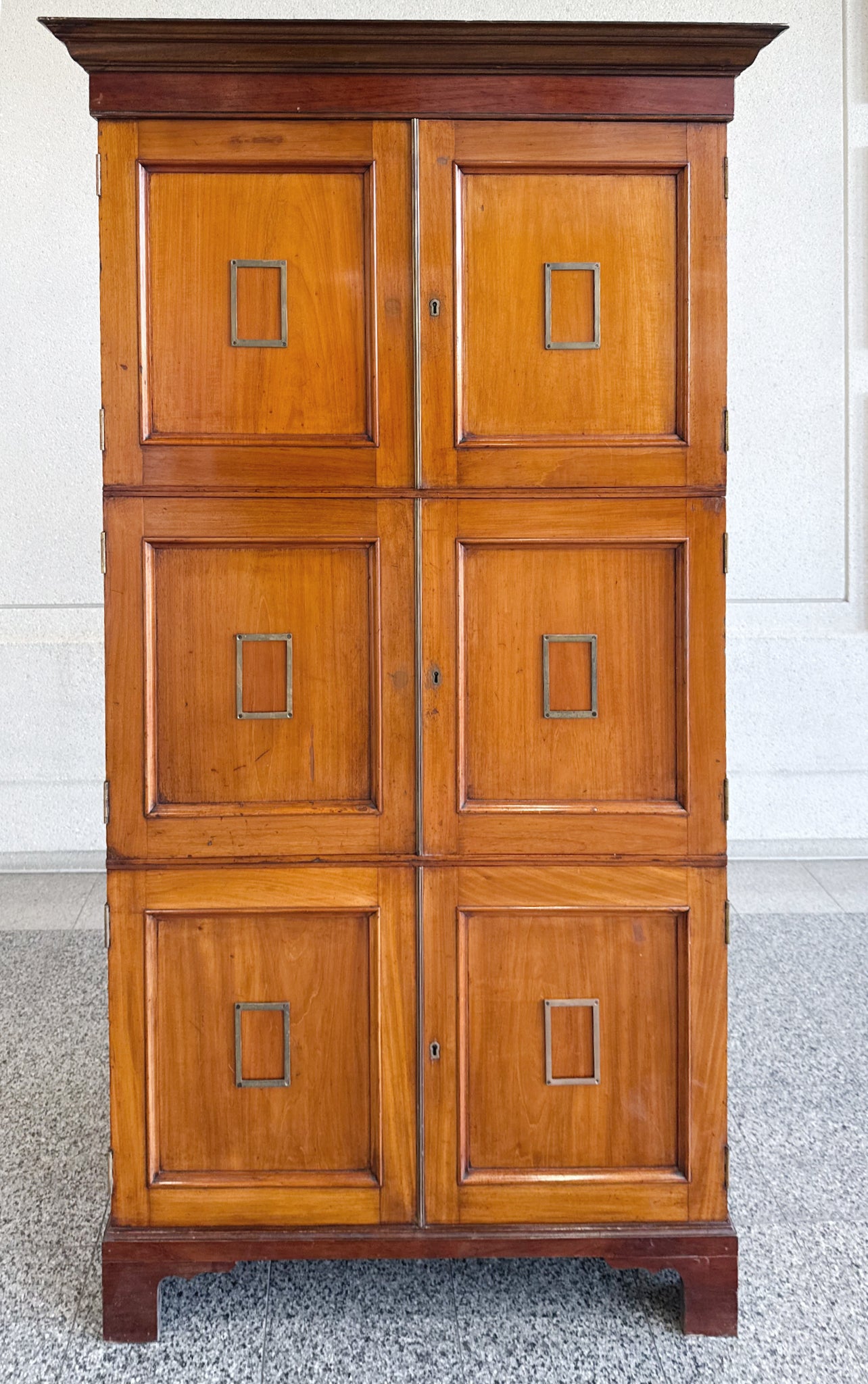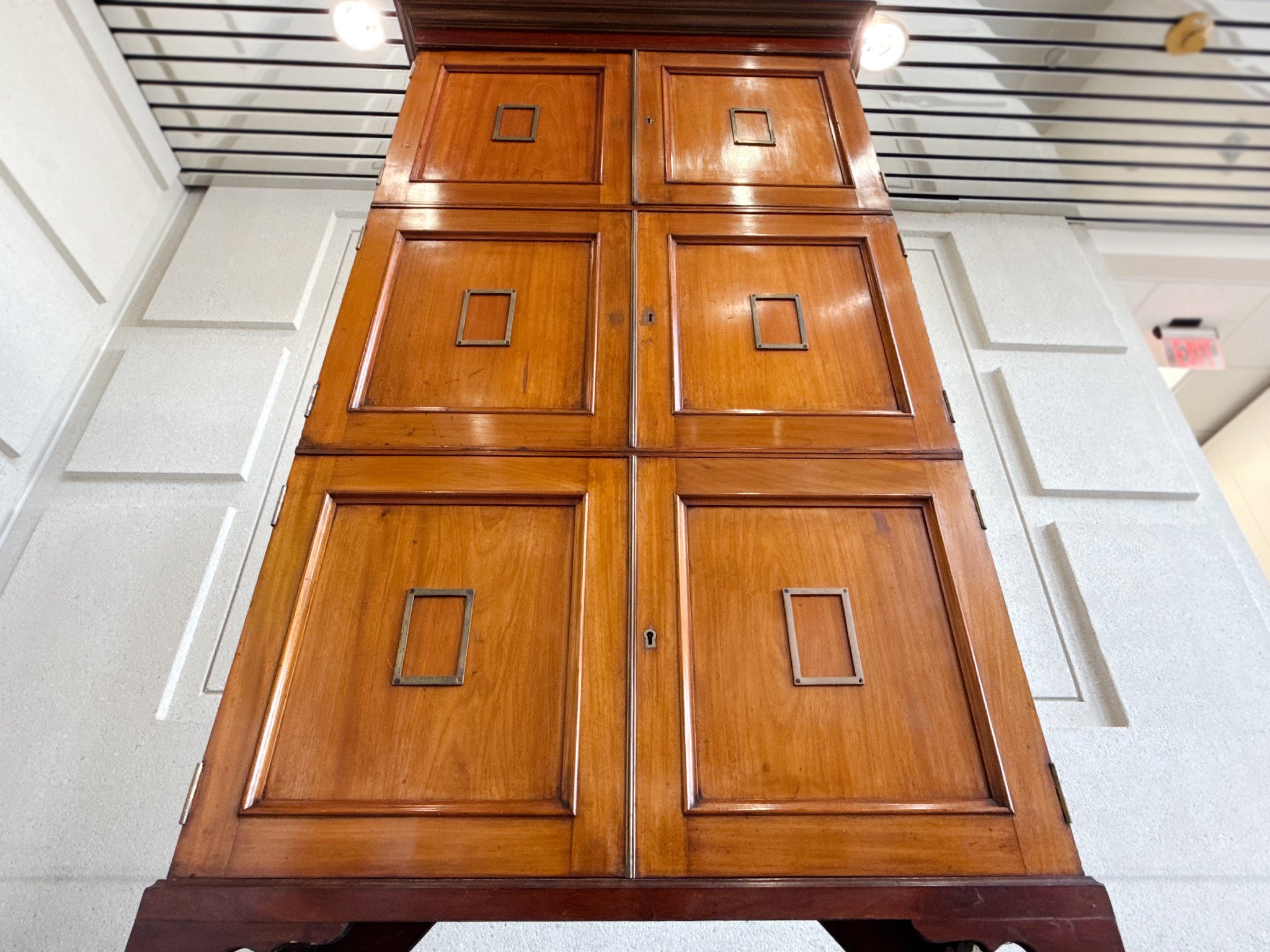 This hand-crafted Victorian mahogany cabinet was made in the Late 19th Century. Departing from more ornate designs typical of Victorian furniture, the chest is characterized by simple, straight lines. There are six doors designed with recessed facades, each trimmed with a center brass rectangle. Structurally, there are three tiers of vertical storage spaces. Each door opens to a cupboard furbished with shelves as a later modification. The mahogany wood body has aged beautifully over the years. It has a rich tan-orange hue. The cornice and base were a later addition and have a darker tone that complements the mahogany beautifully.