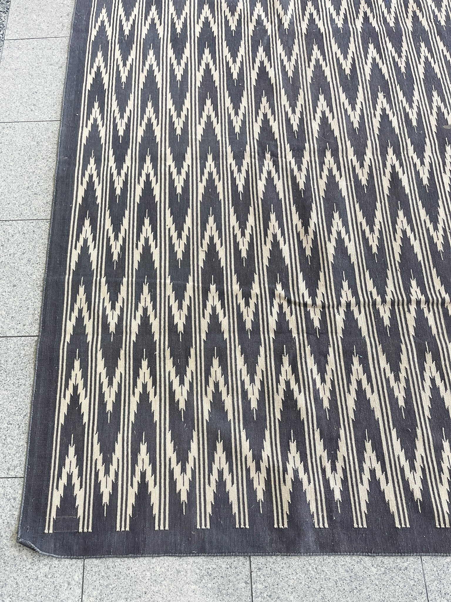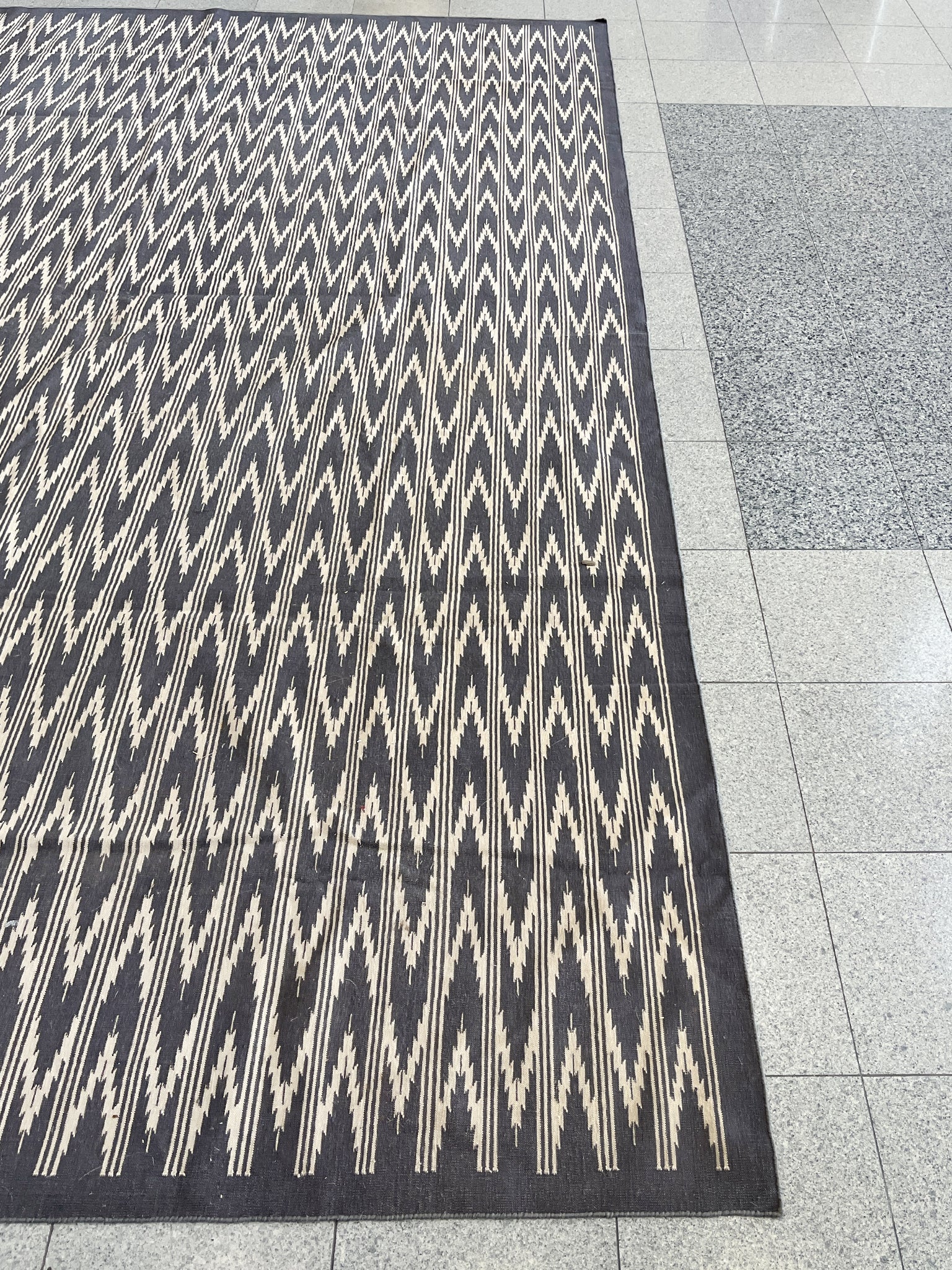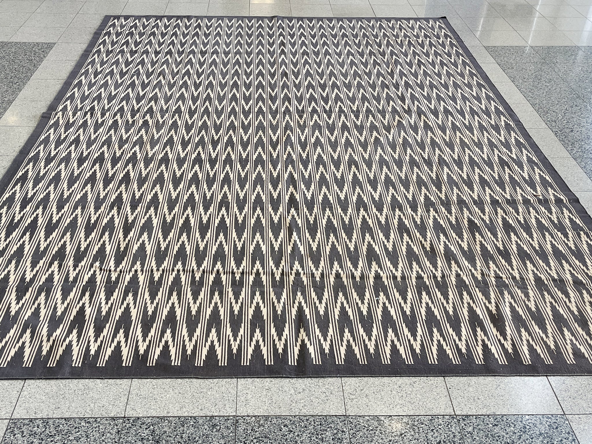 A contemporary flat-weave cotton rug by textile designer Madeline Weinrib, part of her Amagansett collection. Handwoven in India, the rug features a jagged pattern resembling an ikat design from a distance, with a palette of graphite gray and ecru white.