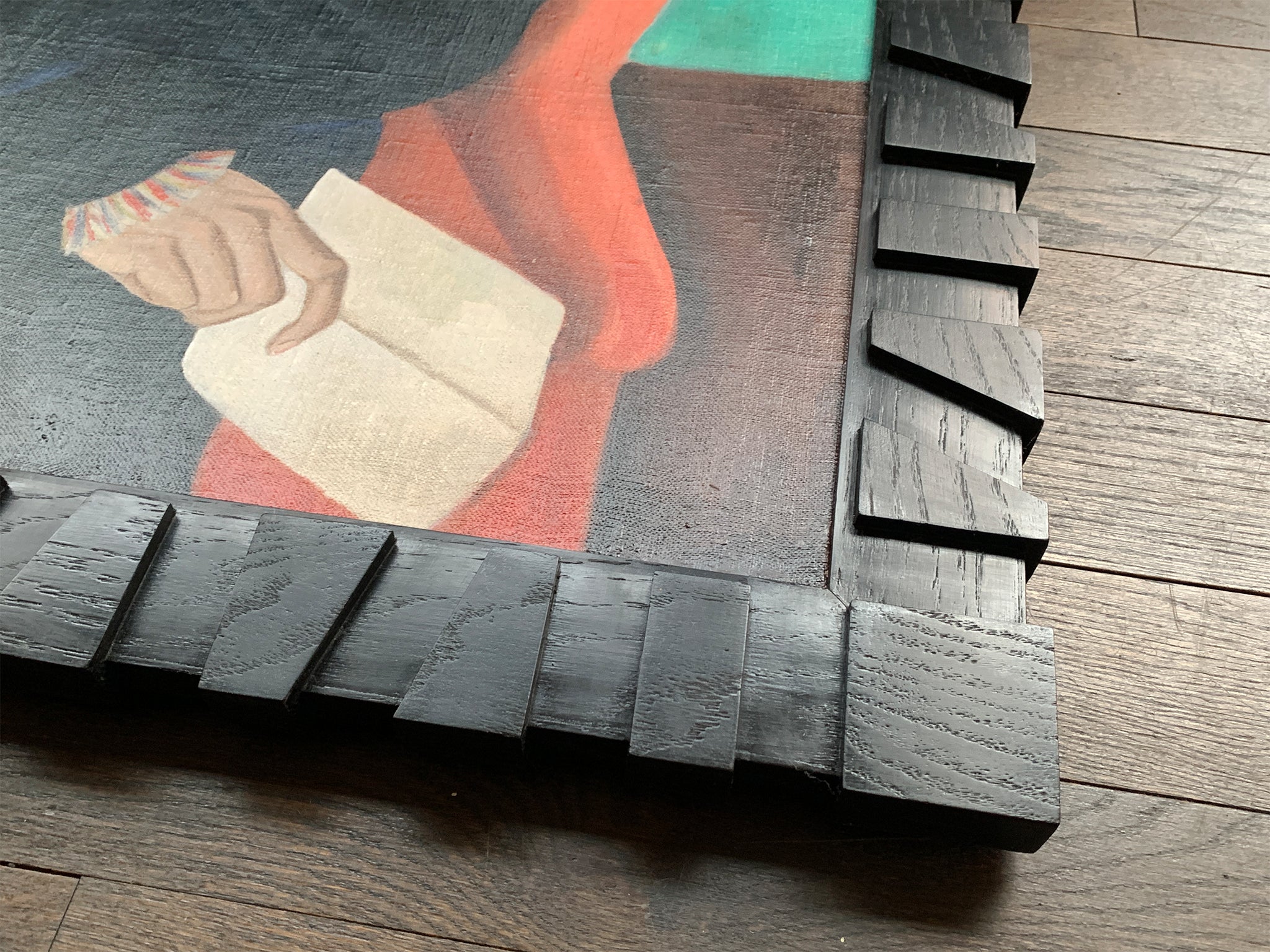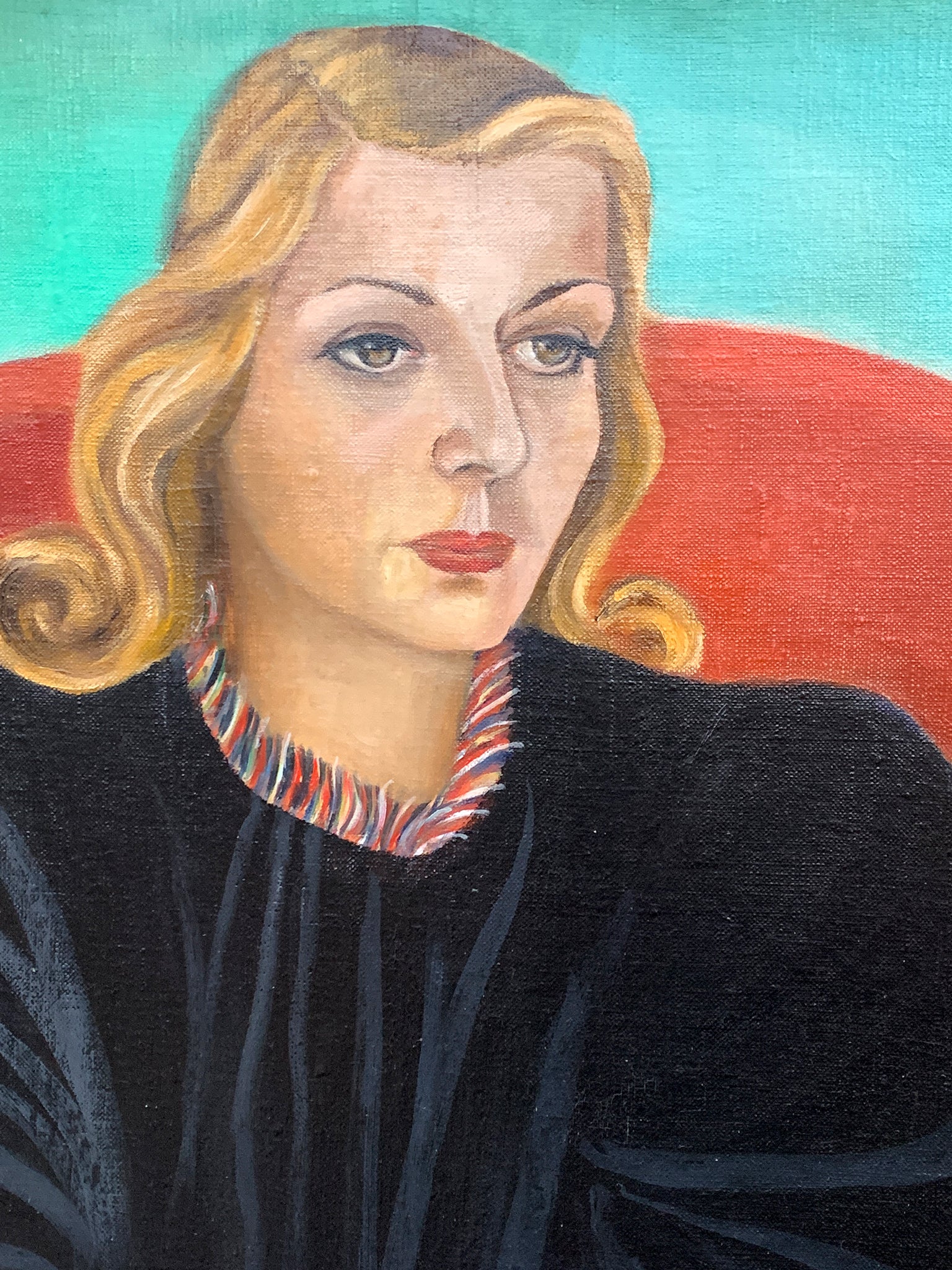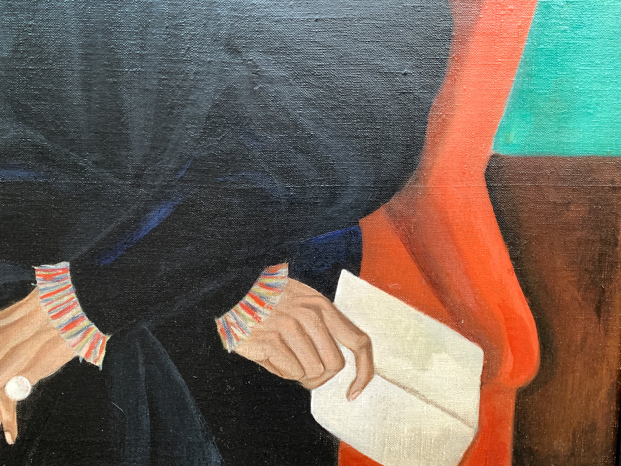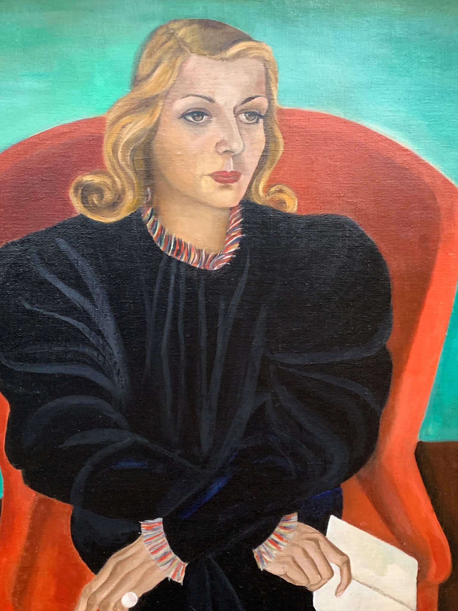 "Parrot Chair" - a seemingly quiet oil-on-canvas painting made in 1967 by the American artist Jennett Lam (1911-1985). Muted browns, grays, and beiges contrast with more saturated greens and teals. Lam has placed the chair at center; we can think...