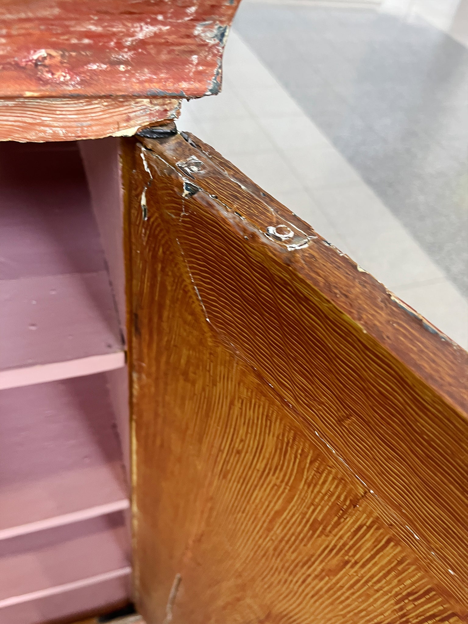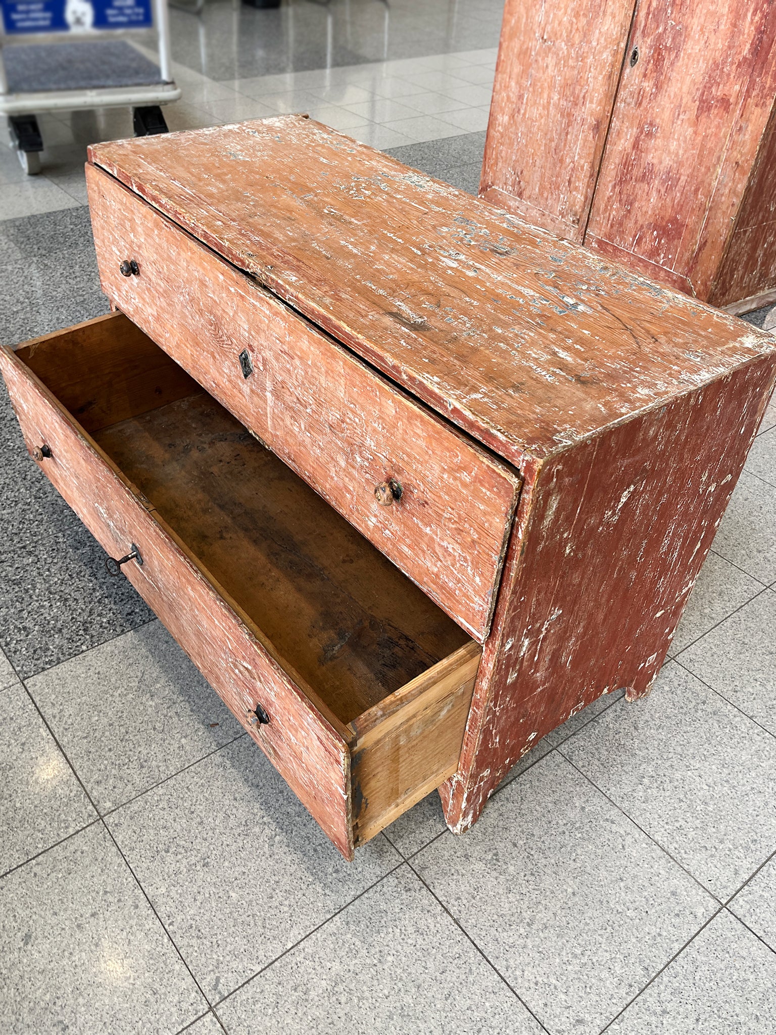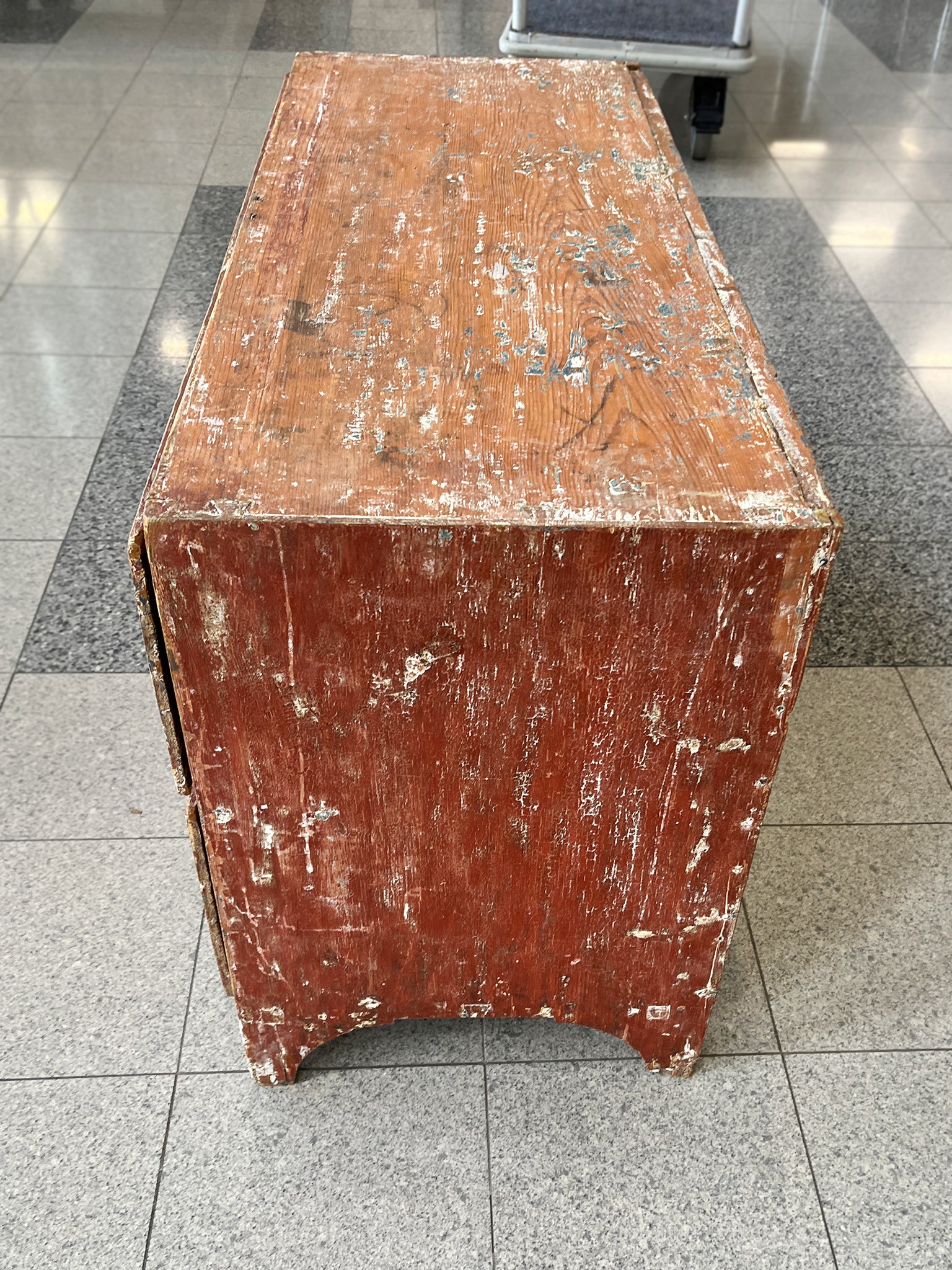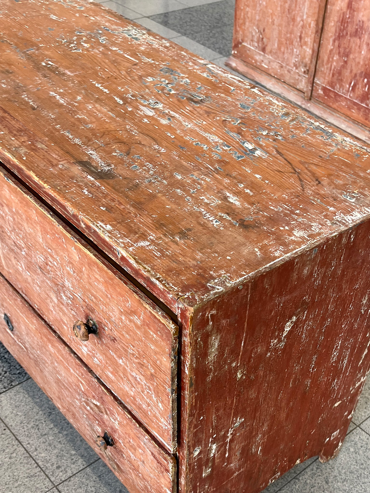 This small, antique campaign chest was handcrafted in the early 20th Century. It is mahogany wood, which has aged well over the decades and has a warm red-brown tone. The two full-length drawers have recessed brass bail pulls. And the...