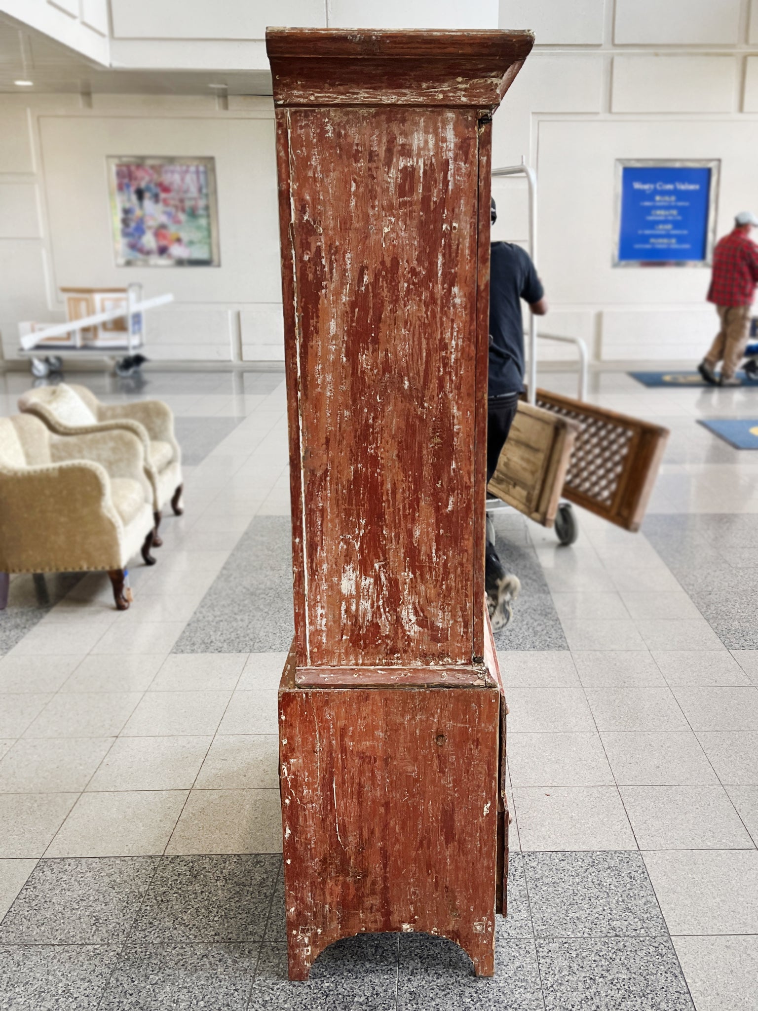 Handcrafted in the 18th Century, this newly restored George II chest-on-chest is mahogany. The top portion consists of two small drawers atop three full-length drawers, while the bottom portion has three full-length drawers. Each drawer is equipped with brass bail...